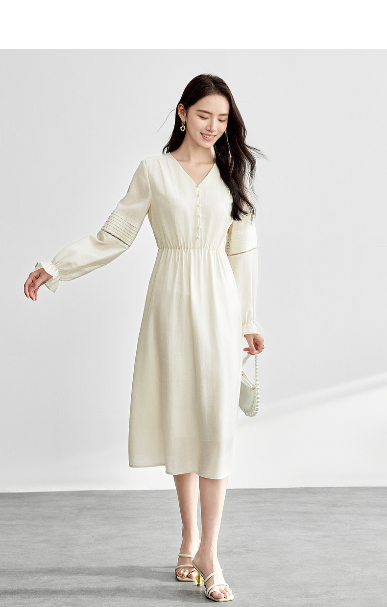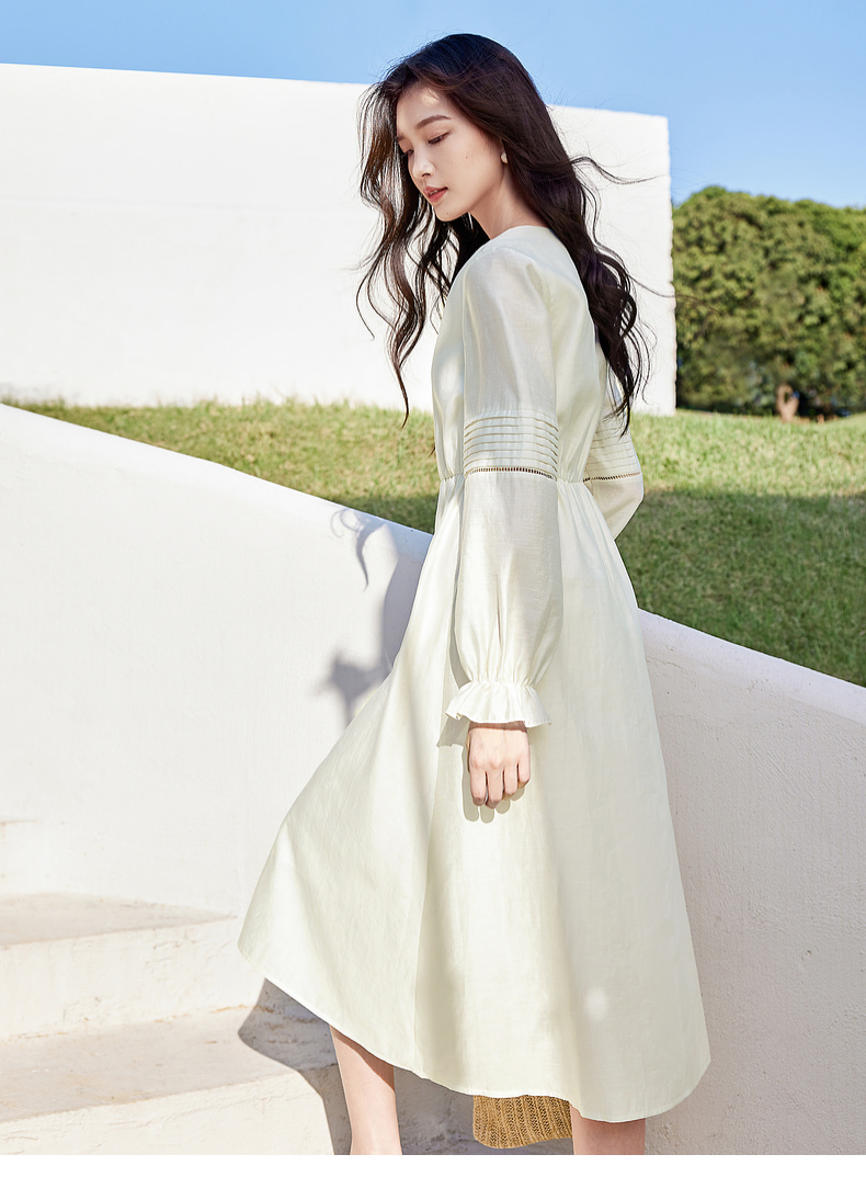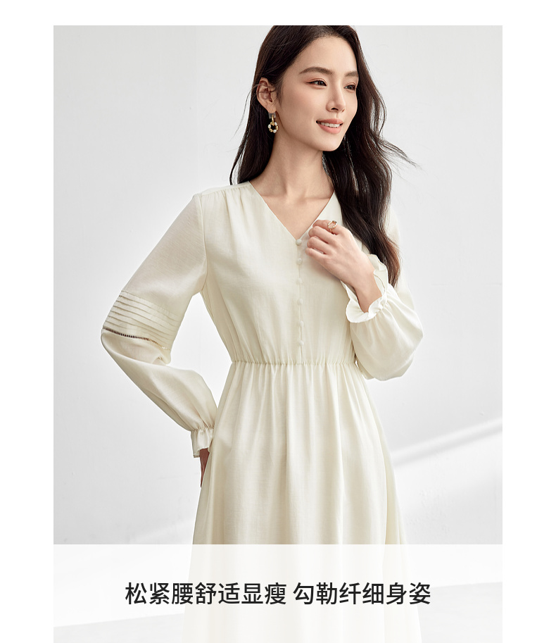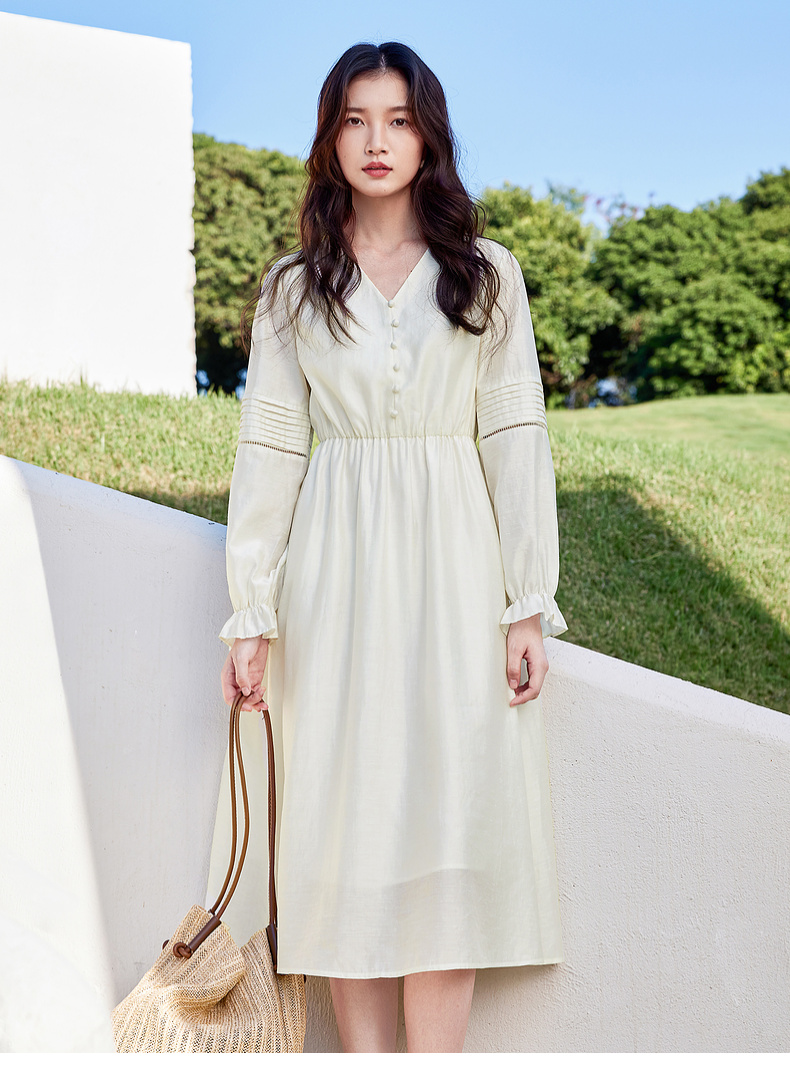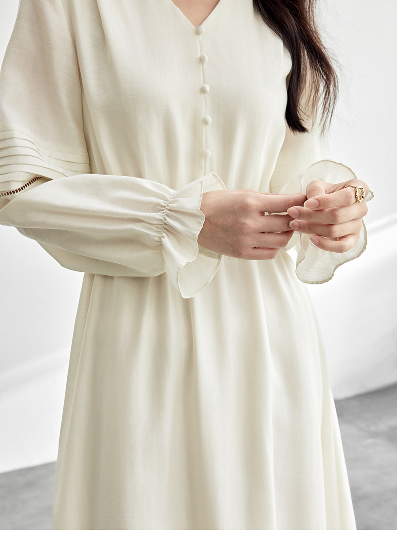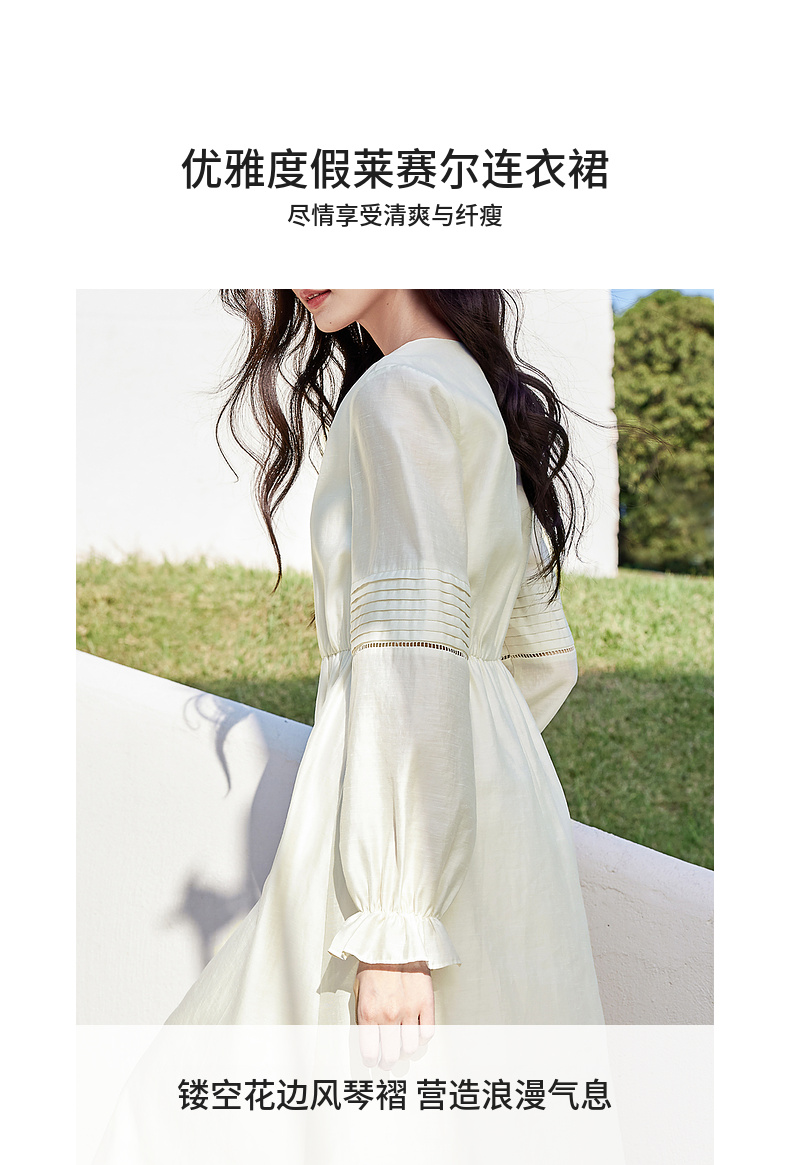 【内购】优雅浪漫度假V领镂空荷叶袖口松紧腰A字连衣裙-151L58248
