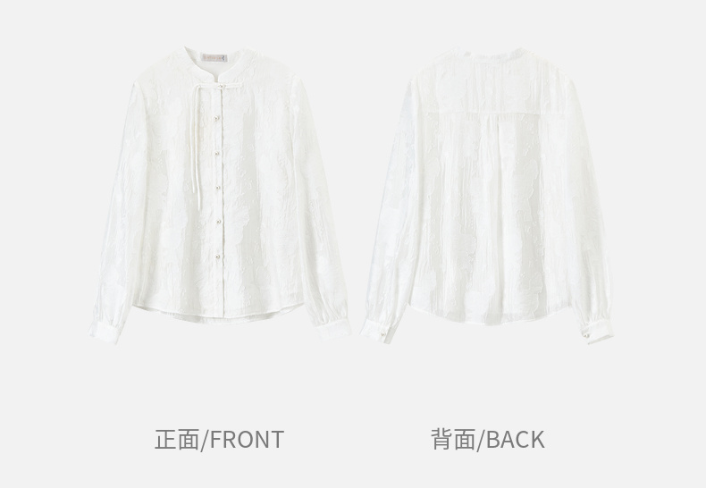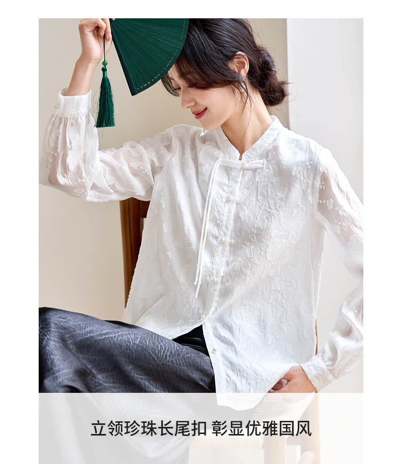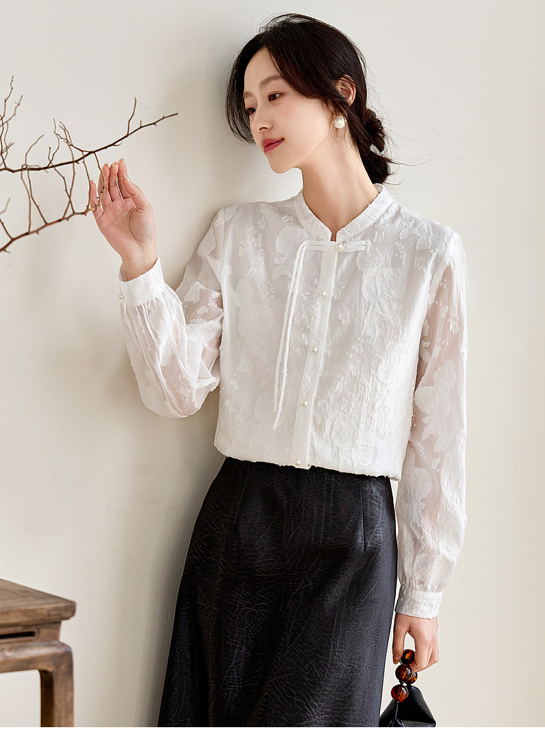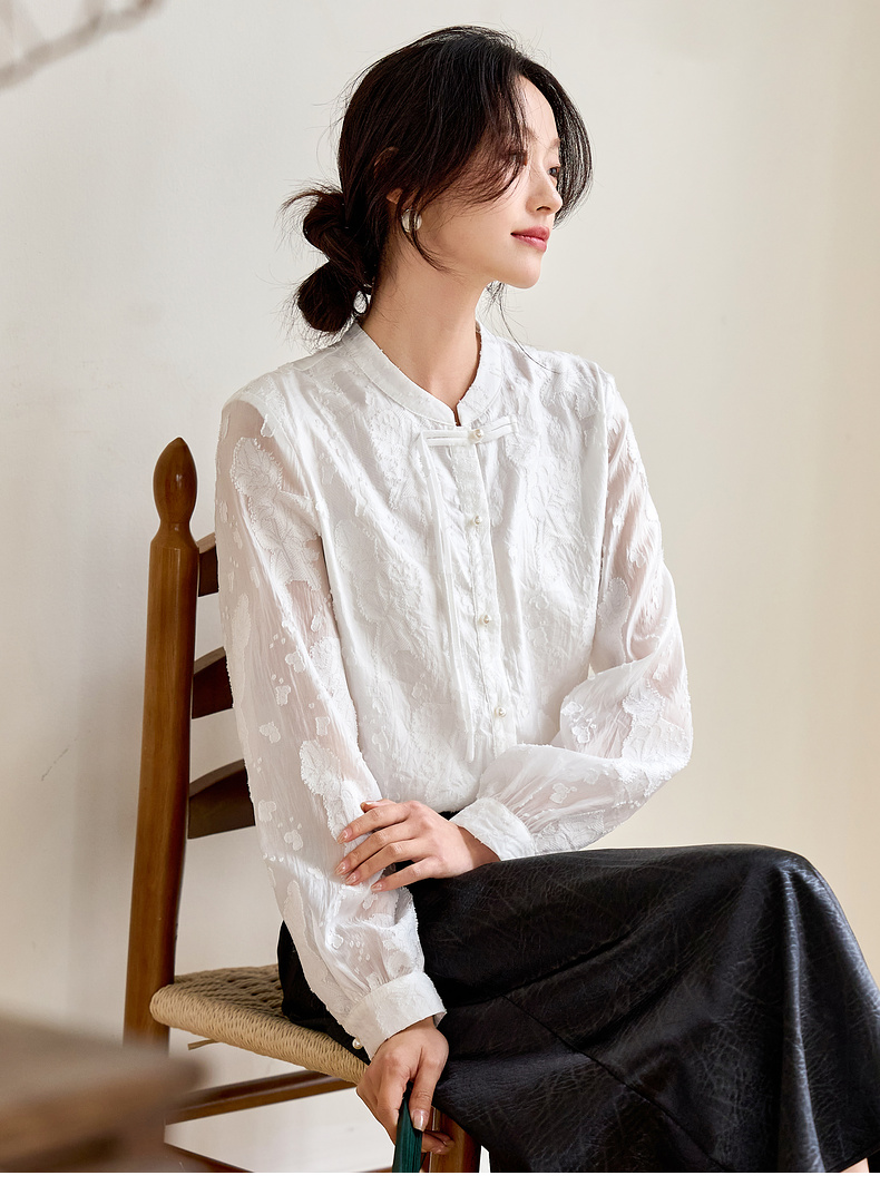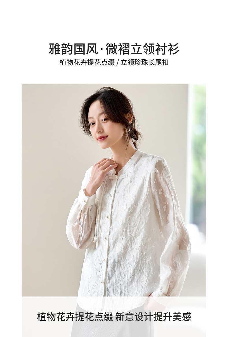 【内购】【国风衬衫】优雅立领珍珠长尾扣植物花卉提花肌理感微透薄衬衫-151C57835