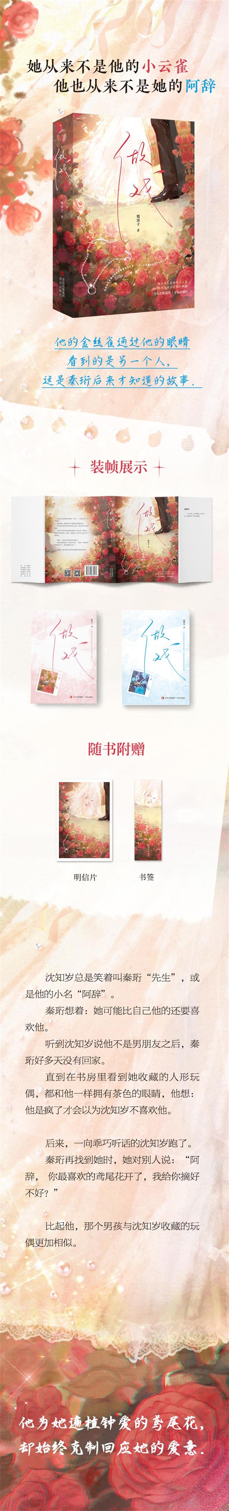 1.他的金丝雀通过他的眼睛看到的是另一个人,这是秦珩后来才知道的故事。 2.女主从乖巧到清醒独立,男主从冷情到卑微追妻,包含替身梗、追妻火葬场、身份反转等,甜虐交织。 3.经典男替身文学 4.耳畔缱绻之间,女孩纤细手指轻抚上男人眉间,她说:“阿辞,你的眼睛真好看。” 阿辞,那个男人的小名也叫阿辞。 5.随书附赠精美书签、明信片。