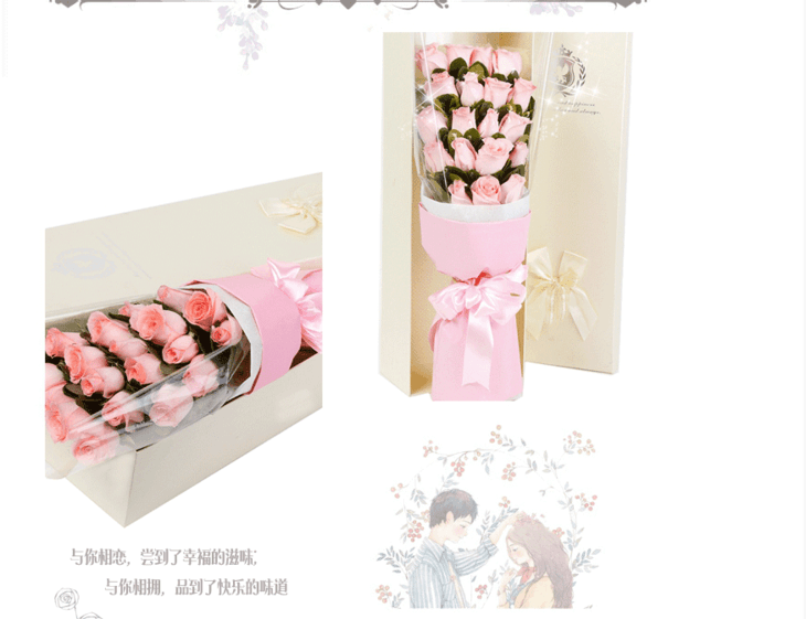 包装:透明包装纸,白色棉纸,粉色书面纸单面包 装,系粉色蝴蝶结。精美礼盒(礼盒样式实