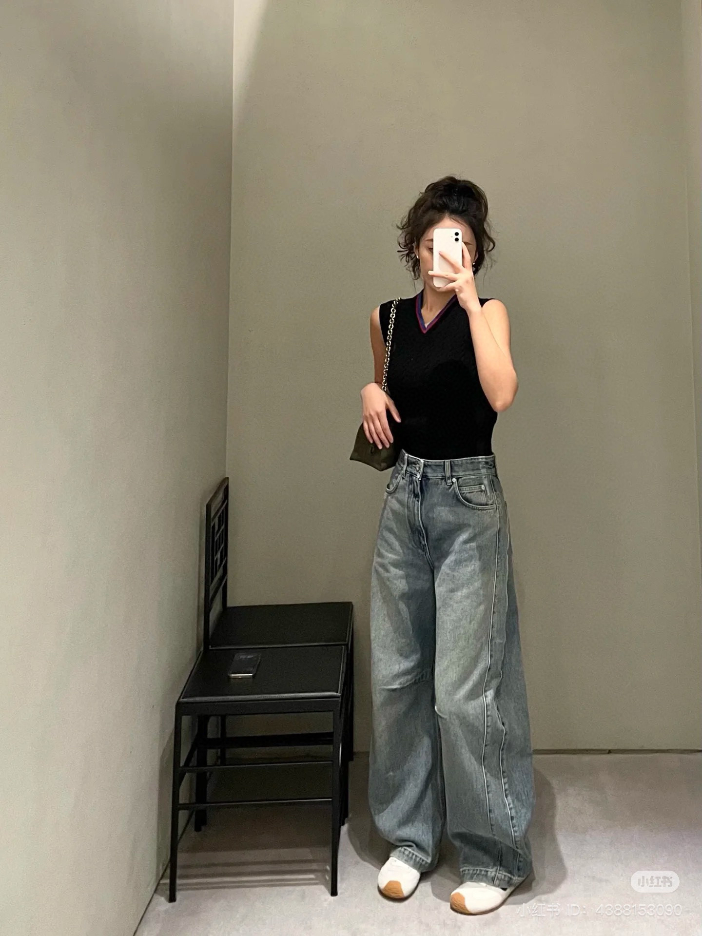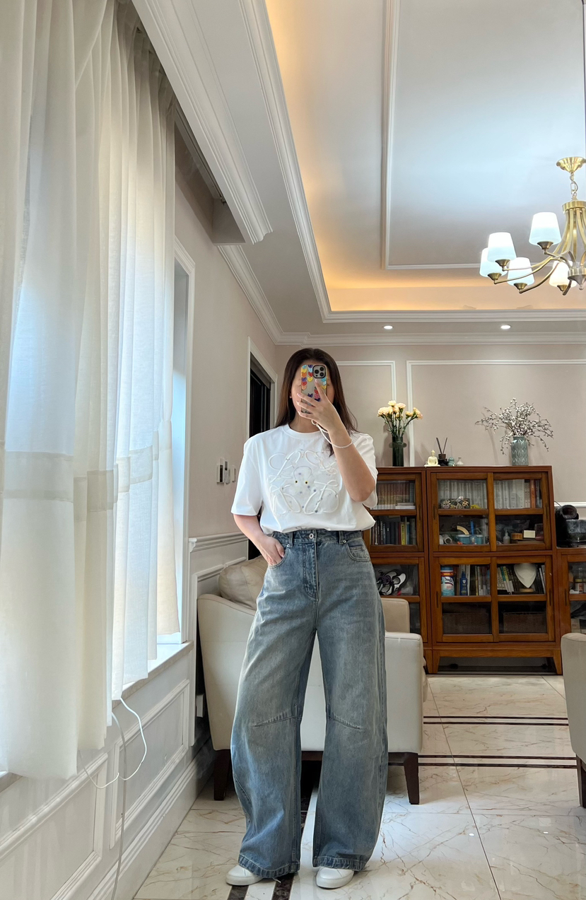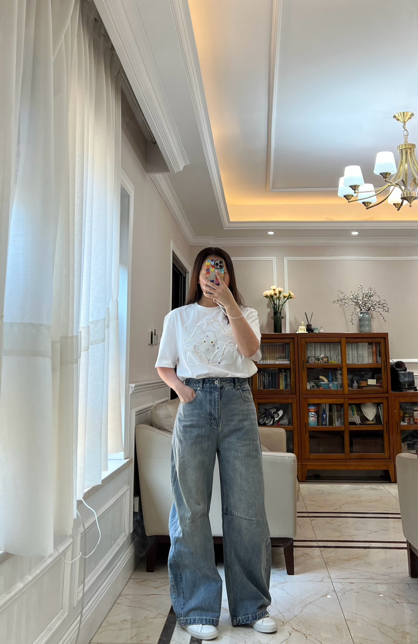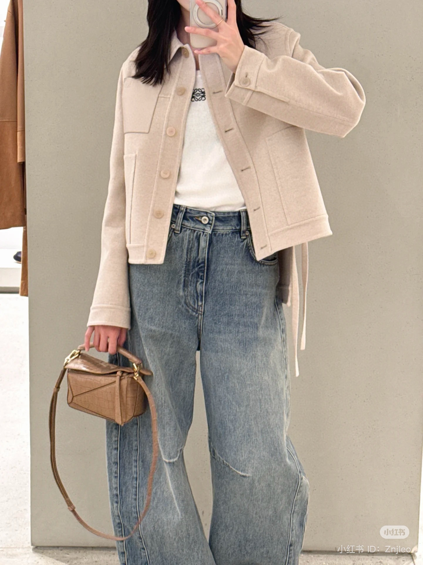 浅色是略微挺括的材质,藏青色是略微软糯的材质,浅牛仔需要多次水洗➕环烘,工艺更为复杂一些,留下来的肌理感也更为强烈,仔细看水洗自然舒展~~~相当时髦