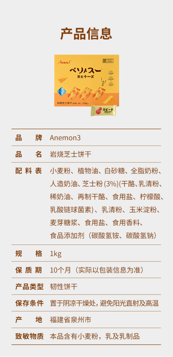 【 Anemon3爱你们 岩烧芝士饼干】 芝士含量≧3%,岩烧带来的酥脆干,融入芝士的醇厚香味,入口浓郁酥脆香 当早餐或者下午茶很合适。 追剧时来几包也很不错。 家里必备的小零食,好吃的根本停不下来