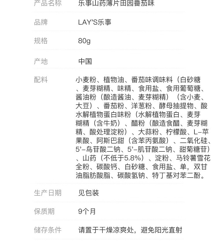 乐事山药薄片田园番茄味80G/袋