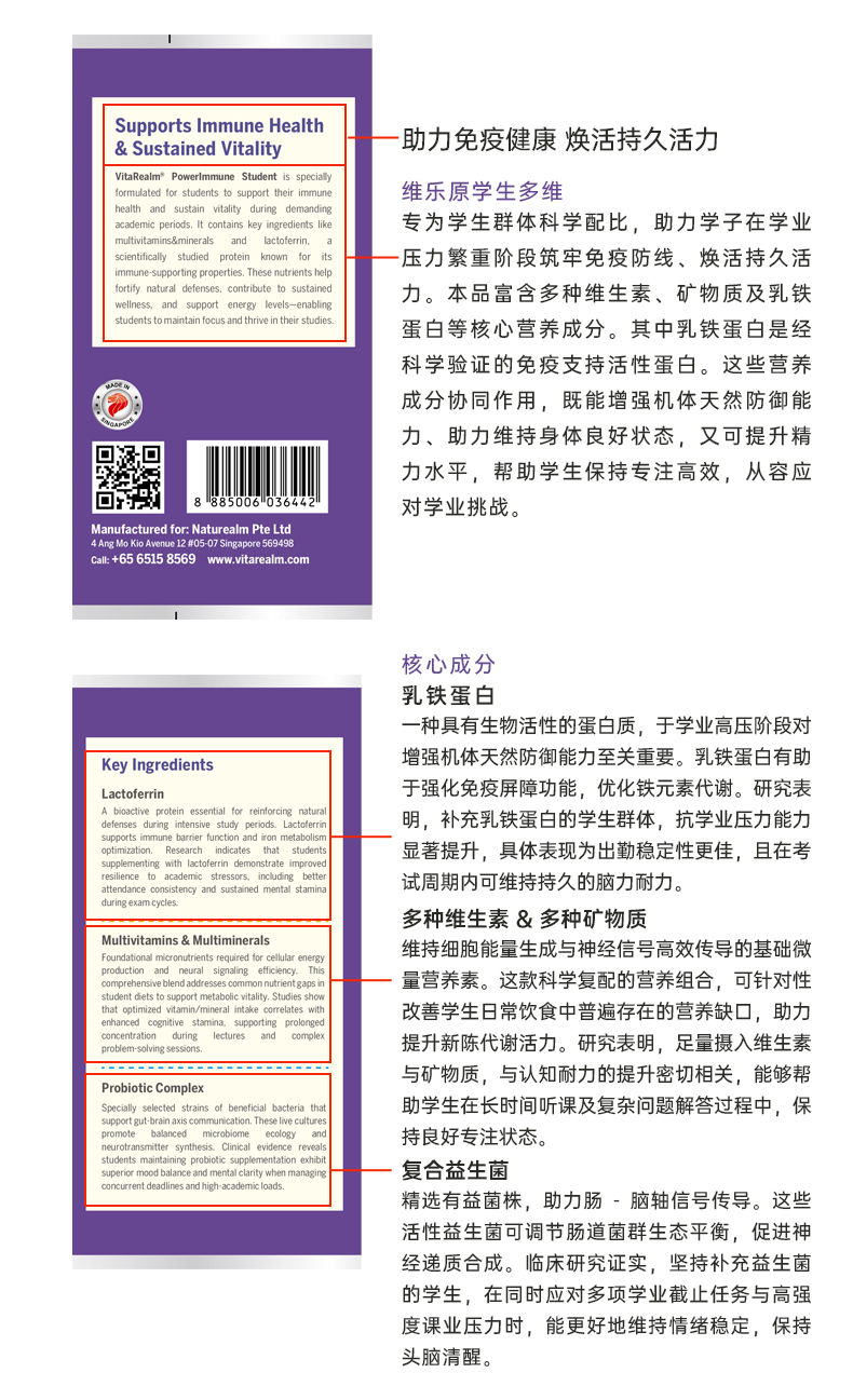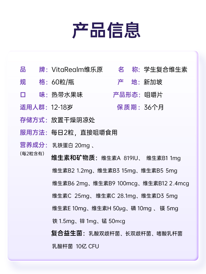 VitaRealm维乐原青少年学生复合维生素乳铁蛋白咀嚼片sy