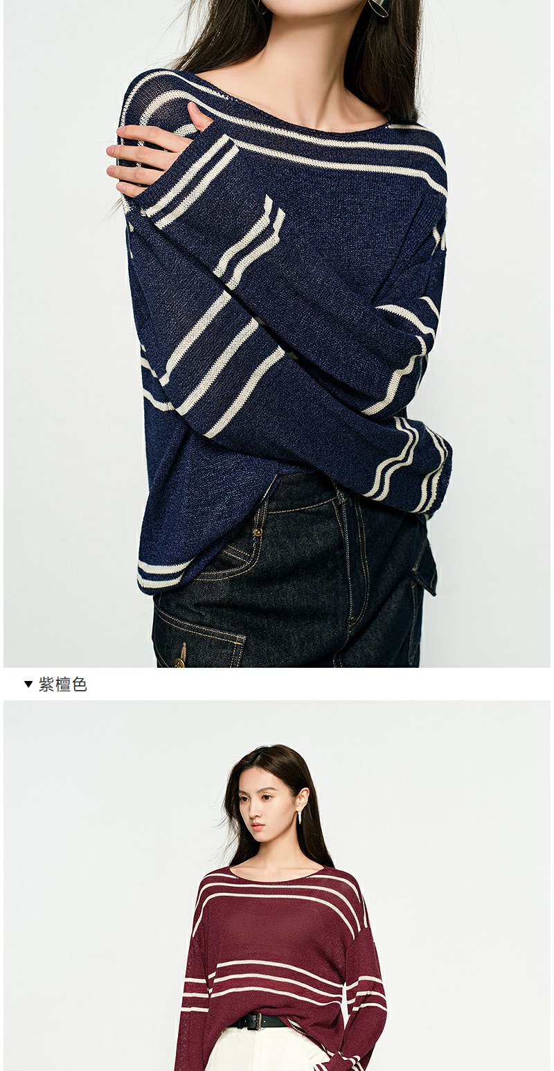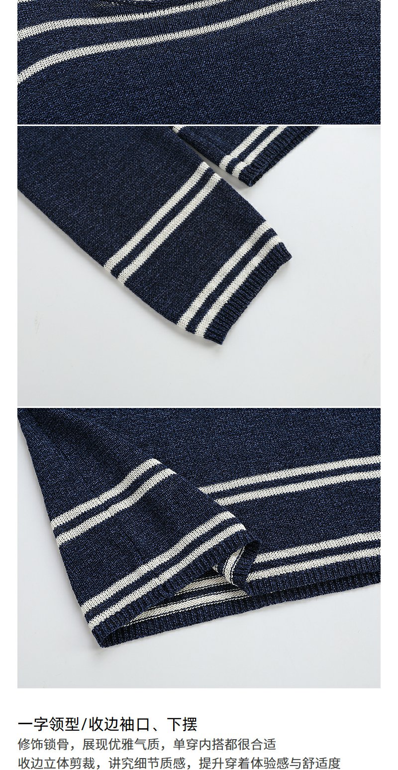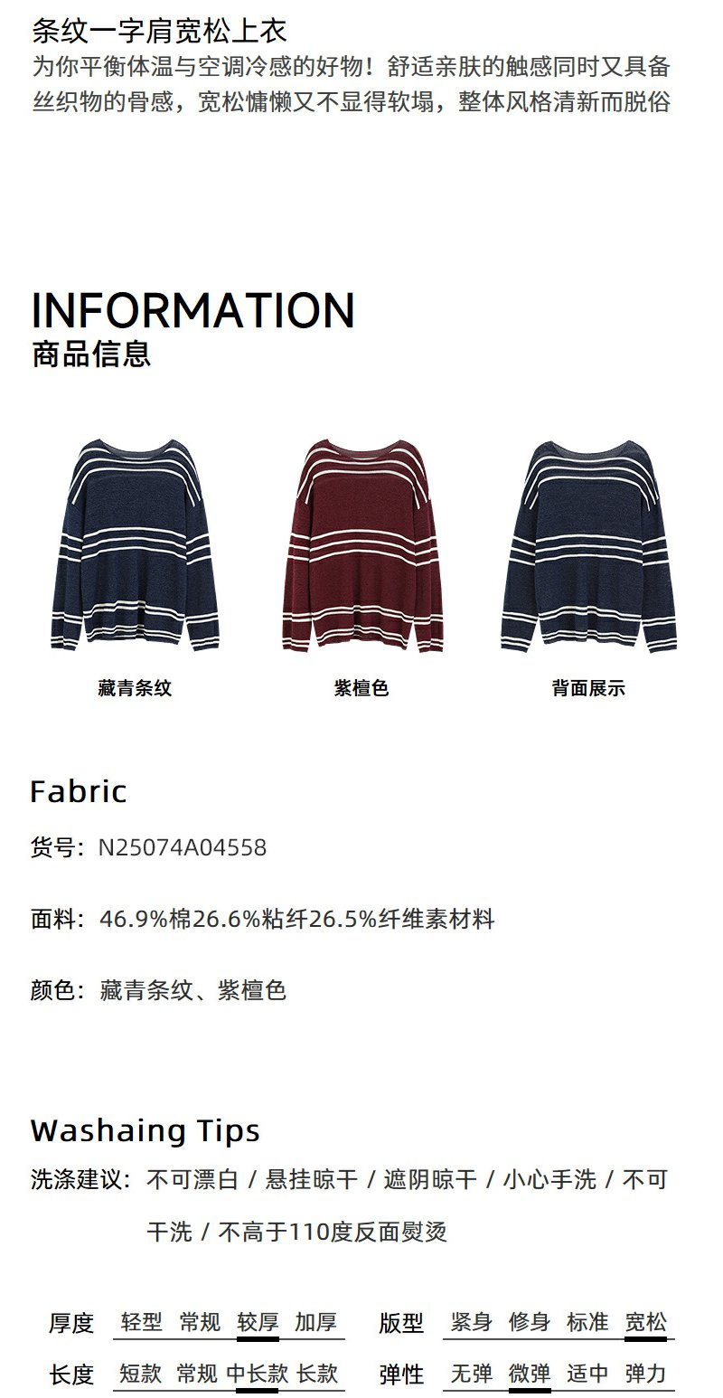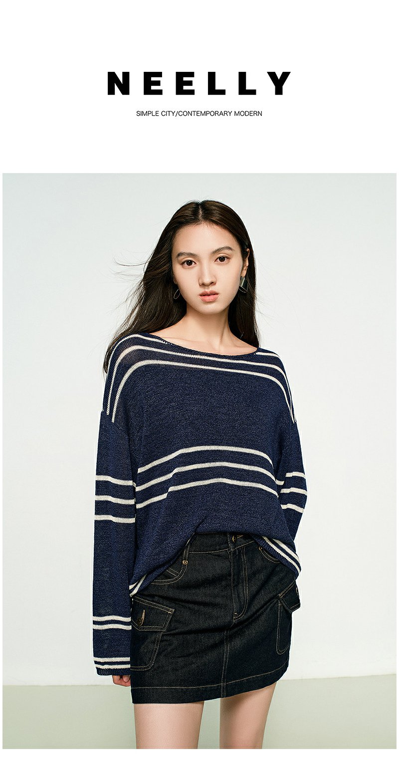 NEELLY纳俪商场同款春季新款条纹一字肩针织衫女圆领显白修身毛衣N25074A04558