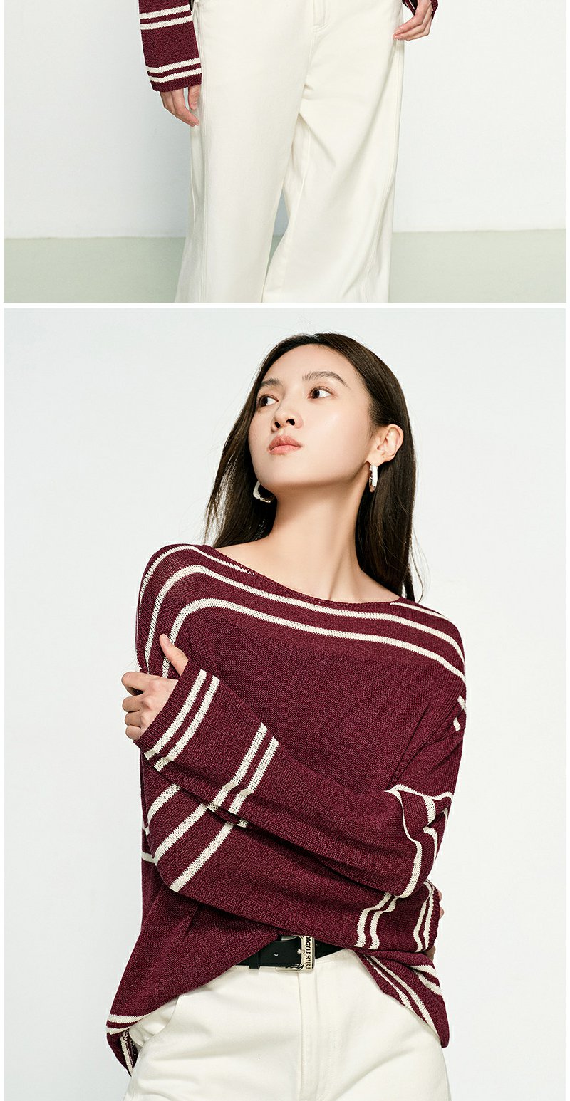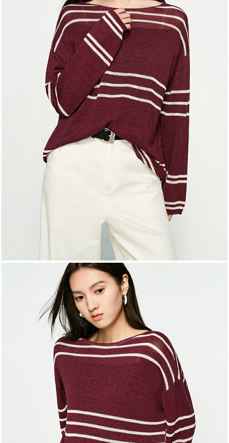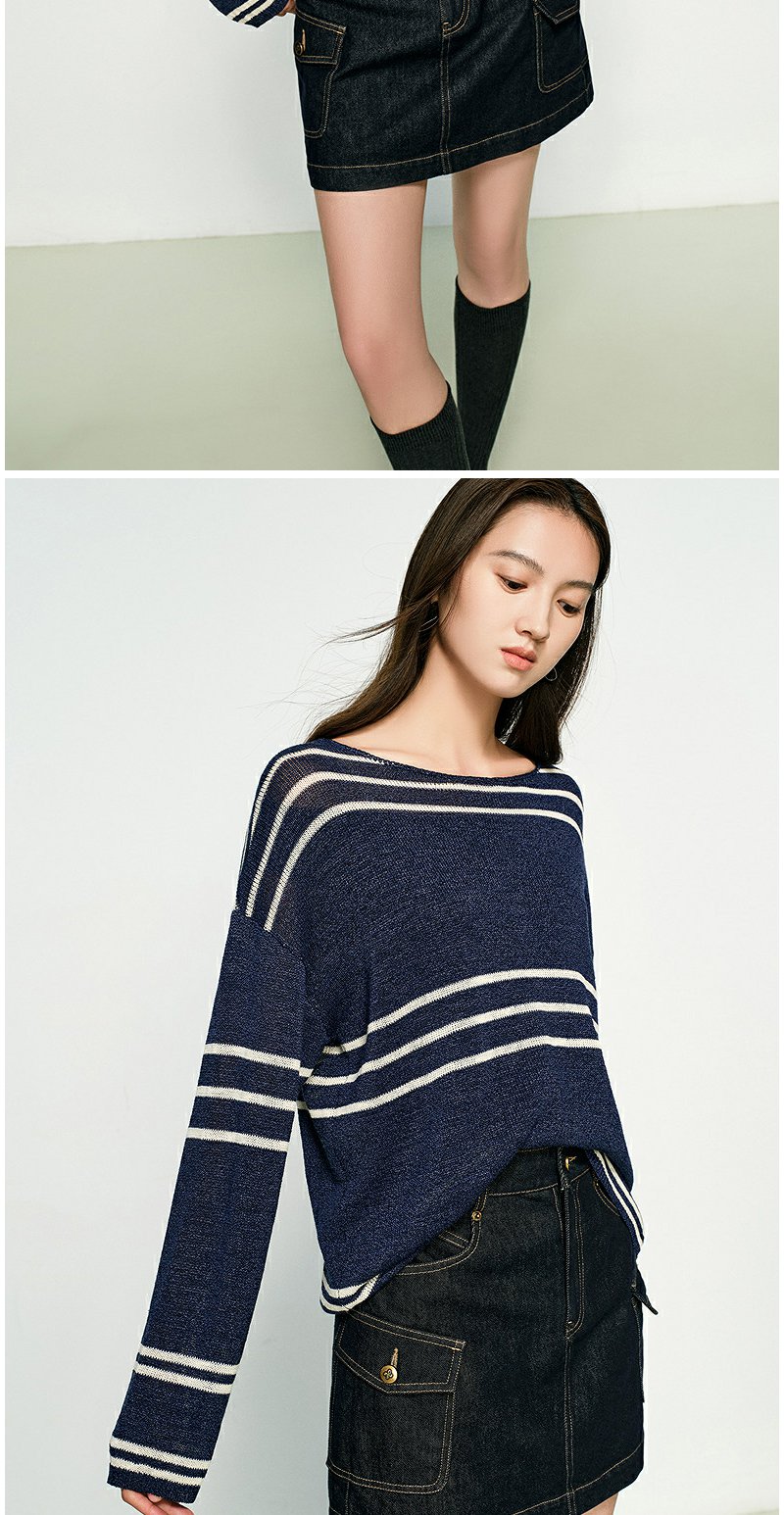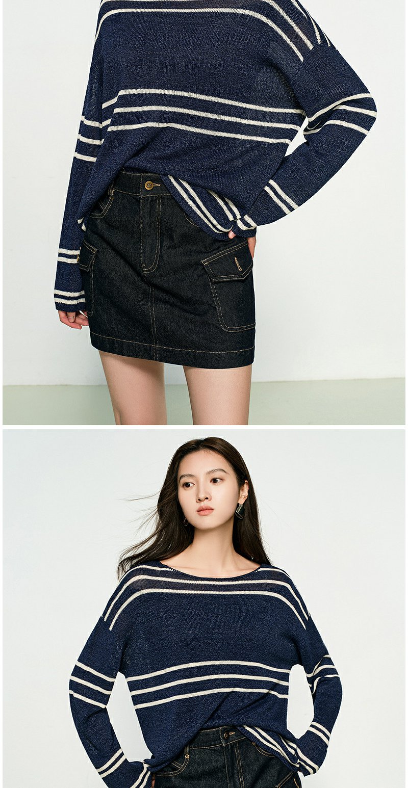 NEELLY纳俪商场同款春季新款条纹一字肩针织衫女圆领显白修身毛衣N25074A04558
