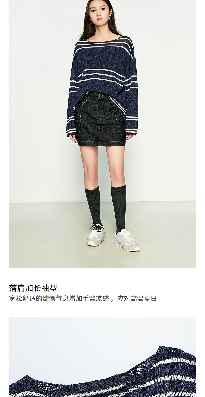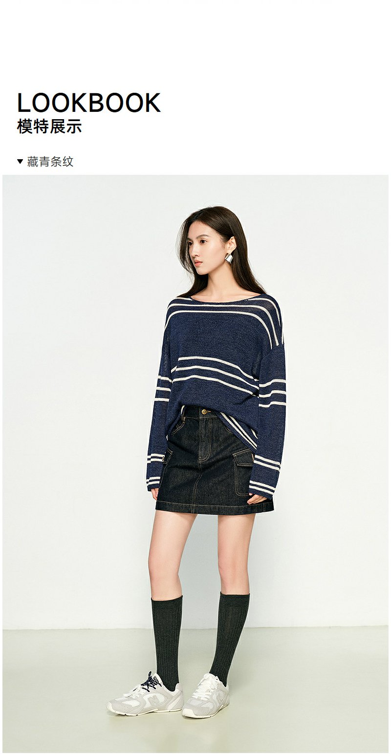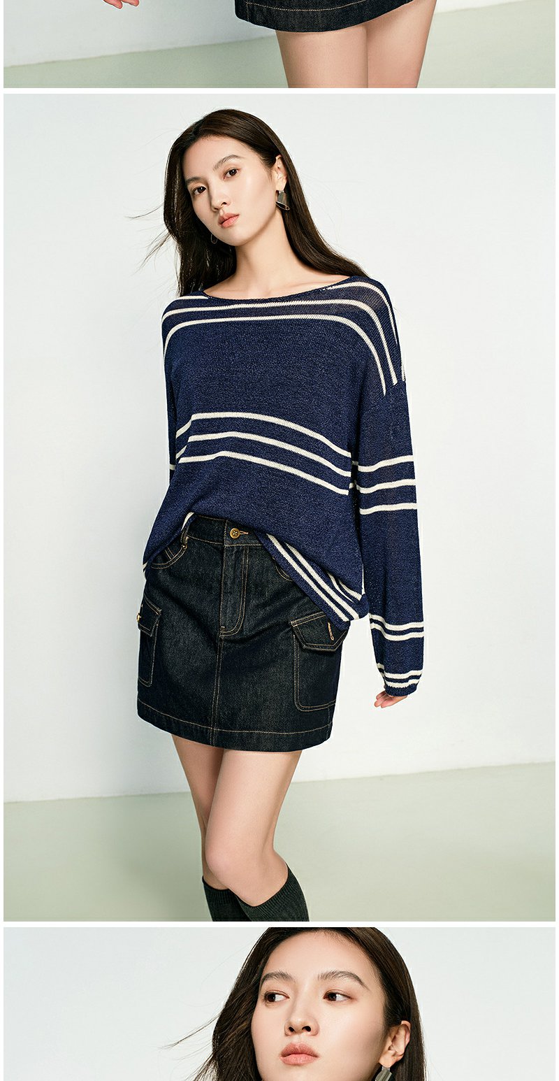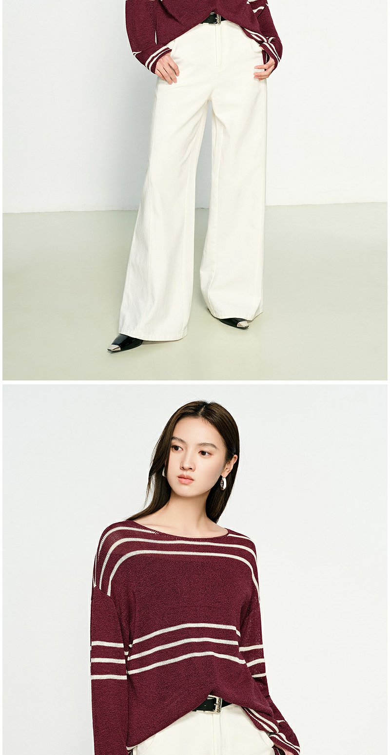 NEELLY纳俪商场同款春季新款条纹一字肩针织衫女圆领显白修身毛衣N25074A04558