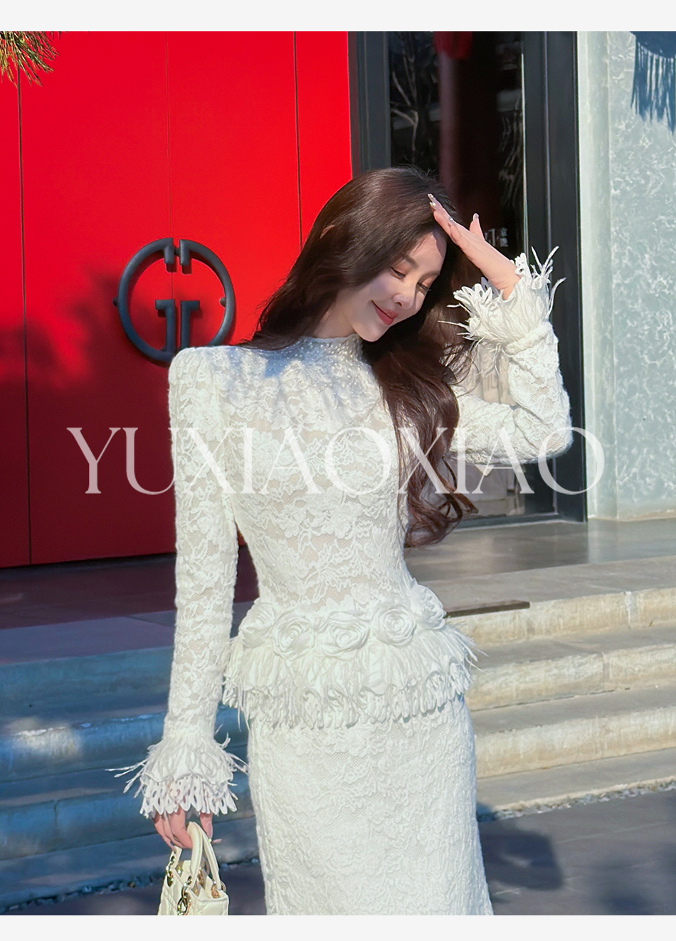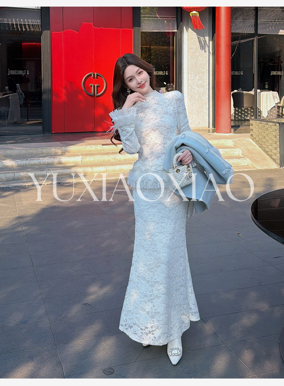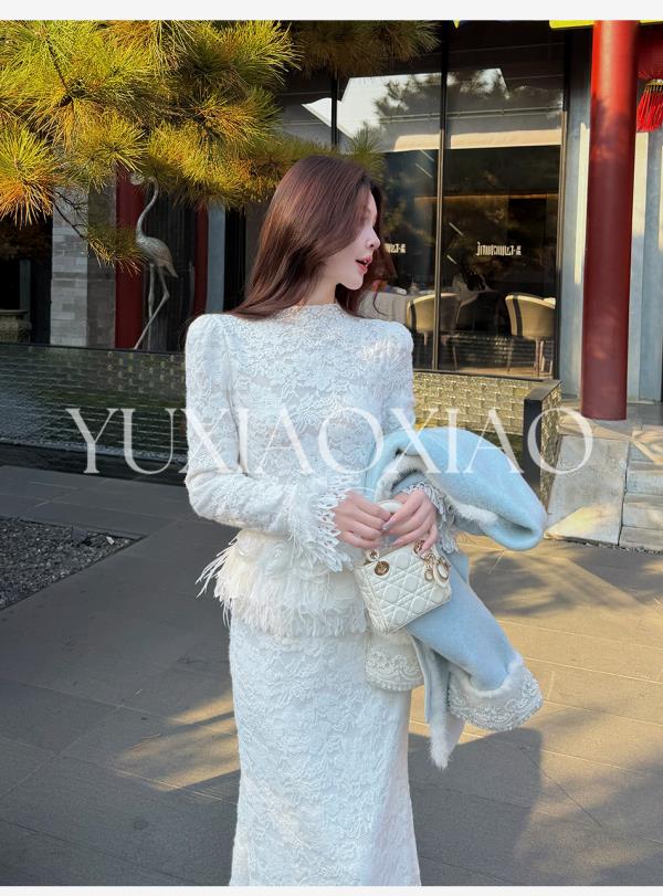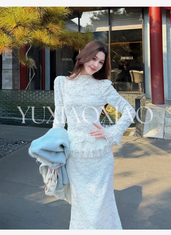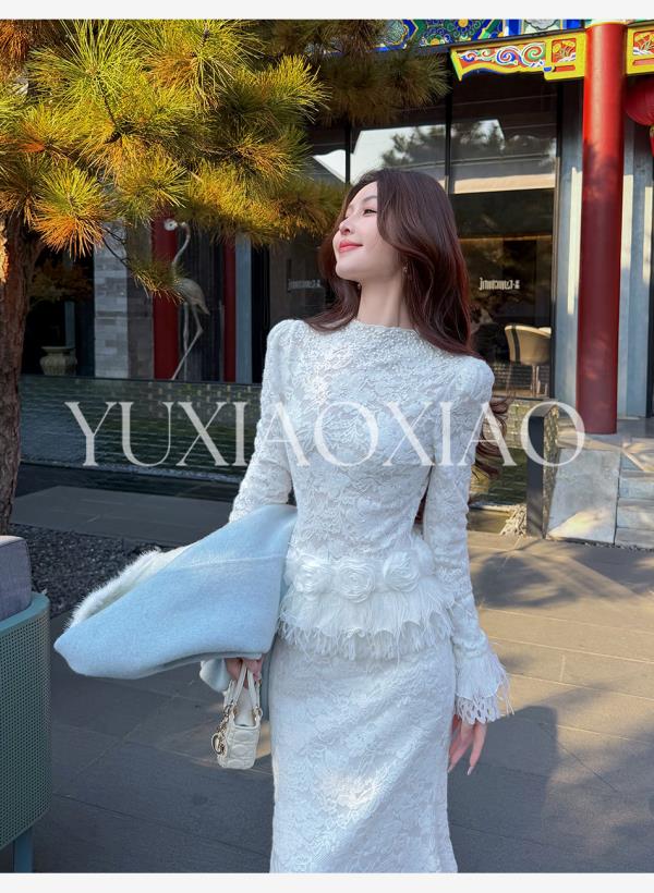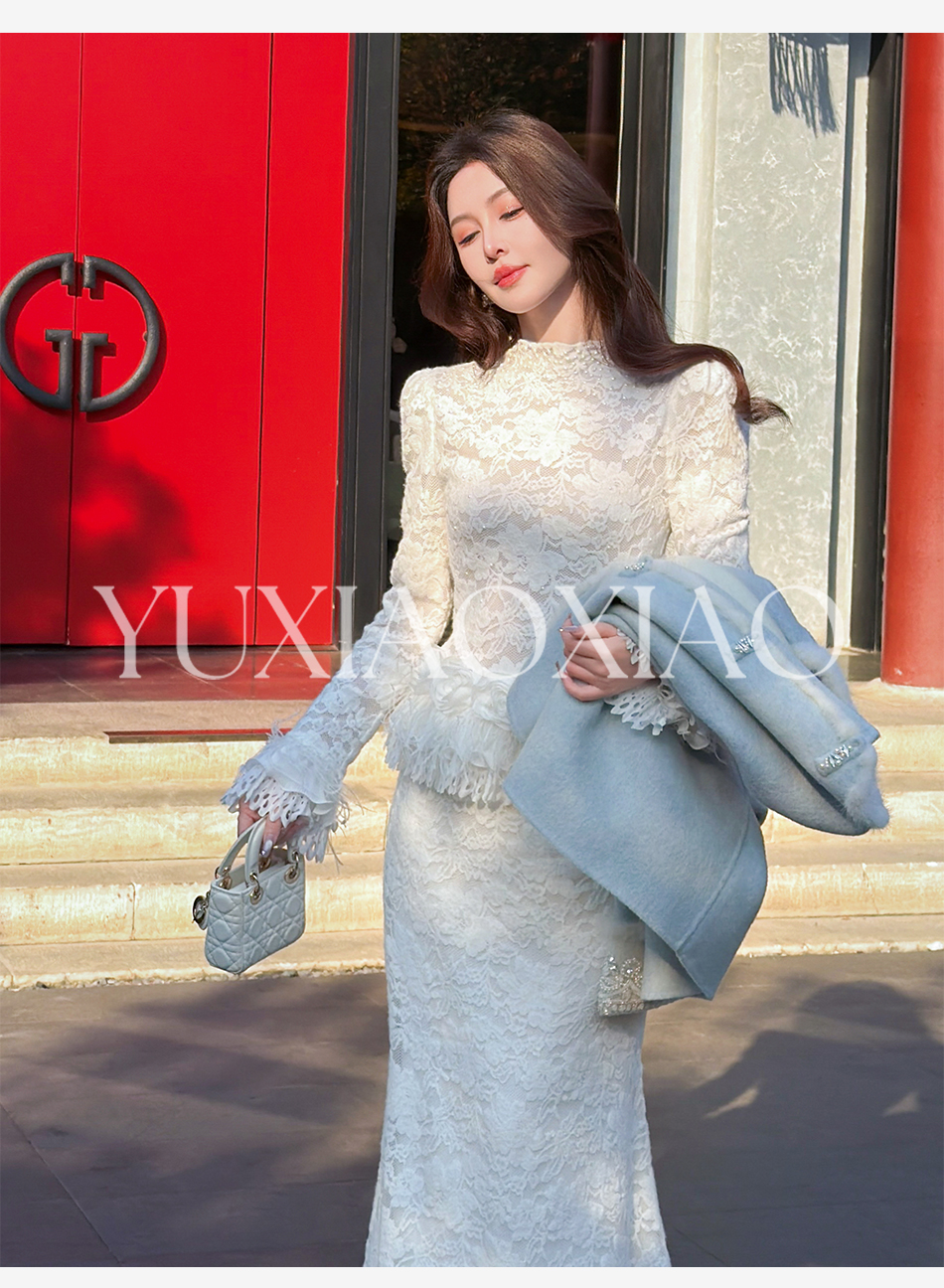 余潇潇【玫瑰纯恋】法式浪漫蕾丝陶瓷烫钻立体花朵修身上衣&长半裙