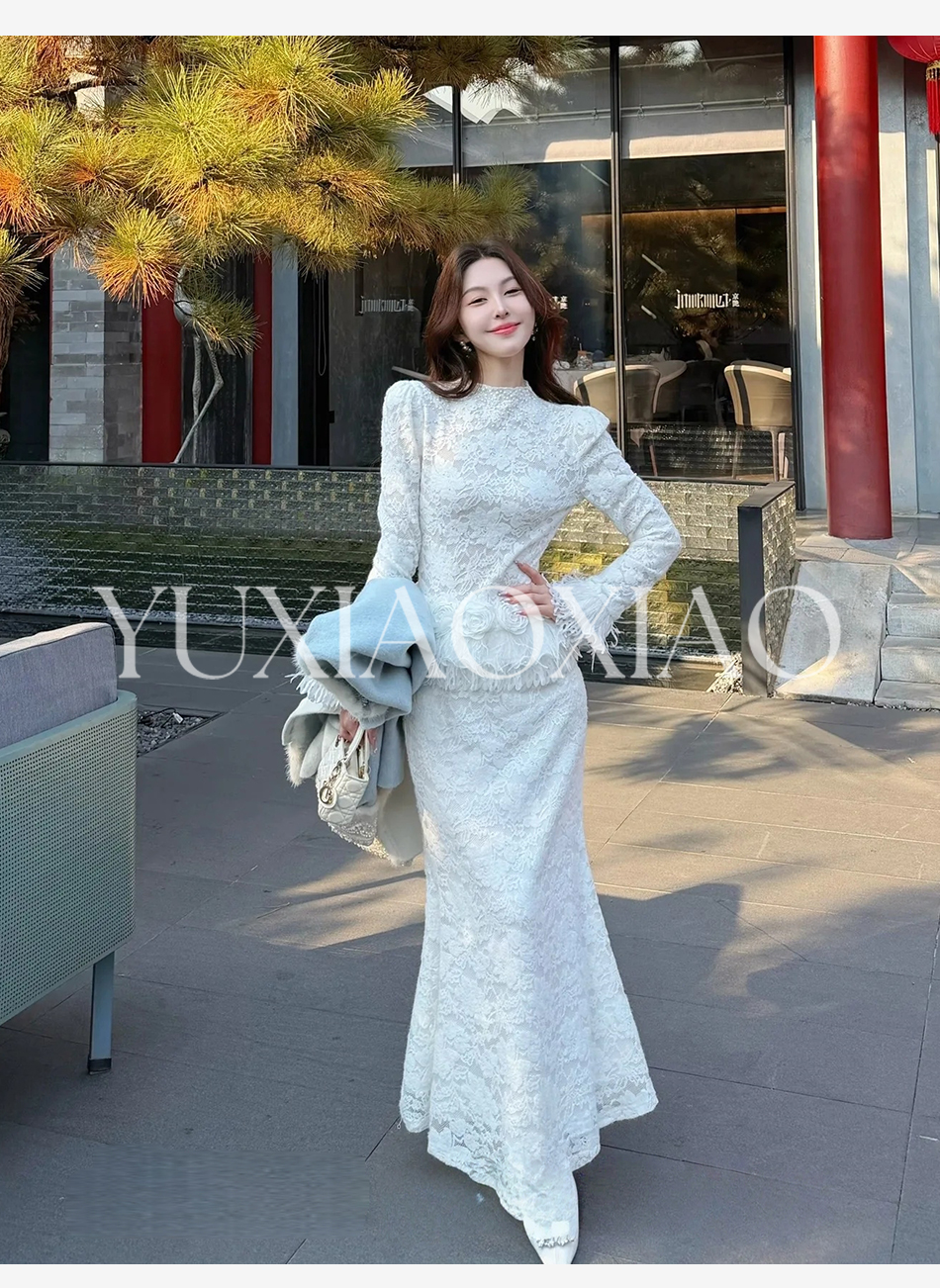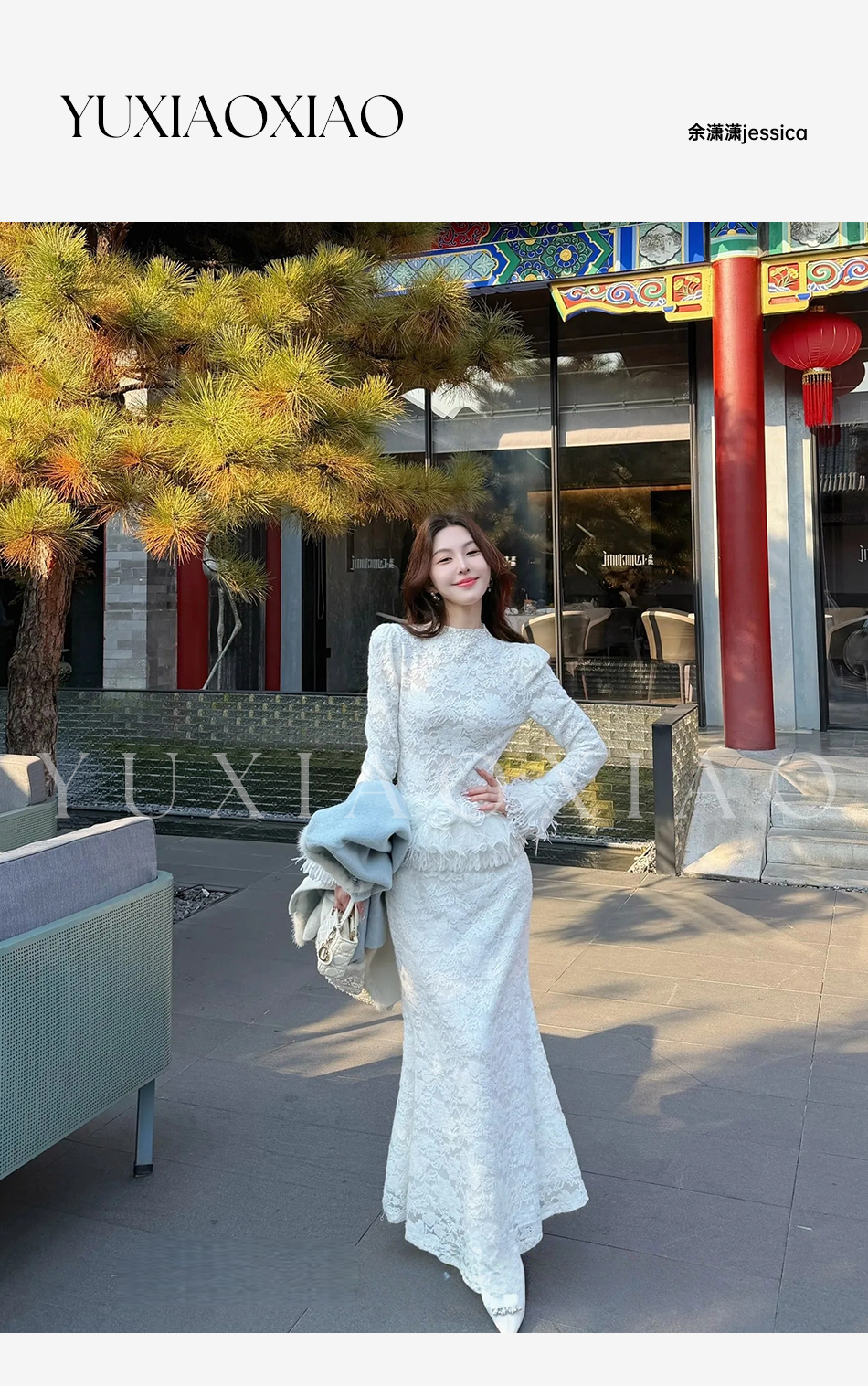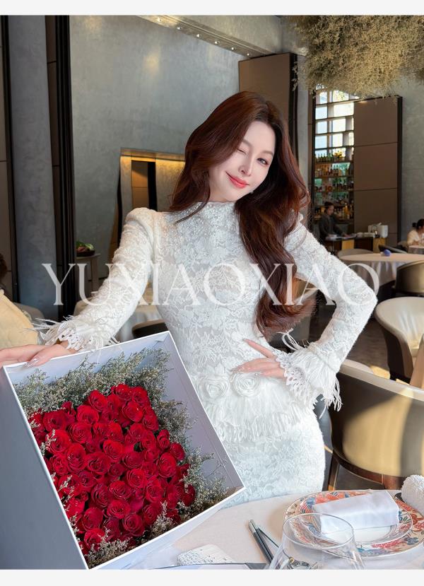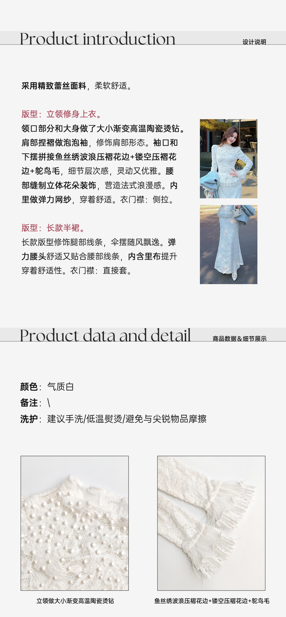 余潇潇【玫瑰纯恋】法式浪漫蕾丝陶瓷烫钻立体花朵修身上衣&长半裙