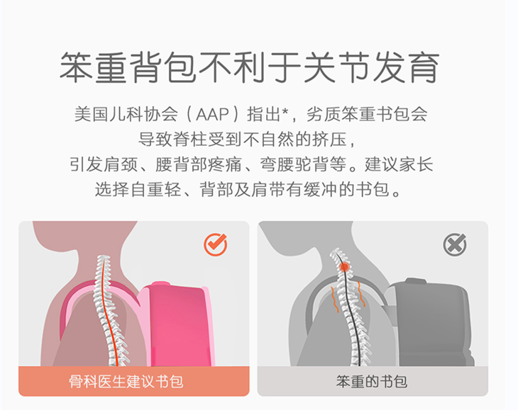 选背包就得选对孩子脊椎友好的 美国儿科协会(AAP)明确指出,劣质笨重的书包会让孩子的脊柱承受不自然的挤压 长期使用不仅会引发肩颈、腰背部疼痛,还可能导致弯腰驼背,影响骨骼与关节的健康发育 所以一定要给孩子选择自重更轻、背部和肩带带有缓冲设计的书包 让脊柱能保持自然舒展的健康状态,避免成长负担