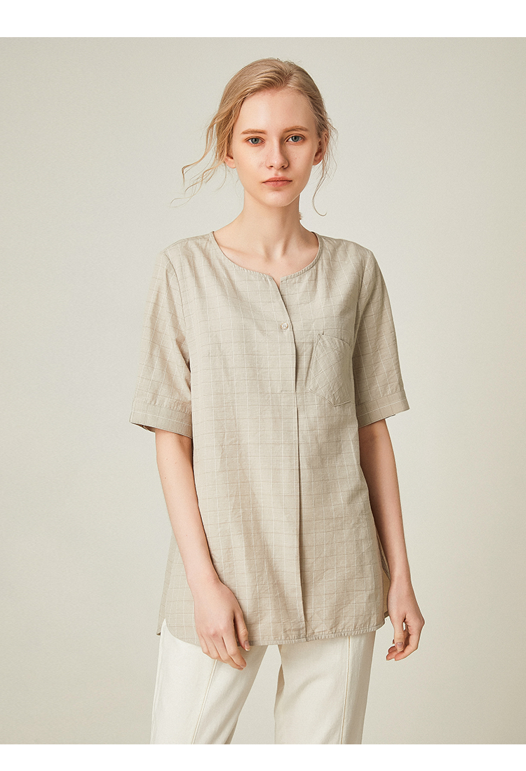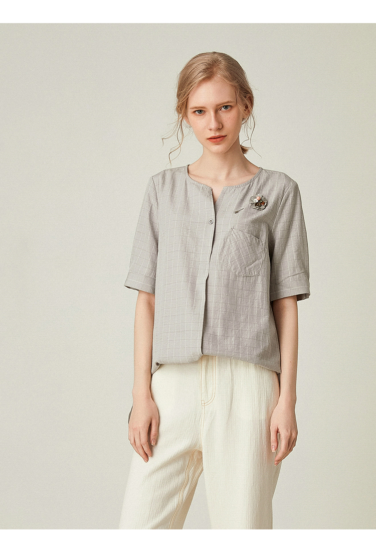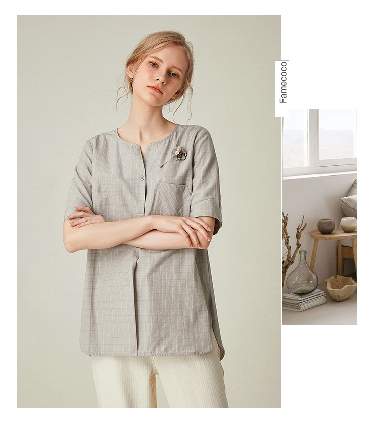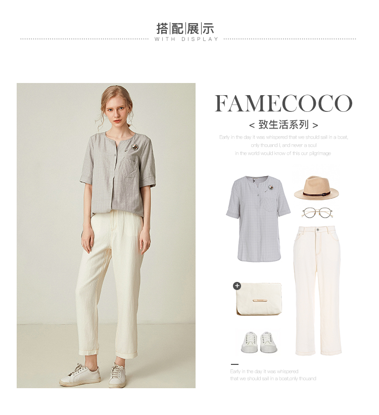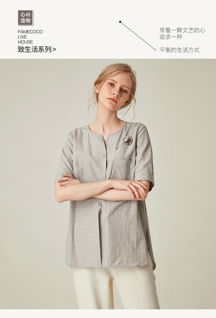 famecoco范可儿女士衬衫新款夏短袖v领外穿宽松百搭上衣F193BD010