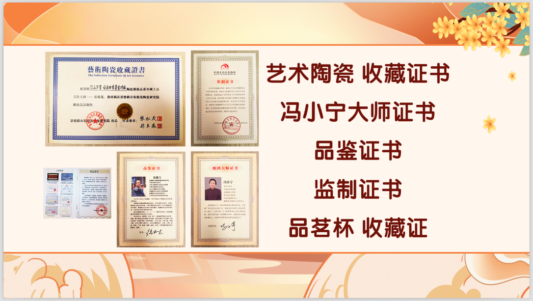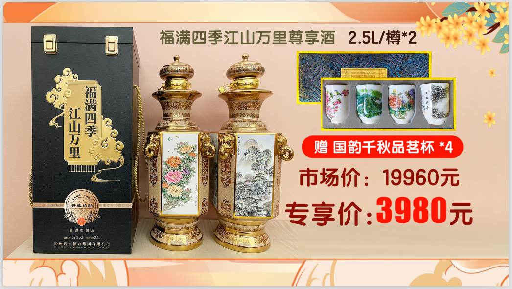 福满四季江山万里尊享酒2.5L/坛*2、国韵千秋品茗杯4个/盒*1、监制证书*1、冯小宁大师证书*1、徐桃生品鉴证书*1、对瓶收藏证书*1、杯子收藏证*1、产品图册*1