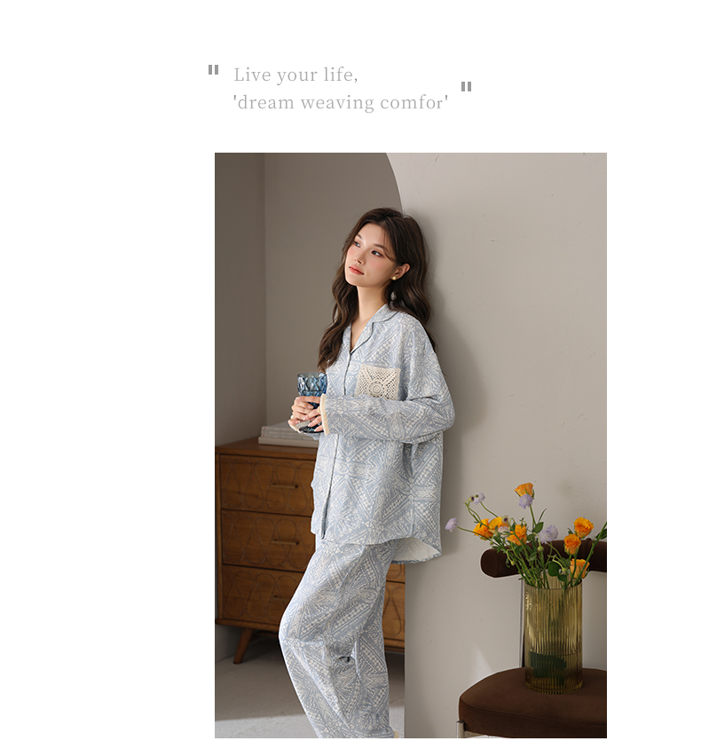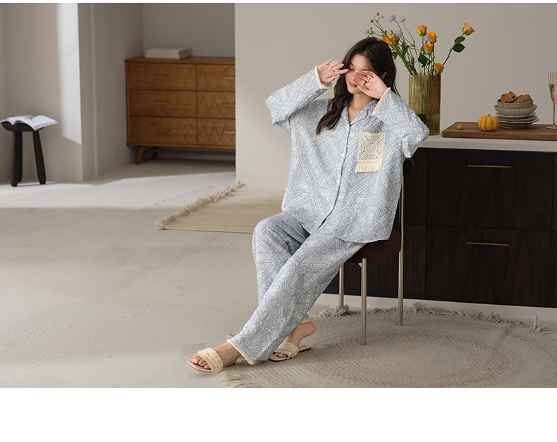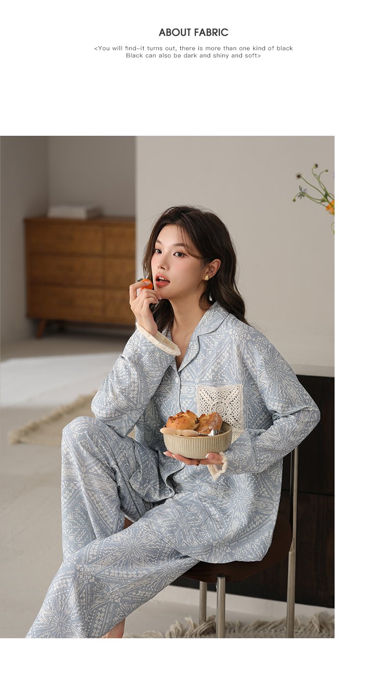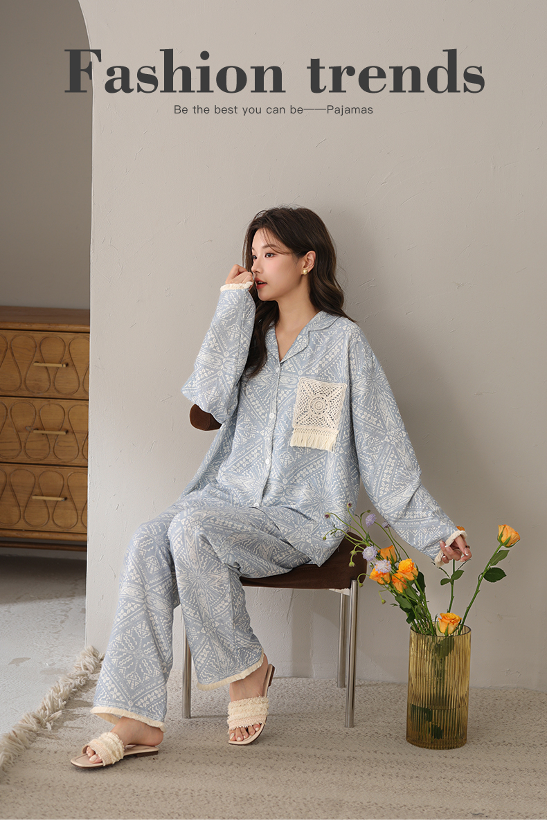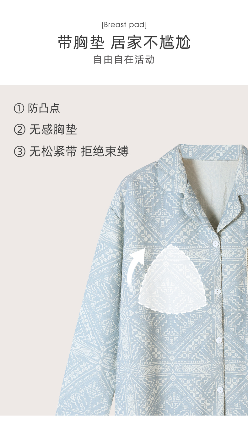 可人儿春秋季带胸垫泡泡绵女士长袖长裤睡衣可外出小众家居服套装
