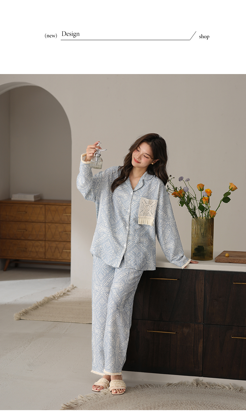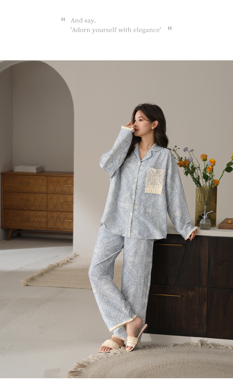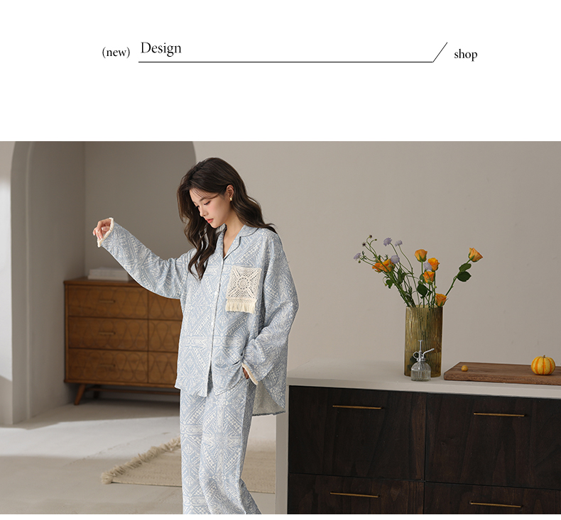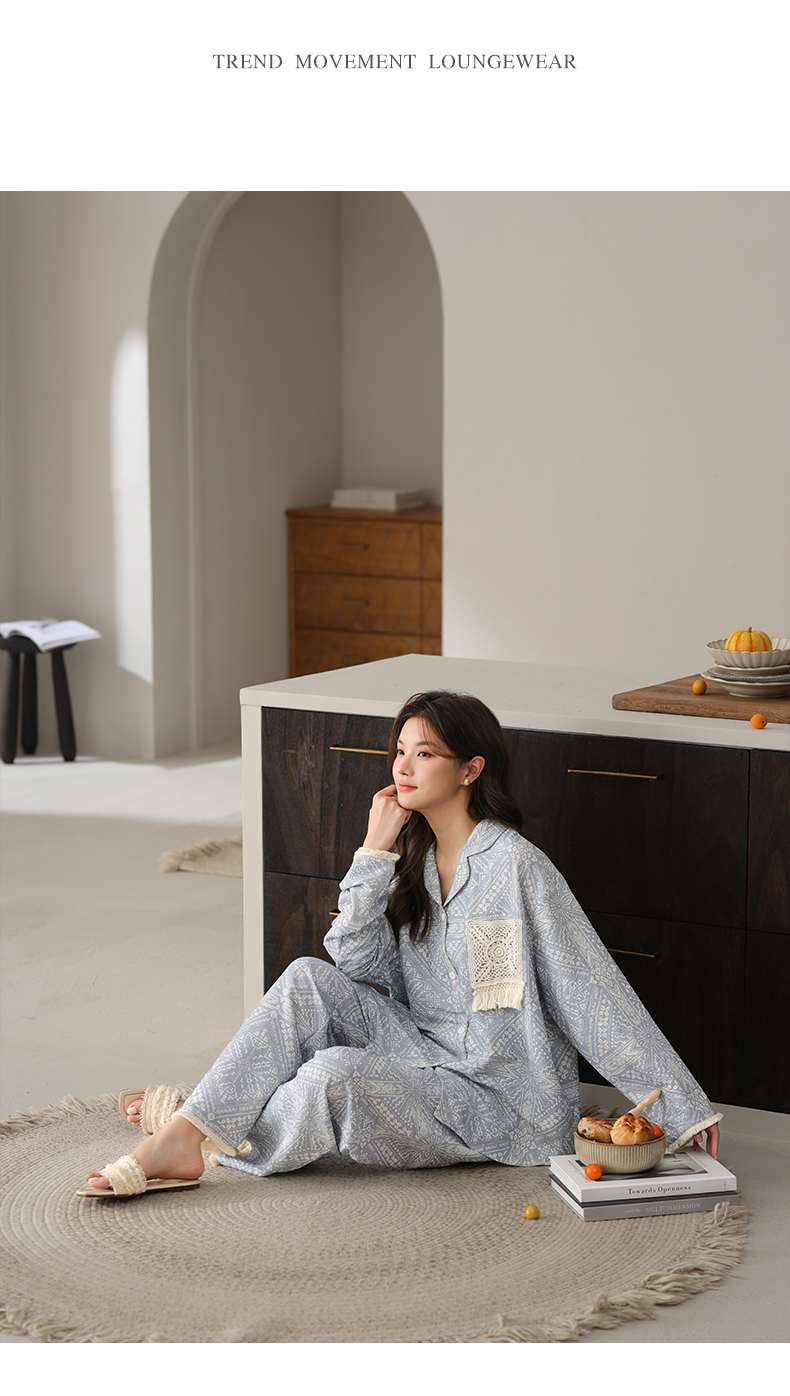 可人儿春秋季带胸垫泡泡绵女士长袖长裤睡衣可外出小众家居服套装