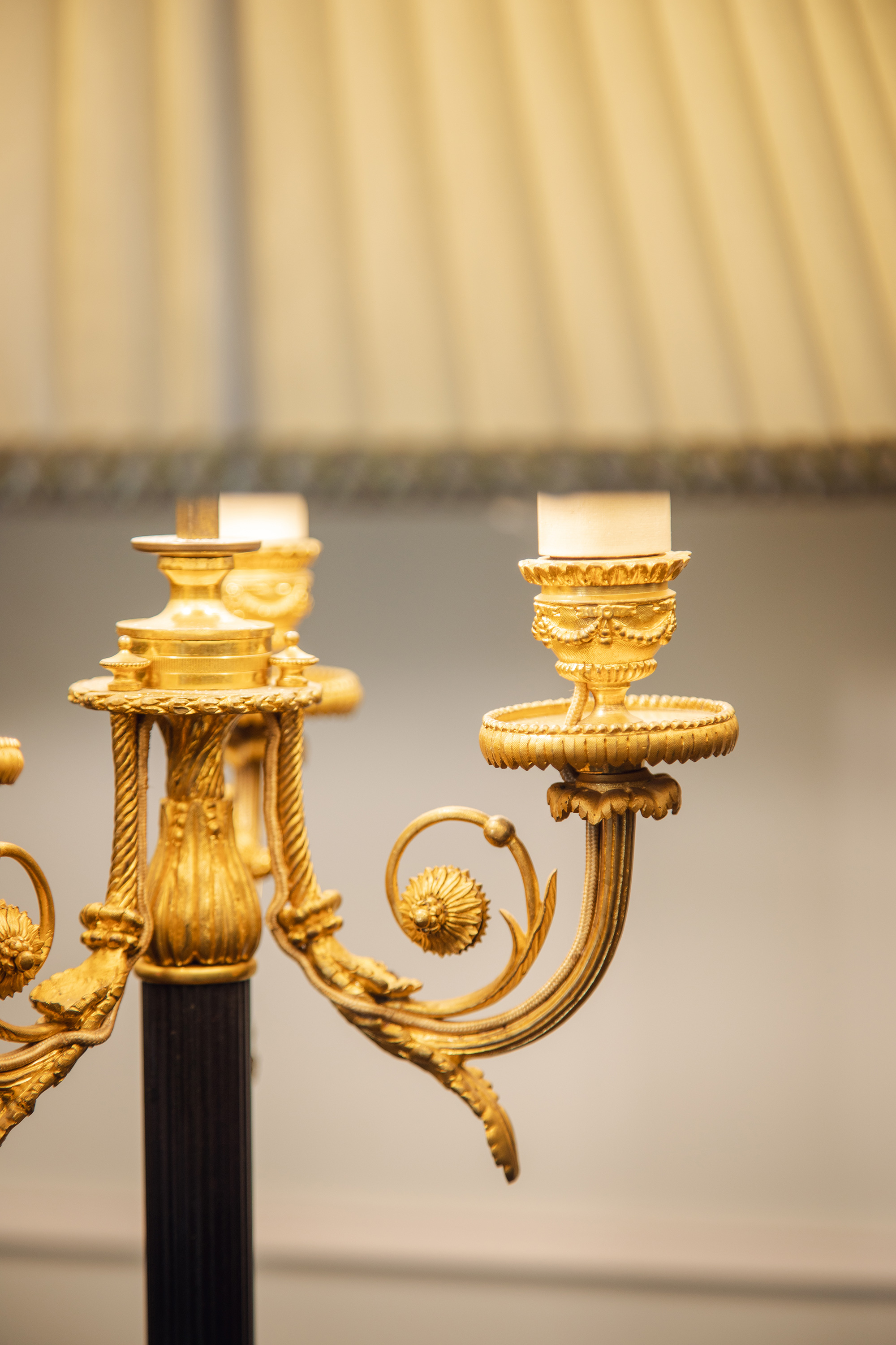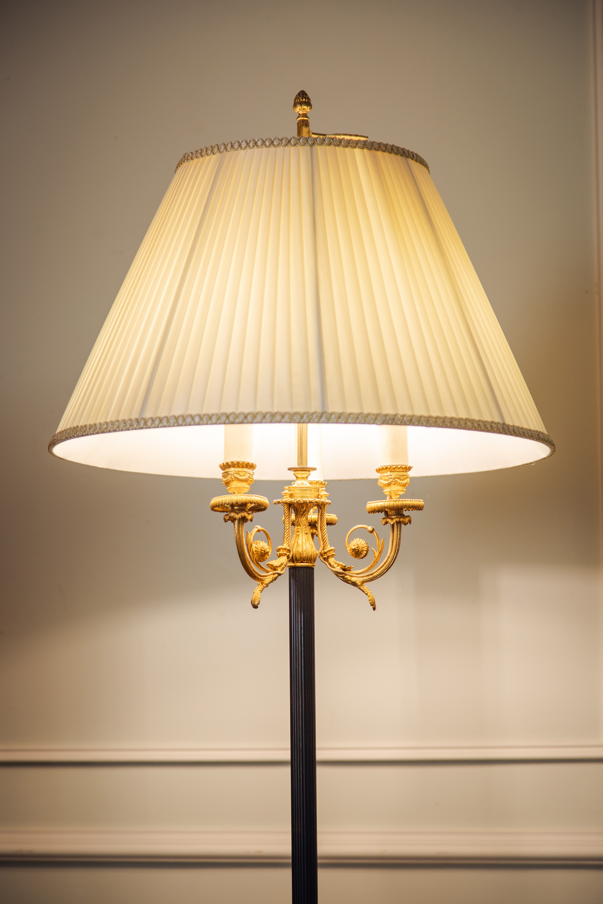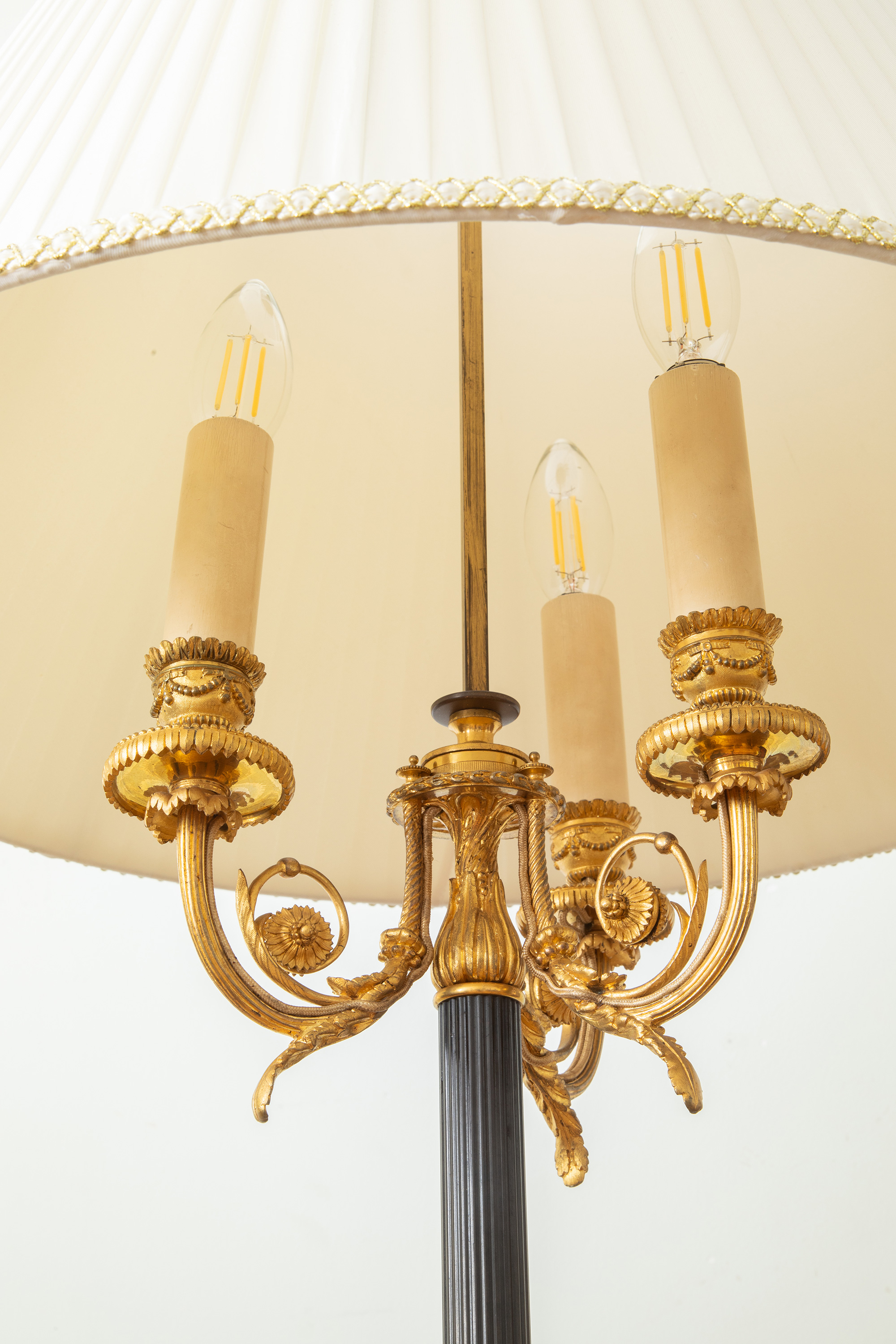 1880年代法国出品古典茛苕叶纹铜鎏金精雕装饰布面百褶灯罩落地灯