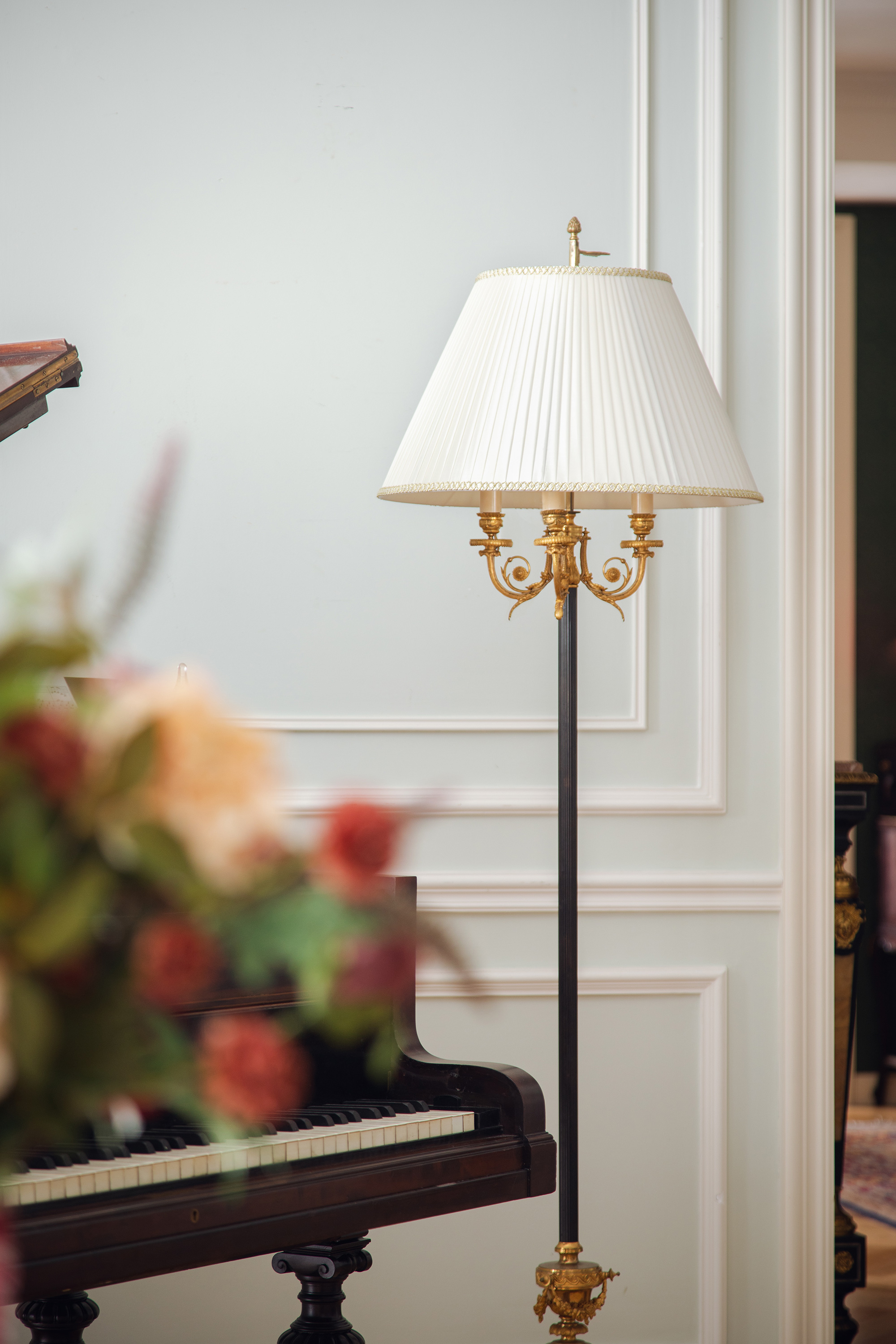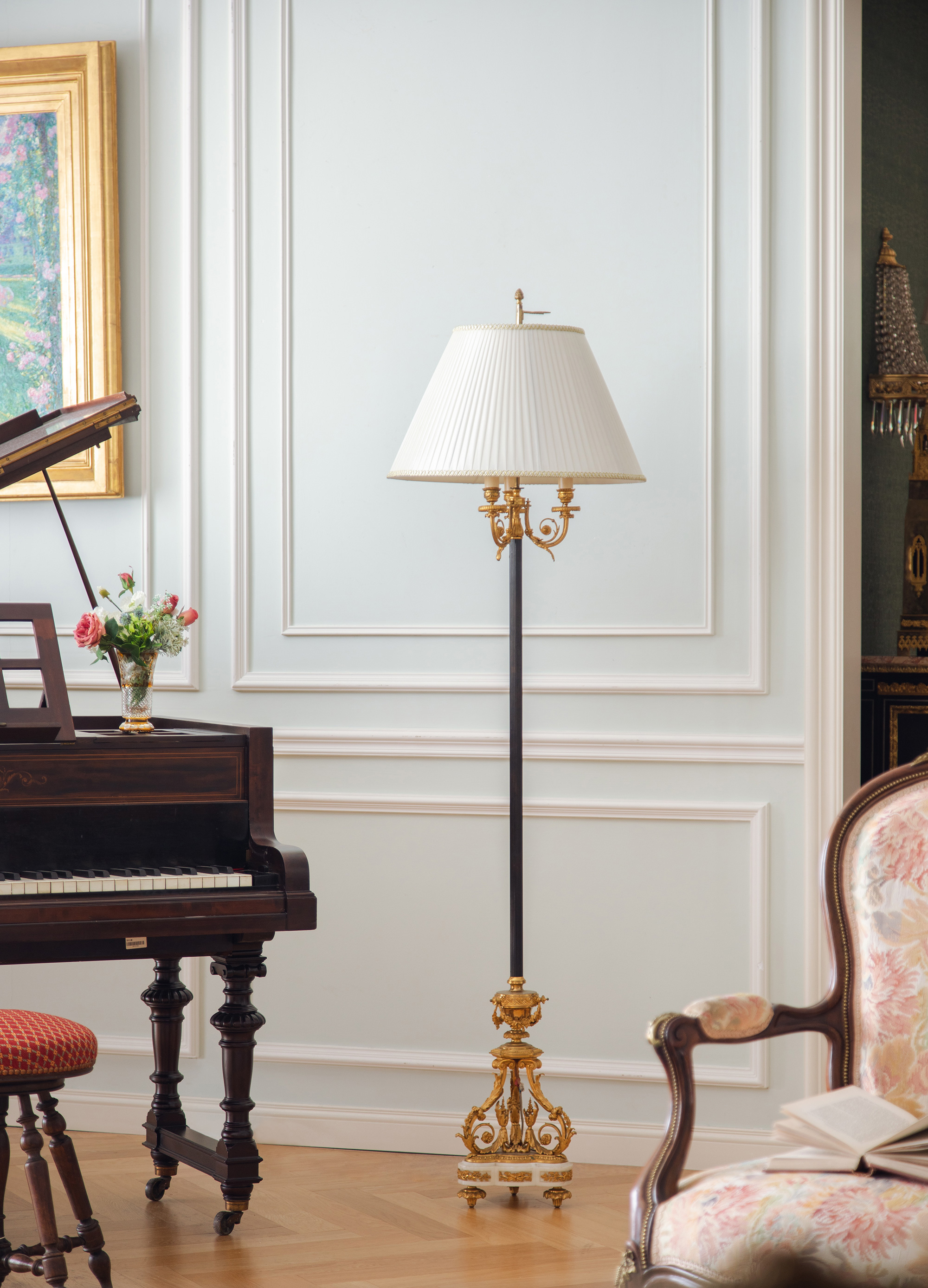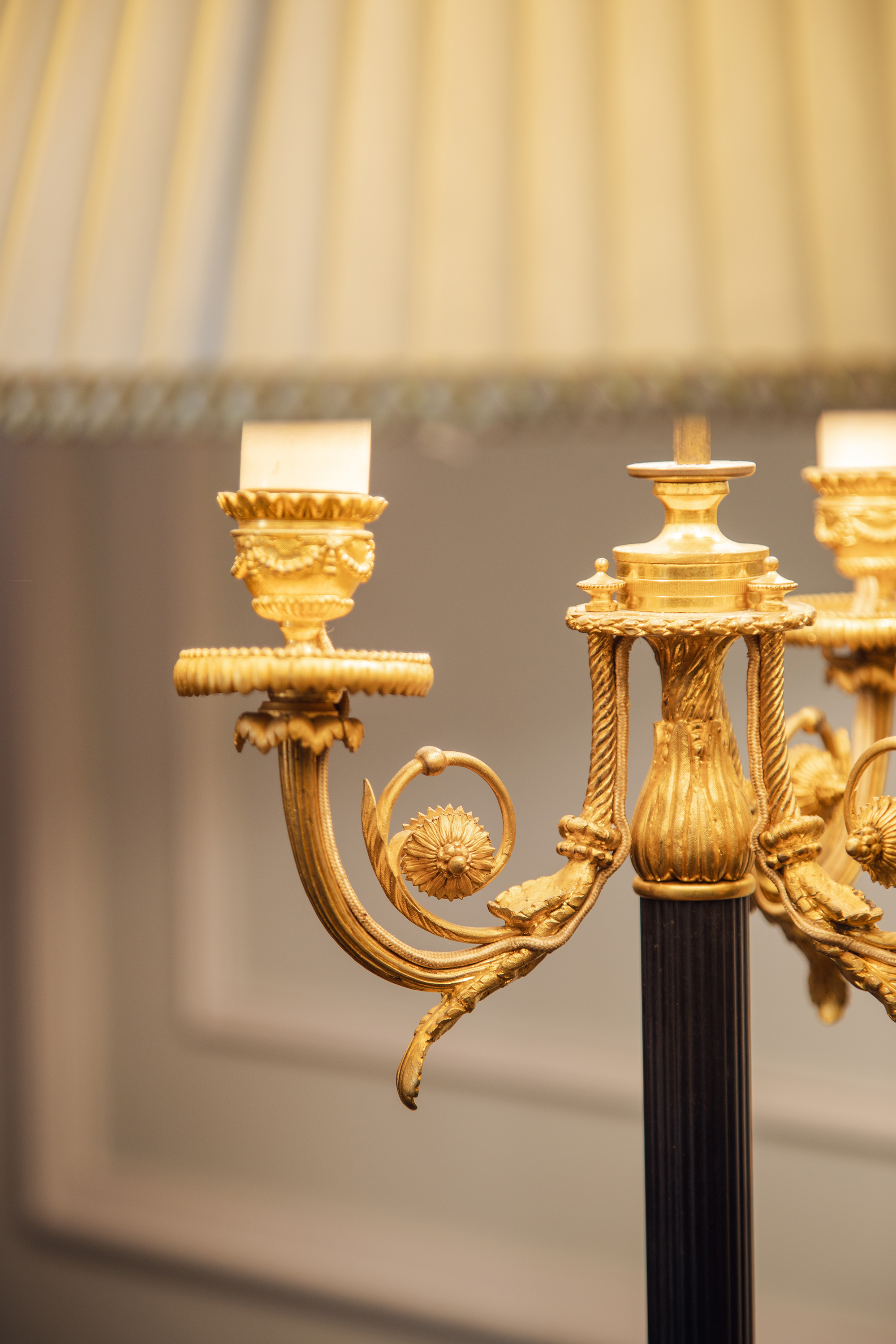1880年代法国出品古典茛苕叶纹铜鎏金精雕装饰布面百褶灯罩落地灯