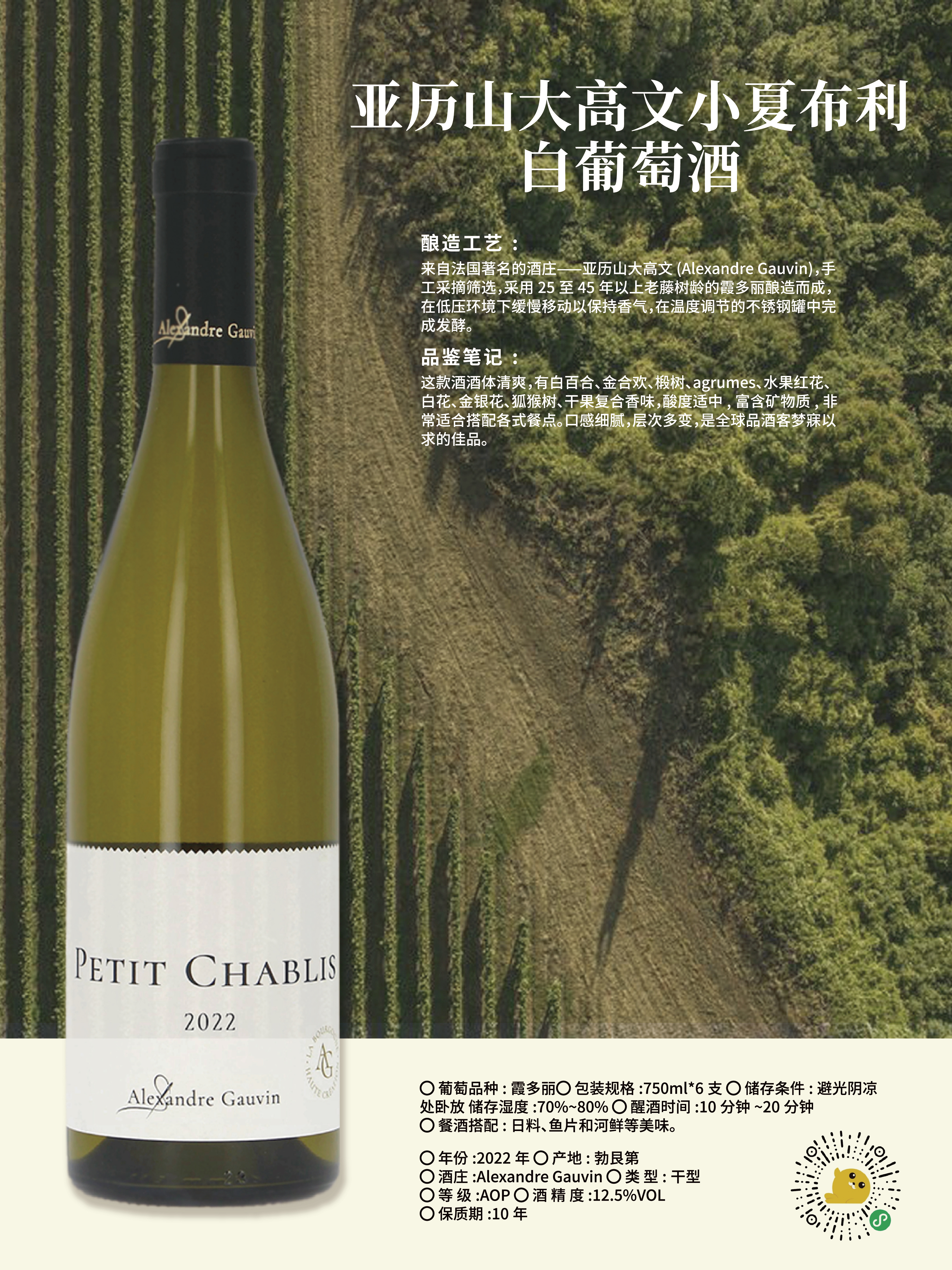 【完税】2022年亚历山大高文小夏布利白葡萄酒