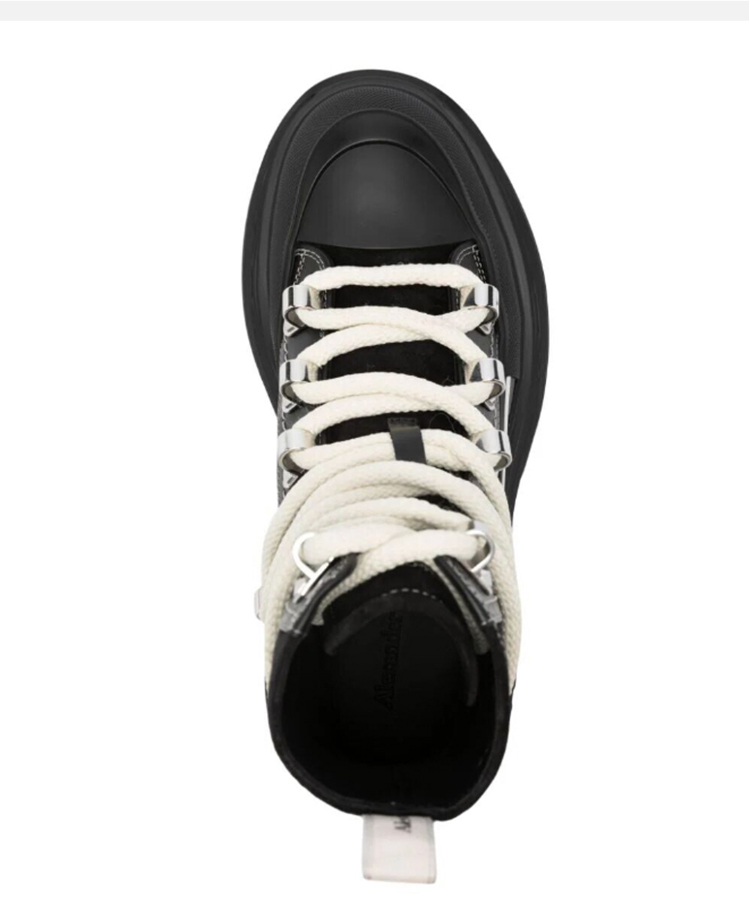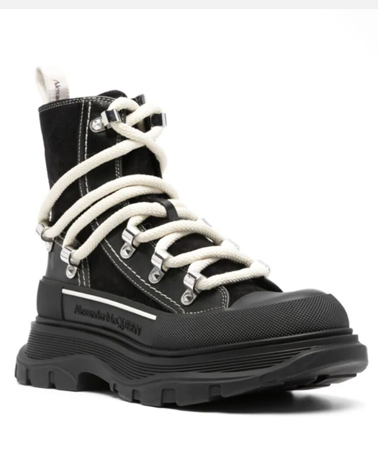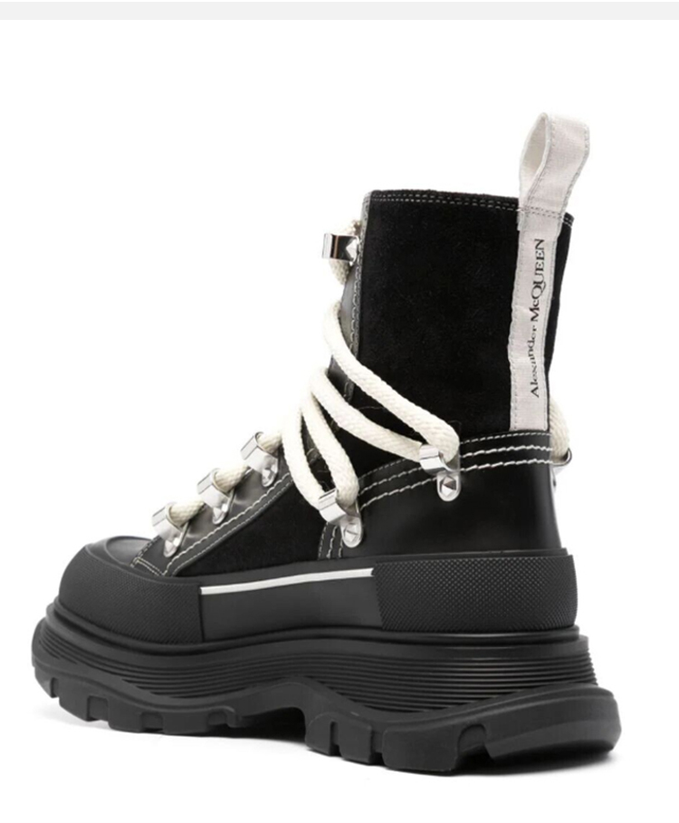 ALEXANDER MCQUEEN 亚历山大.麦昆 女士皮革字母徽标压花系带中靴 黑色 766899 WIED4 1694