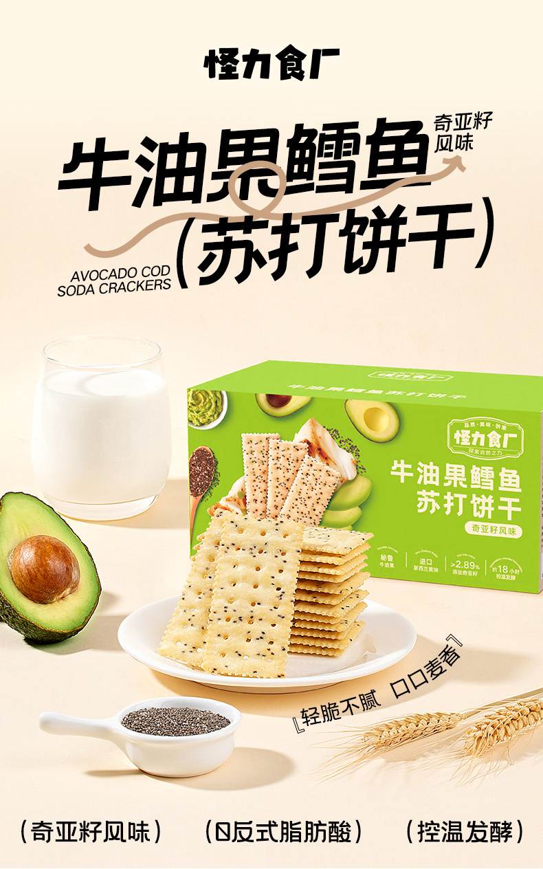 怪力食厂 牛油果鳕鱼苏打饼干奇亚籽风味508g/箱
