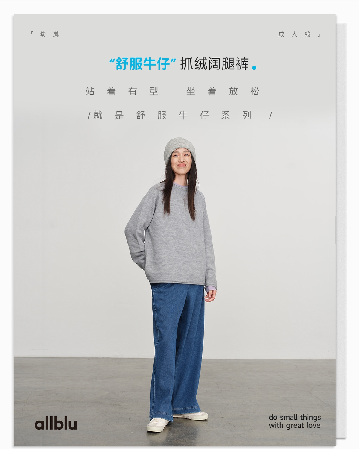 allblu幼岚女装舒服牛仔抓绒阔腿裤,柔软保暖,挺括有型