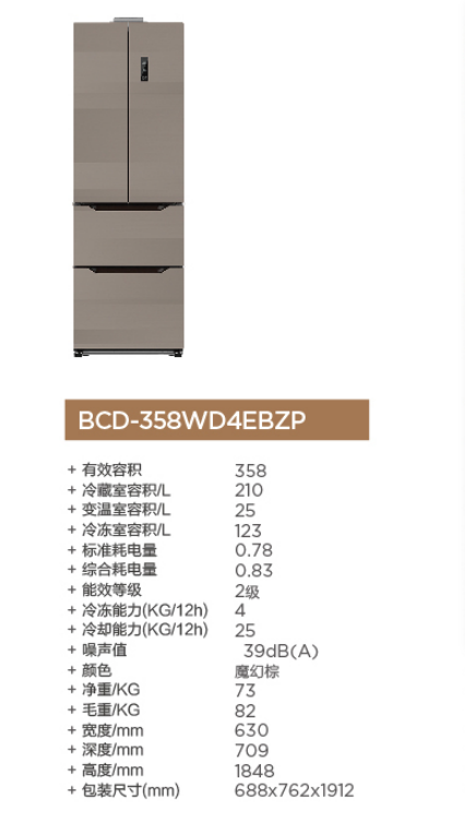 康佳 冰箱 BCD-358WD4EBZP棕色 358升 对开门冰箱