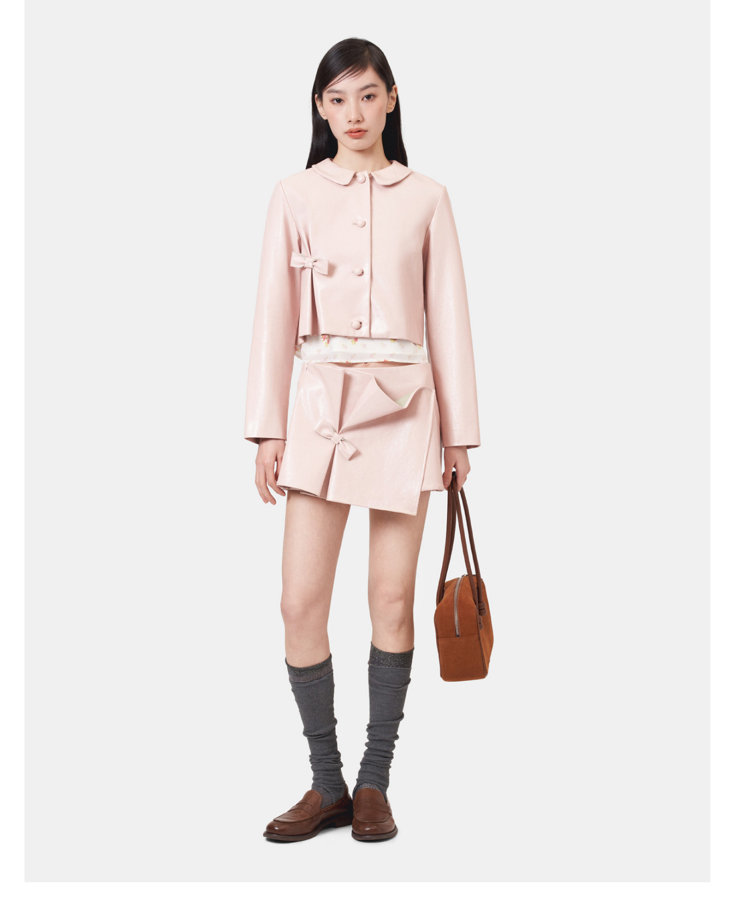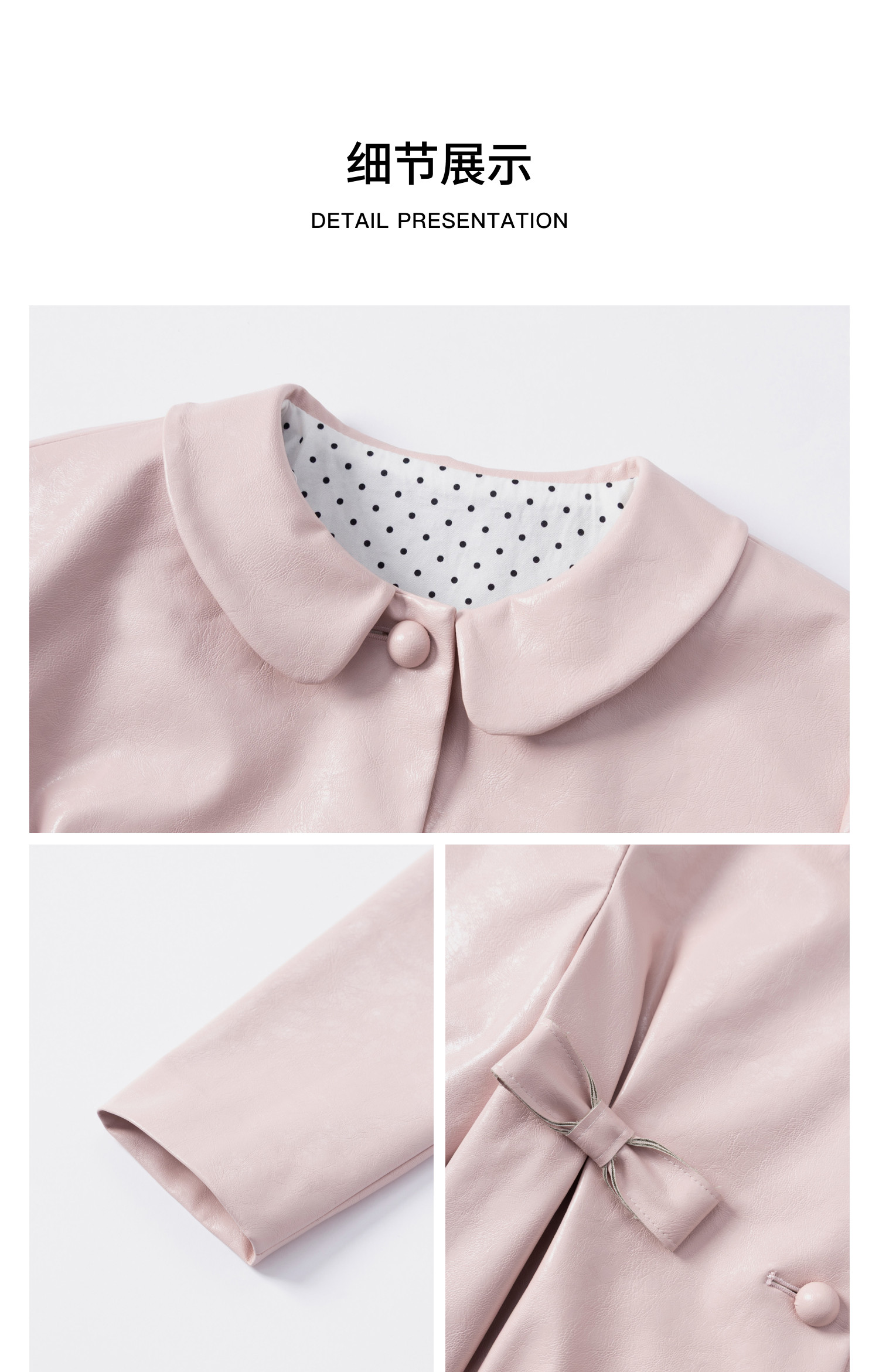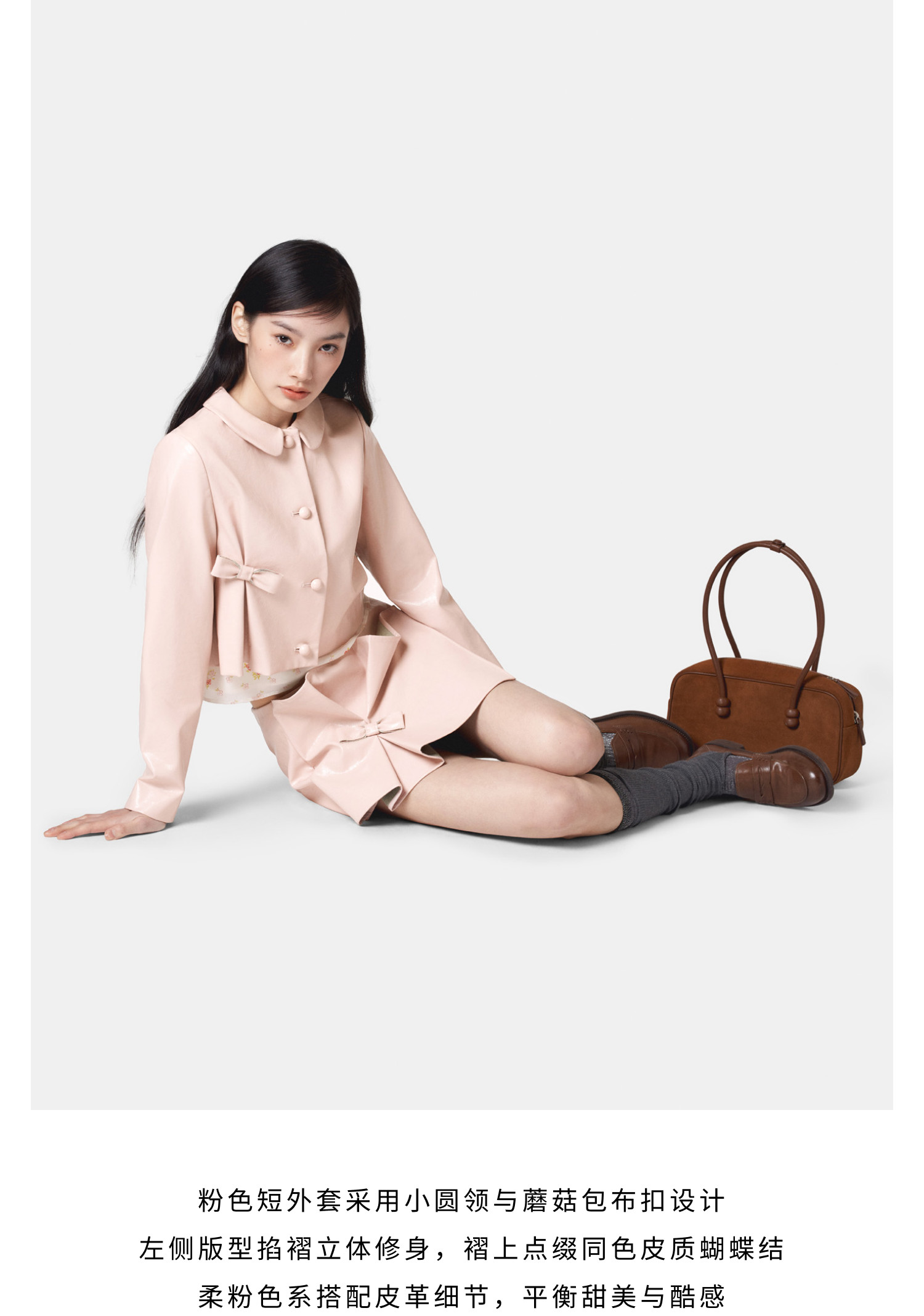 HERLIAN 2026年春季新品掐褶设计粉调皮短款PU皮女士修身外套