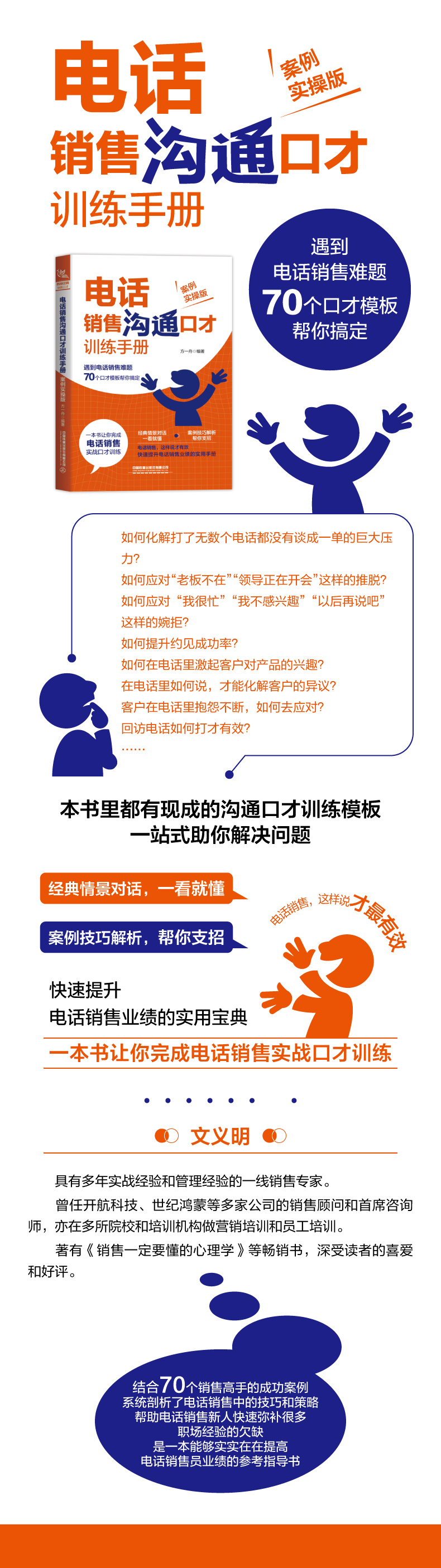 遇到电话销售难题,70个口才模板帮你搞定 经典情景对话,一看就懂案例技巧解析,帮你支招 电话销售,这样说才很有效 快速提升电话销售业绩的实用宝典 一本书让你完成电话销售实战口才训练阅读本书的价值: 如何化解打了无数个电话都没有谈成一单的巨大压力? 如何应对“老板不在”“领导正在开会”这样的推脱? 如何应对“我很忙”“我不感兴趣”“以后再说吧”这样的婉拒? 如何提升约见成功率? 如何在电话里激起客户对产品的兴趣? 在电话里如何说,才能化解客户的异议? 客户在电话里抱怨不断,如何去应对? 回访电话如何打才很有效? …… 本书里都有现成的沟通口才训练模板,一站式助你解决问题。