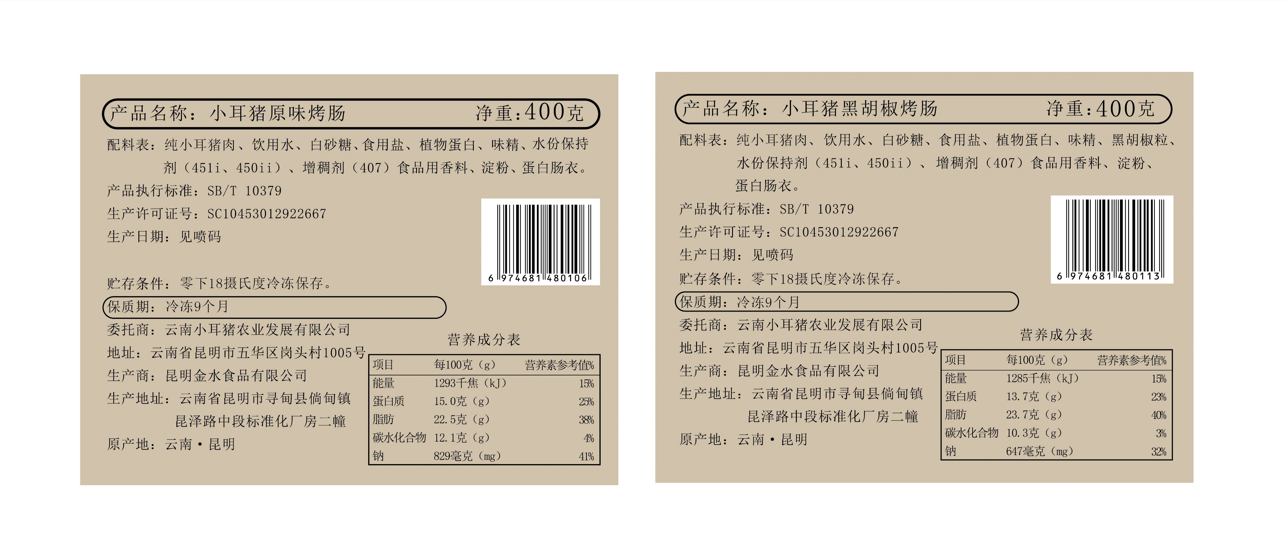 品名:小耳猪烤肠 规格:400g/盒(内含2袋,共8根)发货地/产地:云南/云南