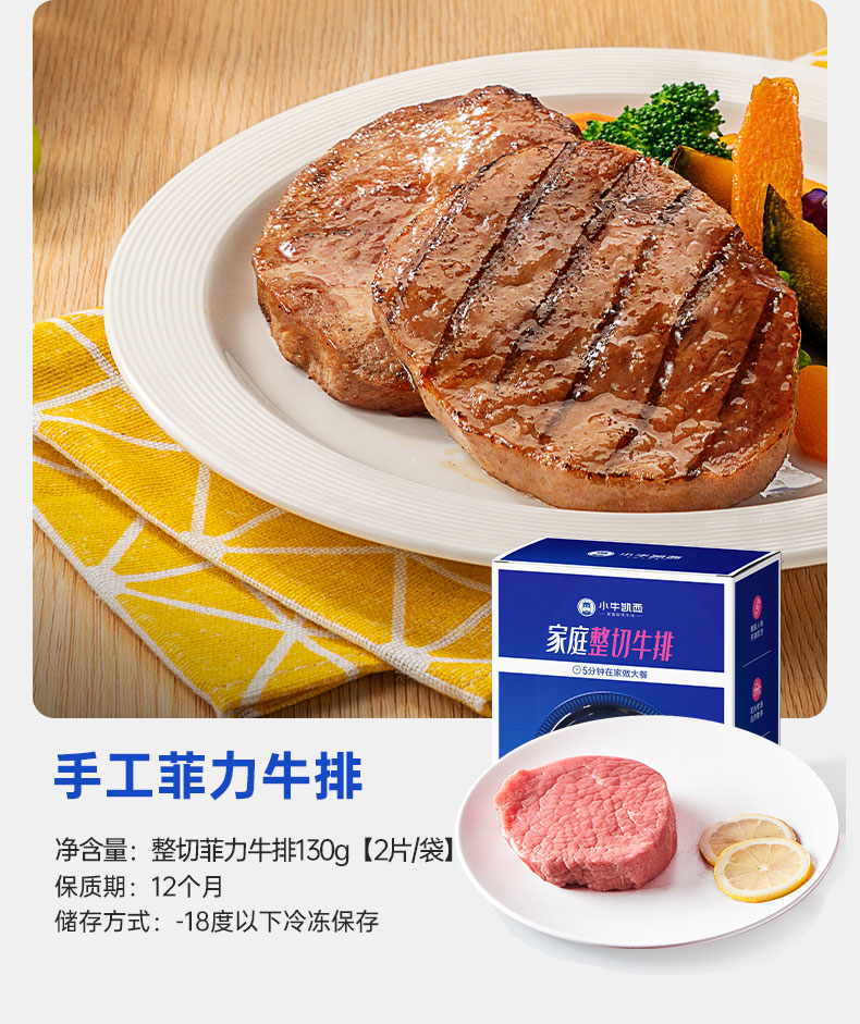 【牛排试吃最后5份】小牛凯西整切菲力牛排650g/盒(130g/2片)+黑椒酱20g*5