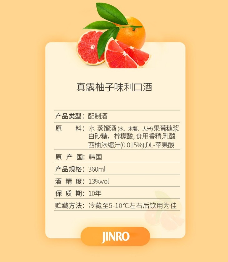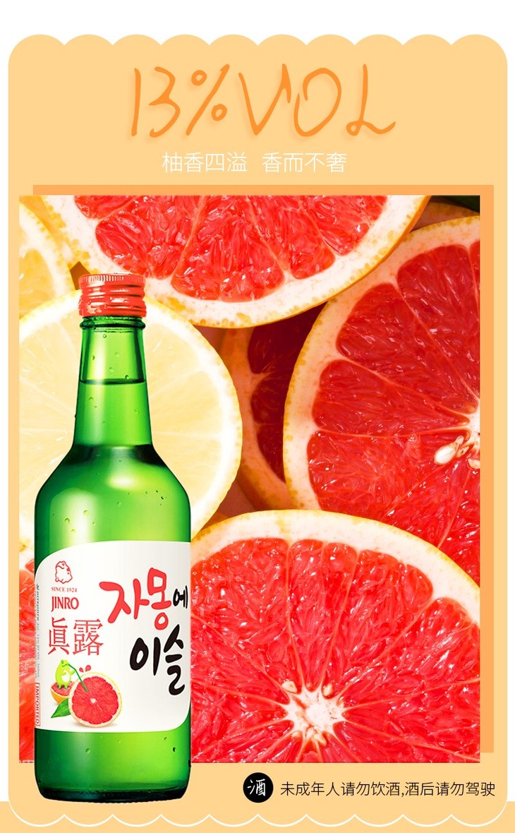 真露 韩国进口烧酒13°西柚味 360ml*1瓶/6瓶/12瓶/20瓶