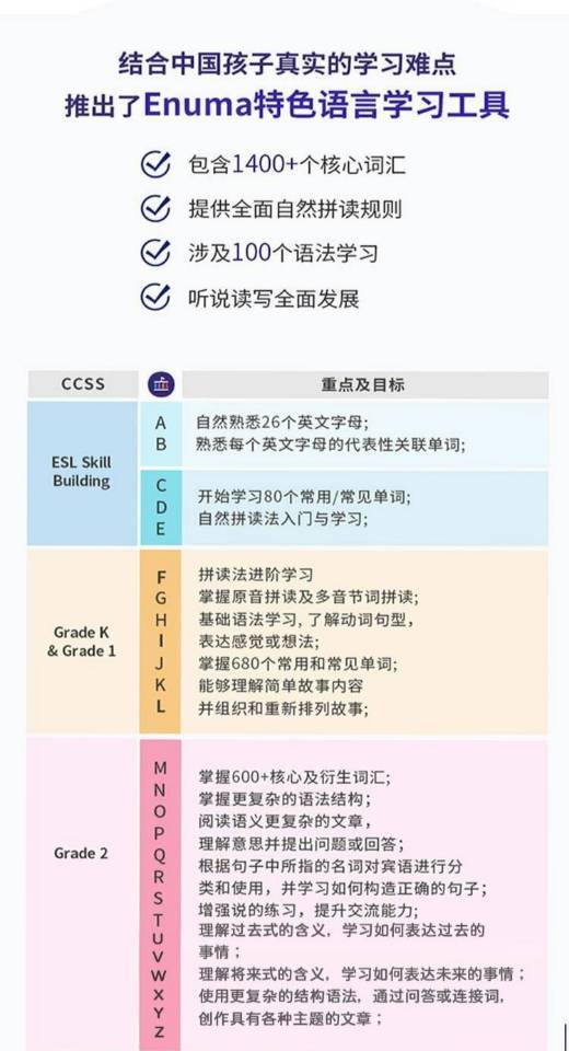 🕉 包含7个维度:字母学习、单词拼读、思维和科学、听、说、读、写;