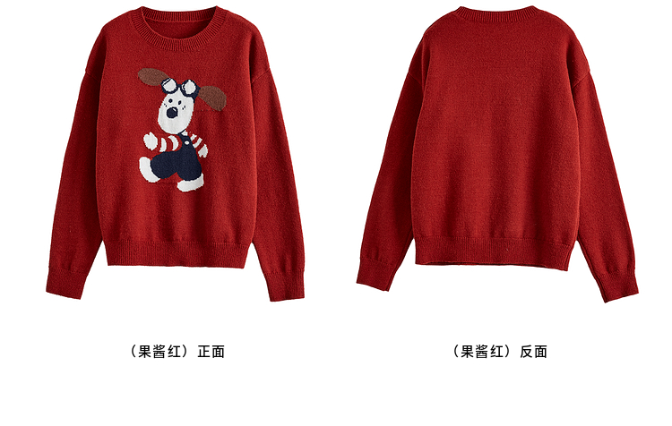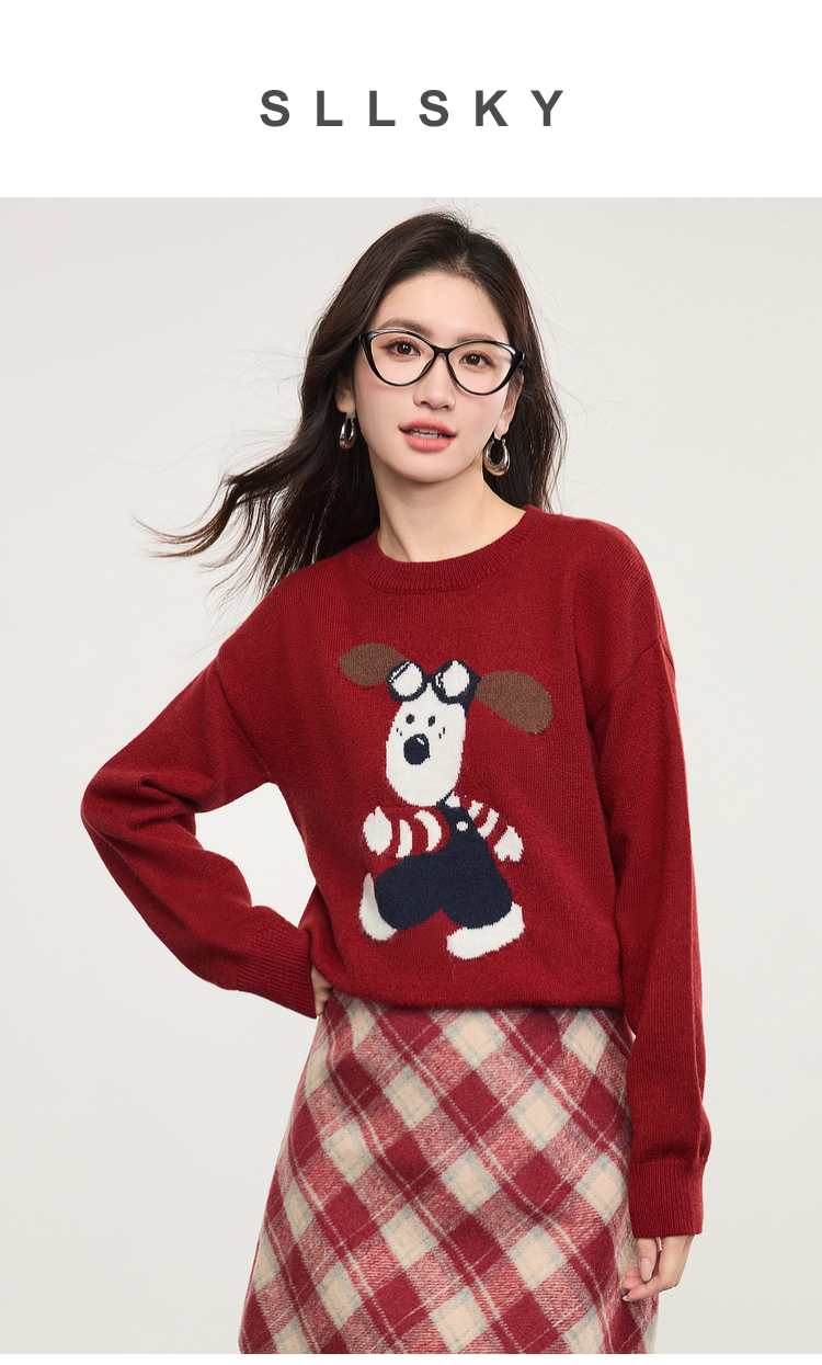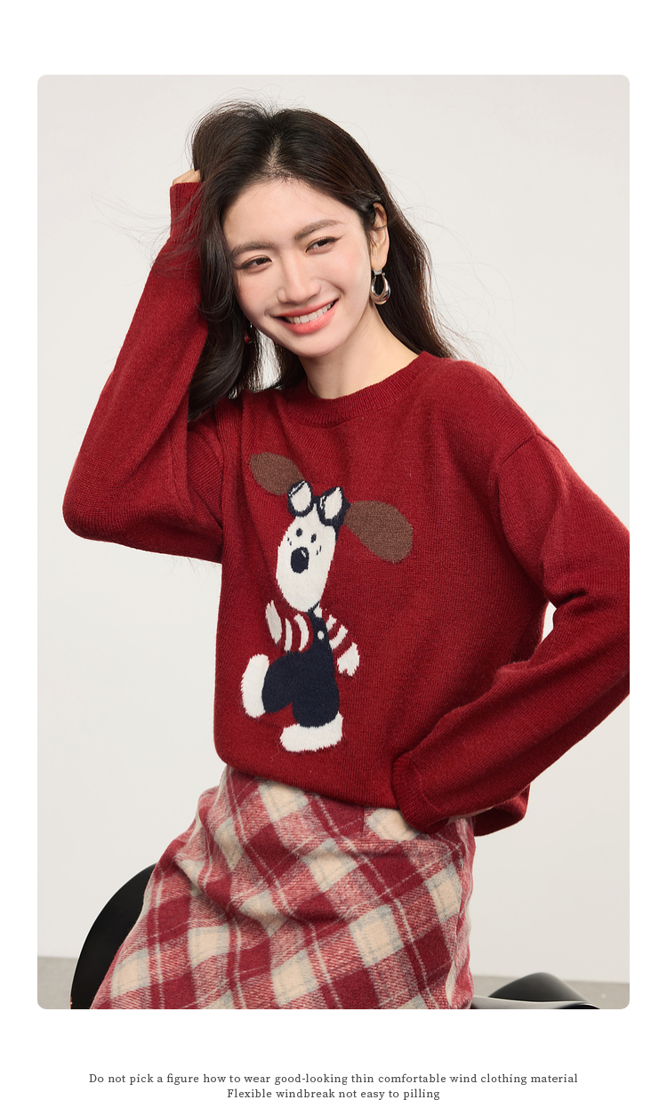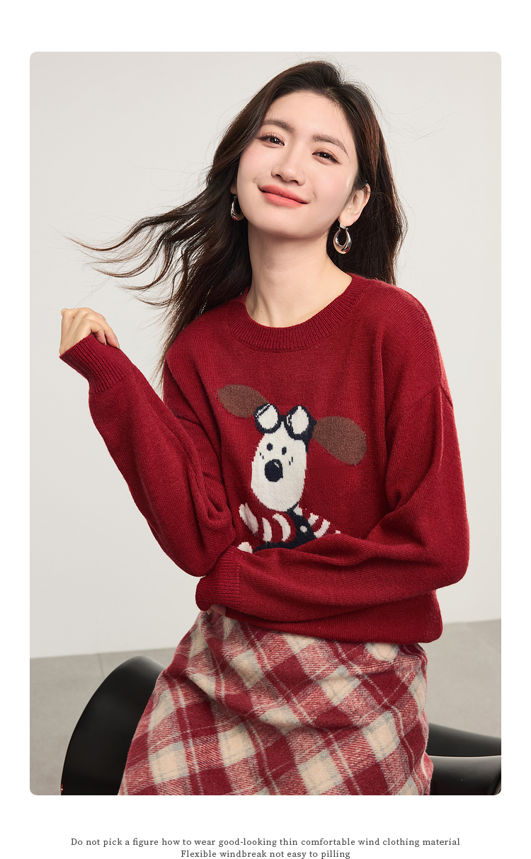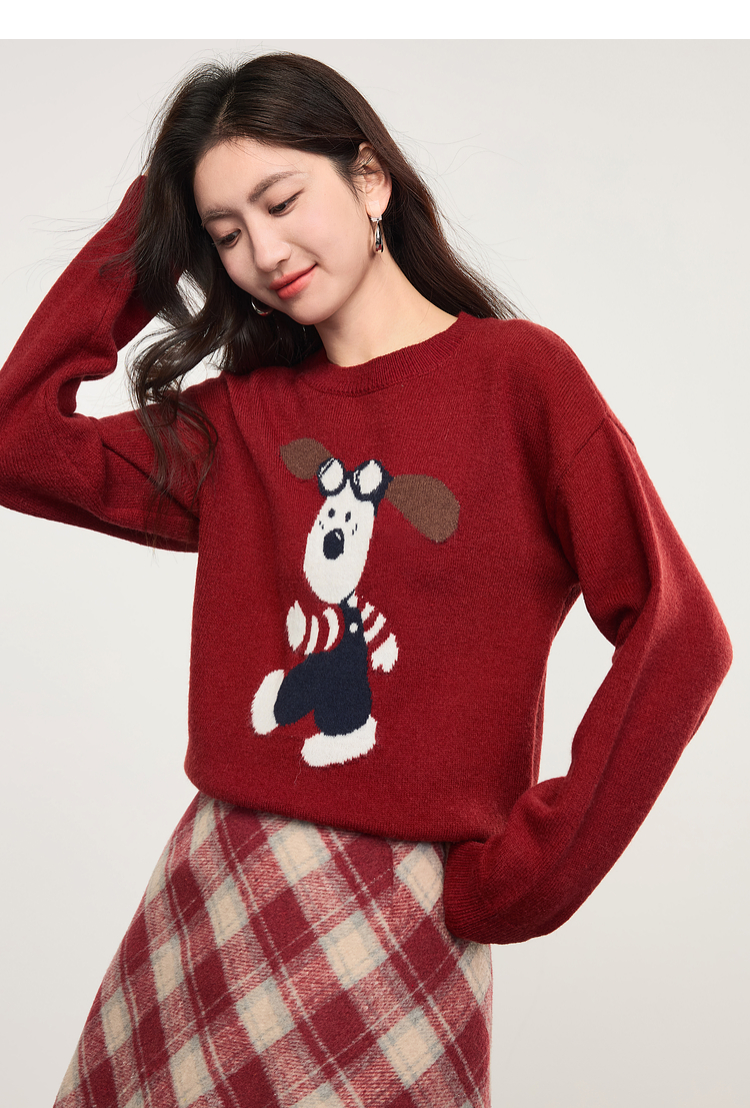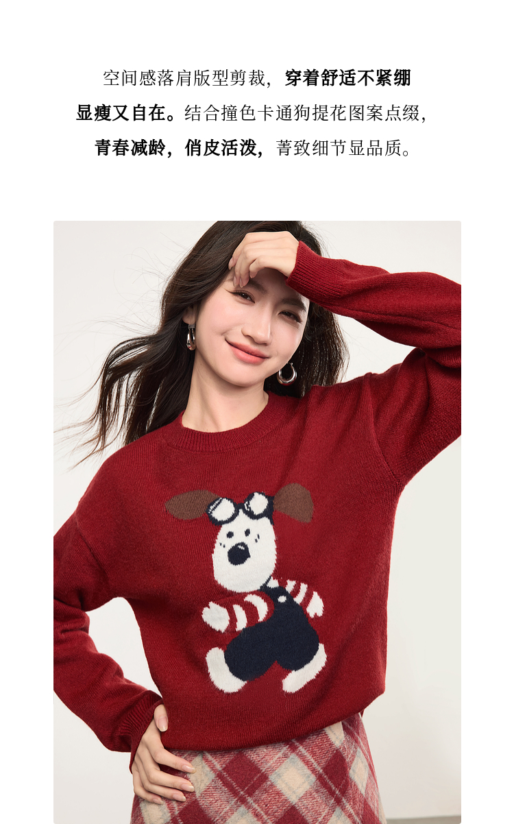 【专属特价】熙世界卡通小狗圆领毛衣2025春秋新款时尚减龄氛围感红色针织衫