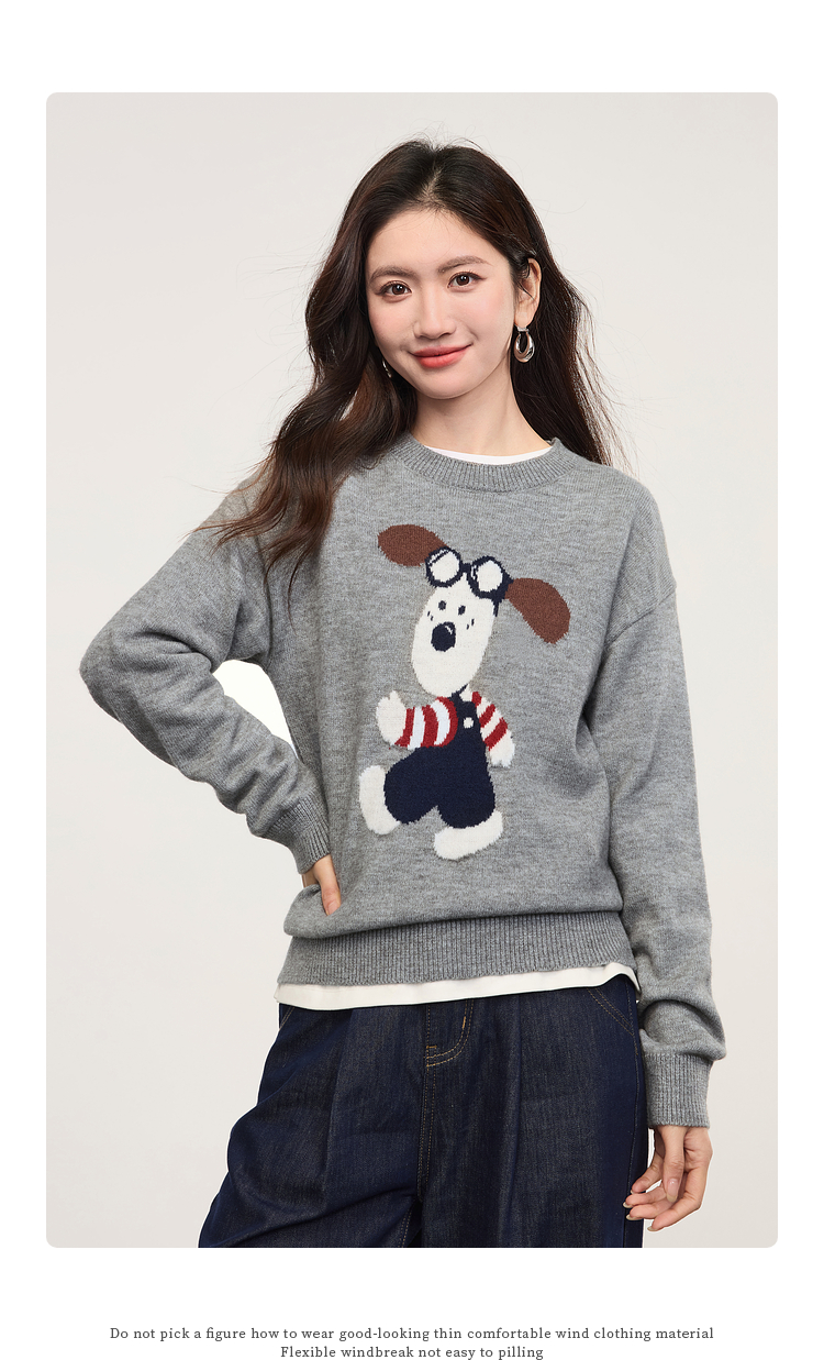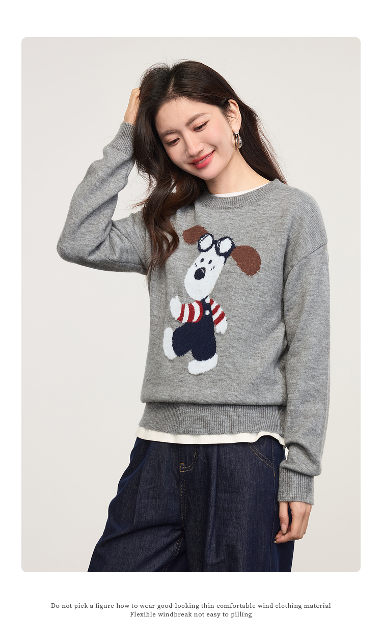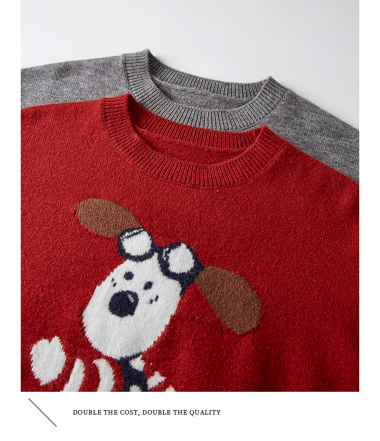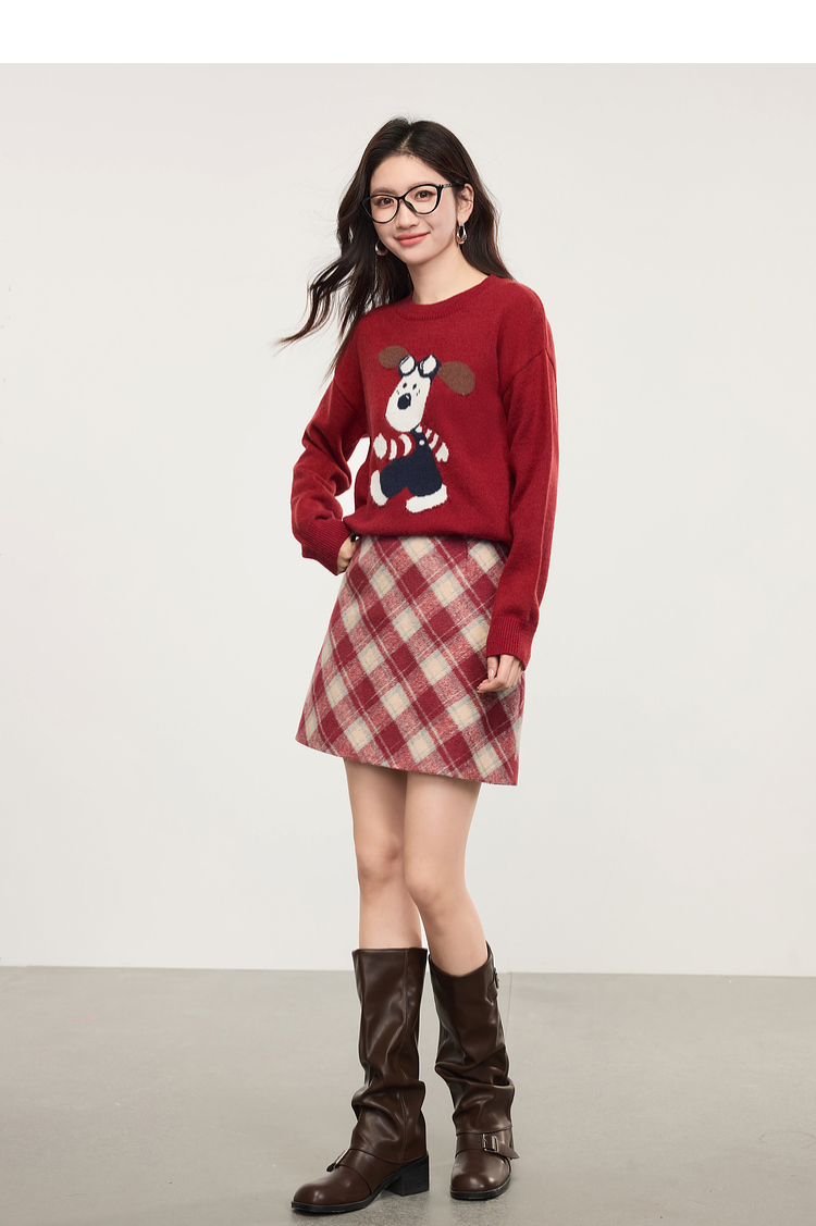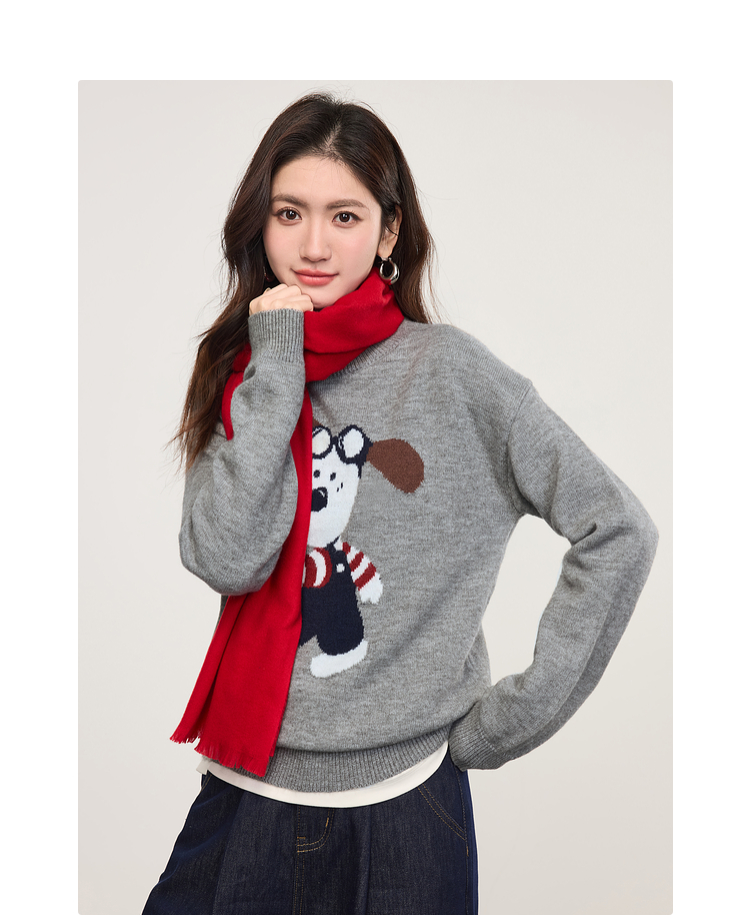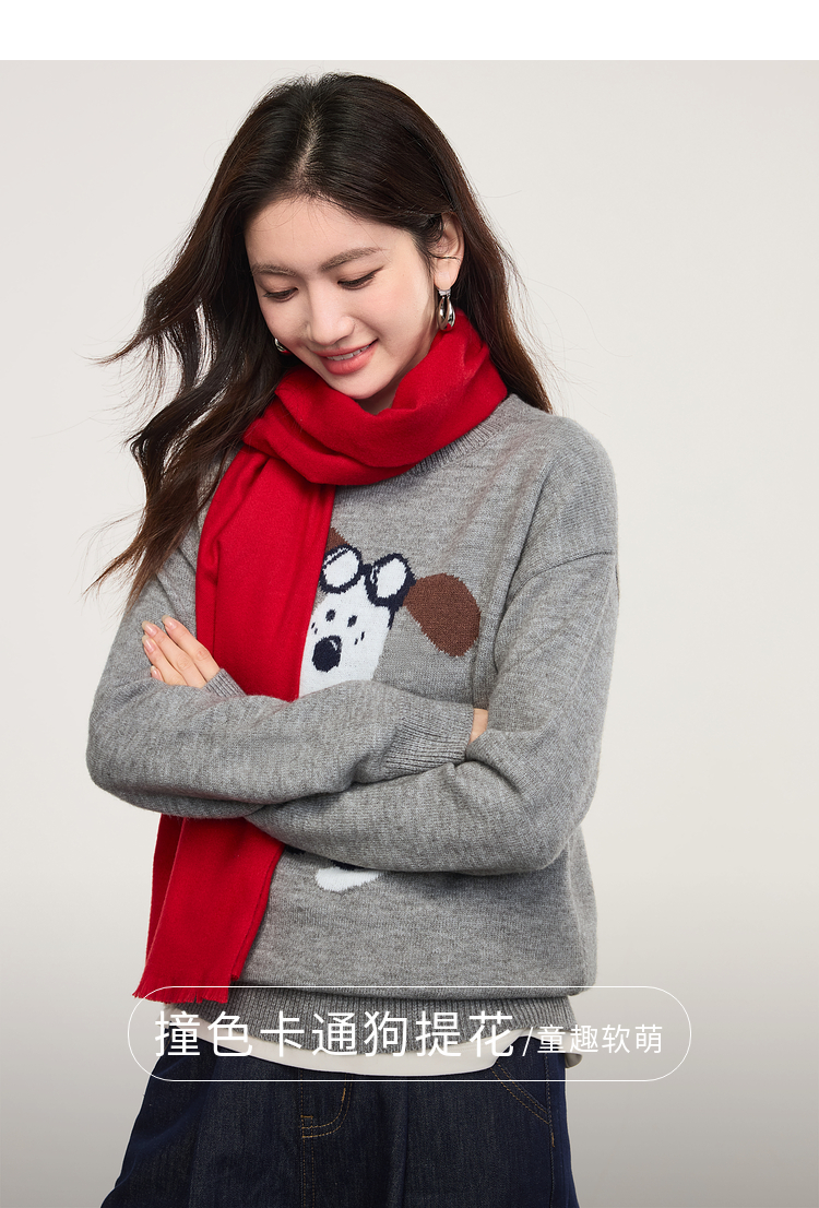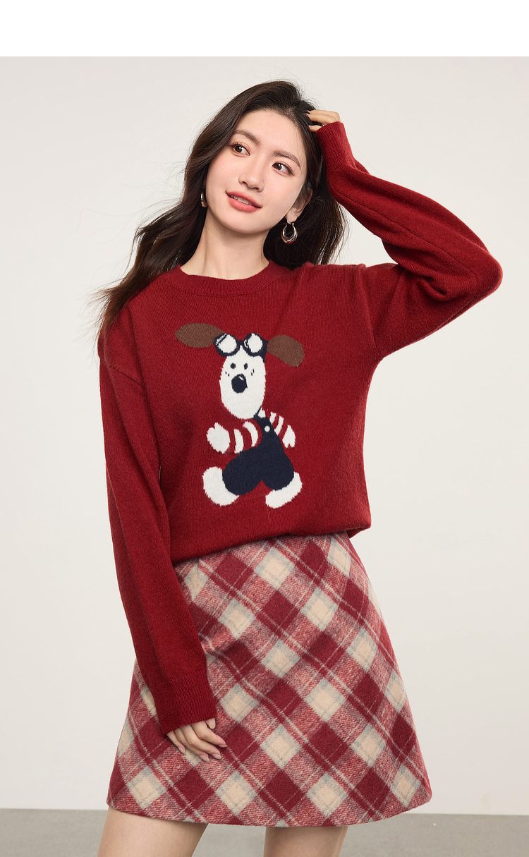 【专属特价】熙世界卡通小狗圆领毛衣2025春秋新款时尚减龄氛围感红色针织衫