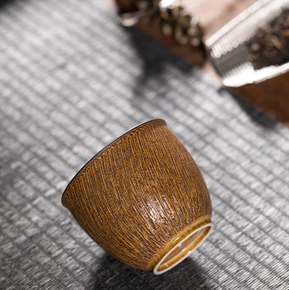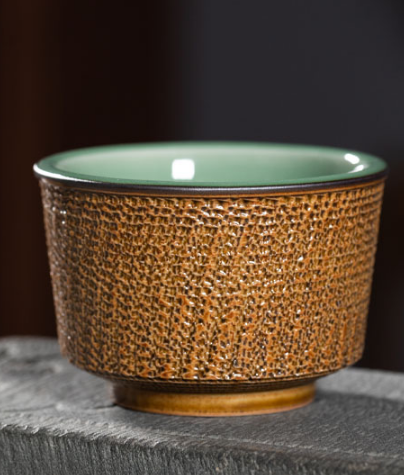 直筒杯型,线条简洁流畅,垂直的杯壁给人端庄稳重之感。跳刀工艺形成的纹理在直筒杯身上有序分布,或疏或密,配合灰釉古朴色调,更显沉稳内敛。