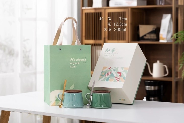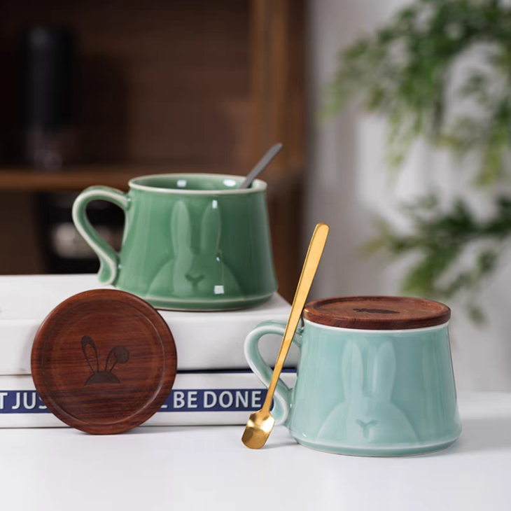 这款“前兔似锦”对杯包含两只杯子,一只为粉青色,一只为梅子青色。杯子容量为300ml,大小适宜,满足日常饮品盛装需求,配套有两只金属搅拌勺和两个木质杯盖,木质杯盖上有兔子图案。