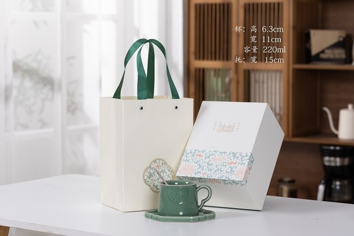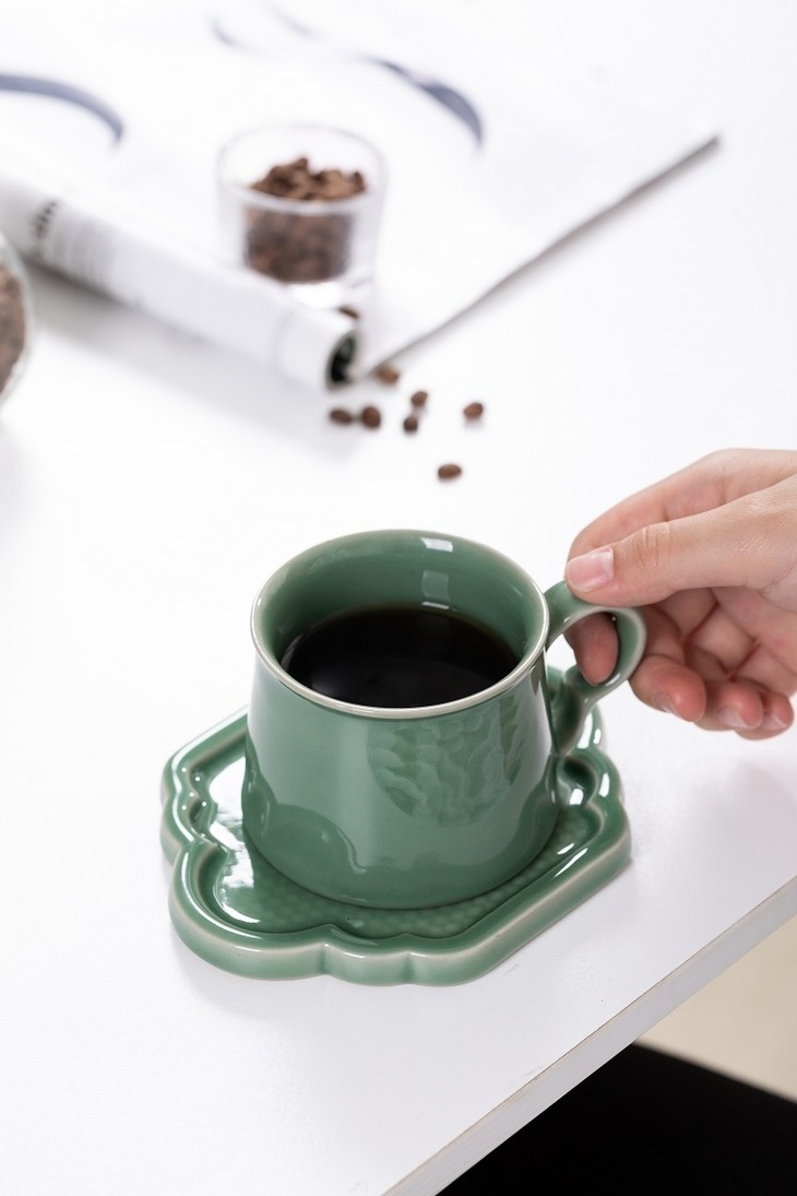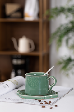 这款景秀茶咖杯的主体呈清新雅致的绿色,这给人自然、宁静之感,与茶、咖的休闲氛围契合。