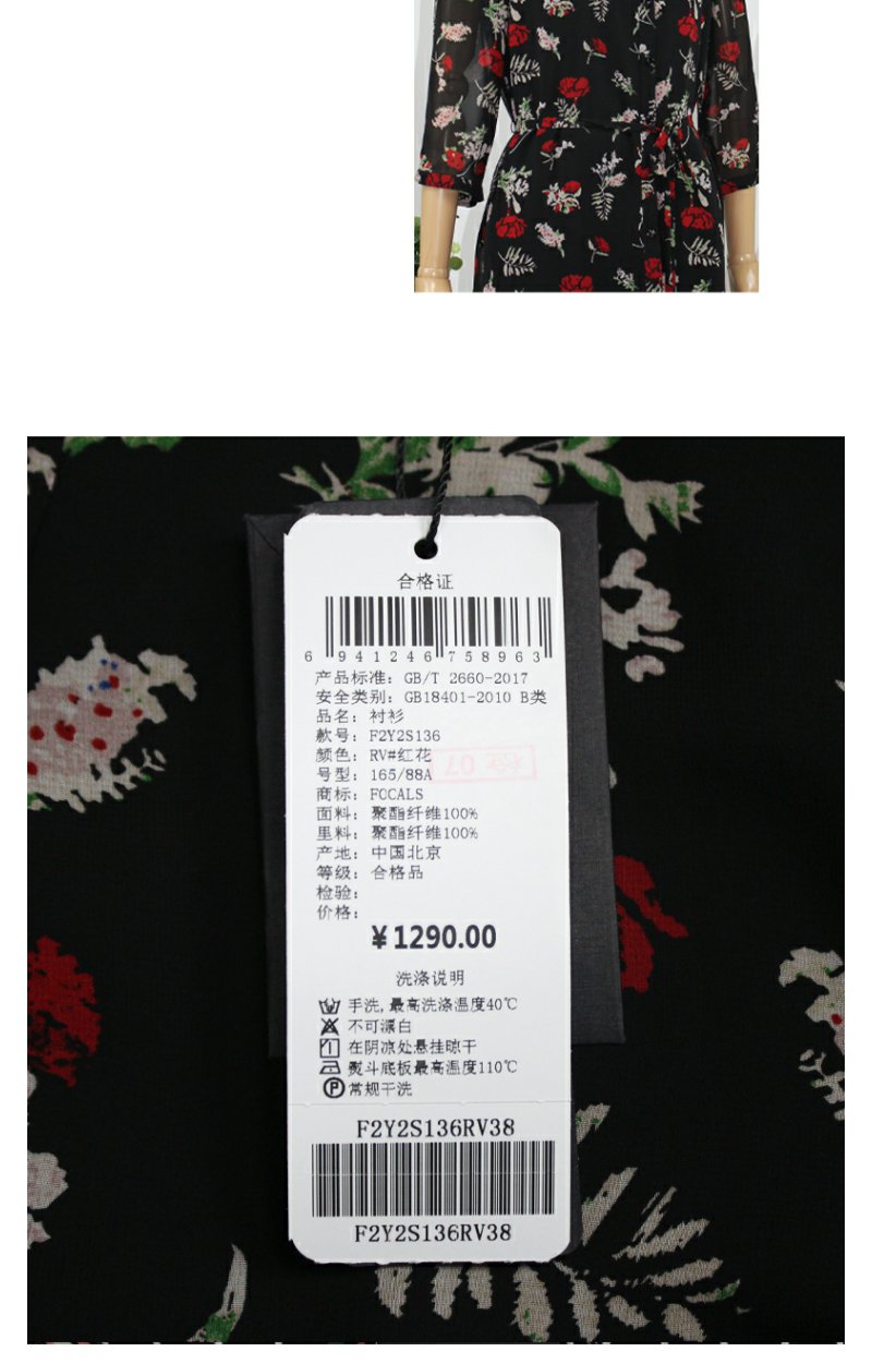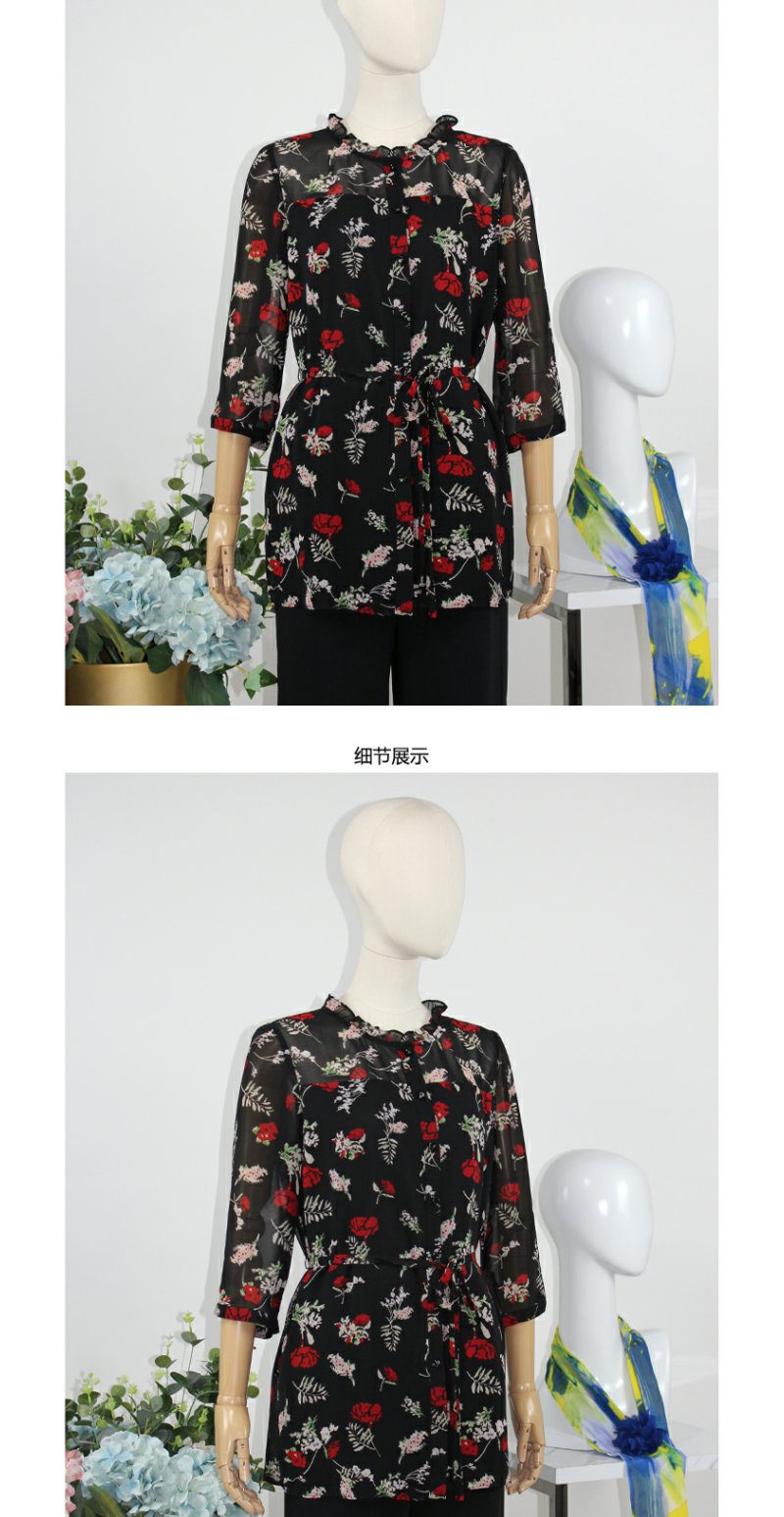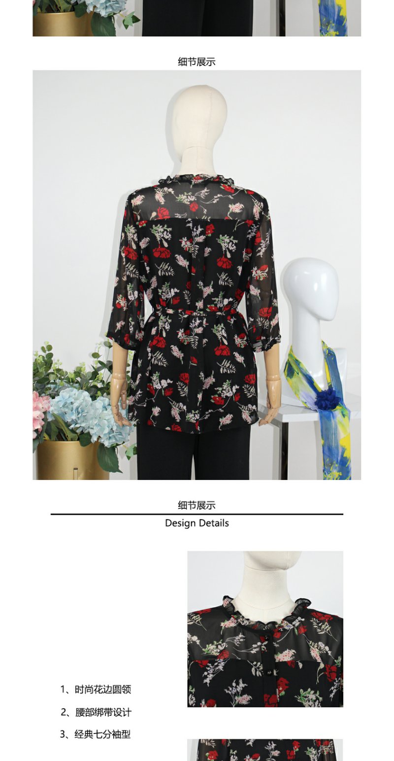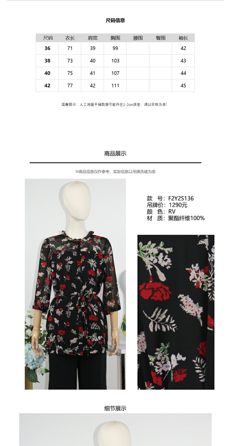 FOCALS福柯斯女装春秋款圆领套头七分袖雪纺印花衬衫F2Y2S136RV