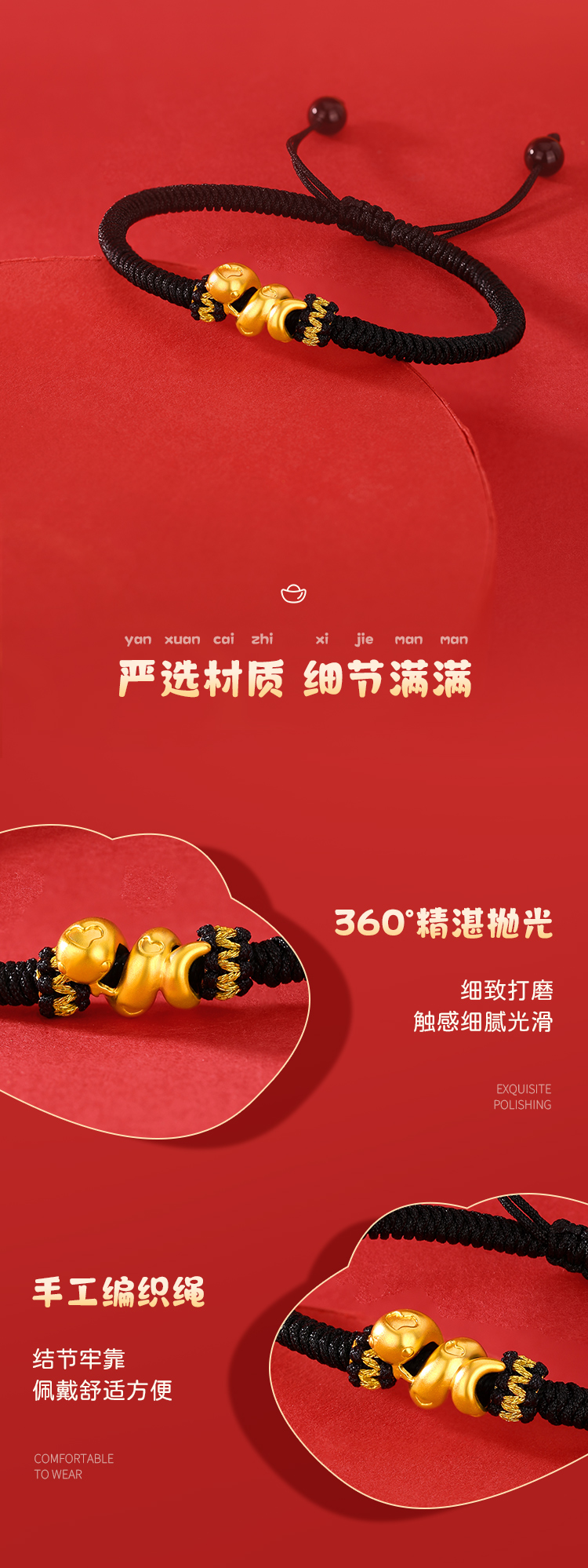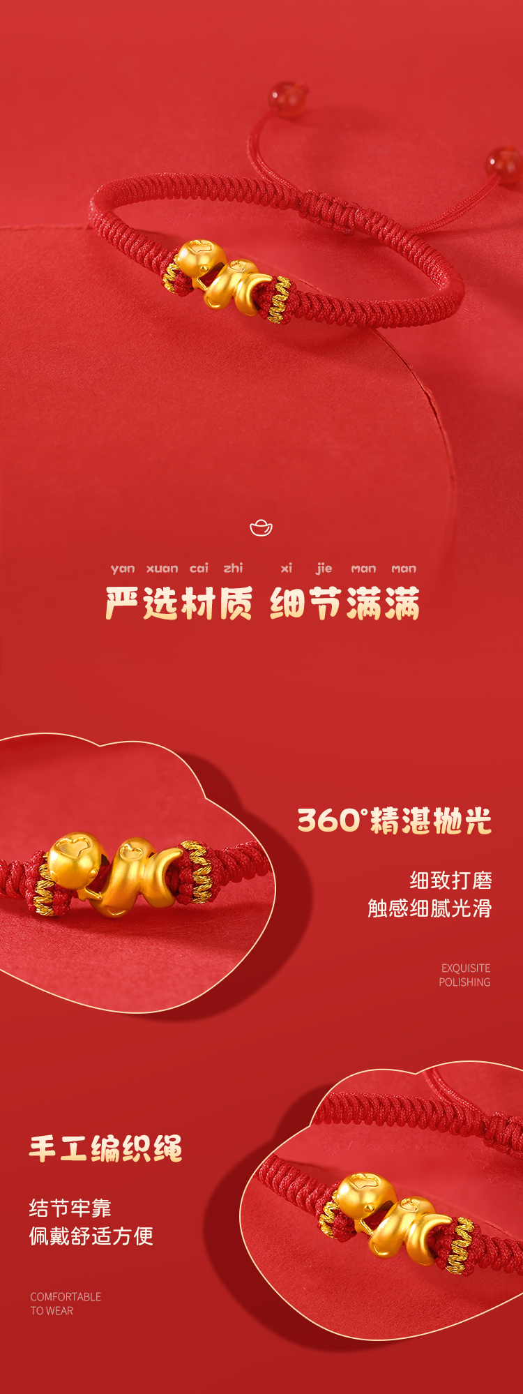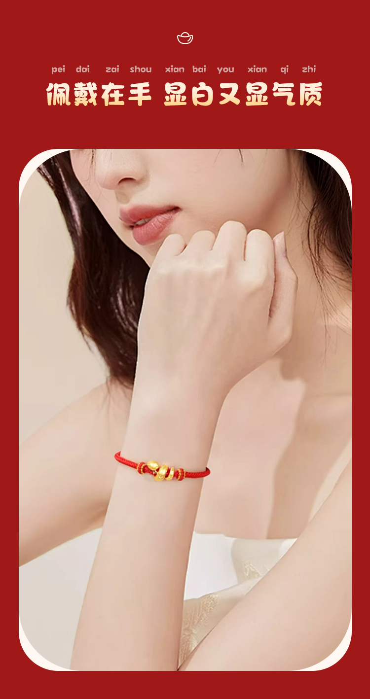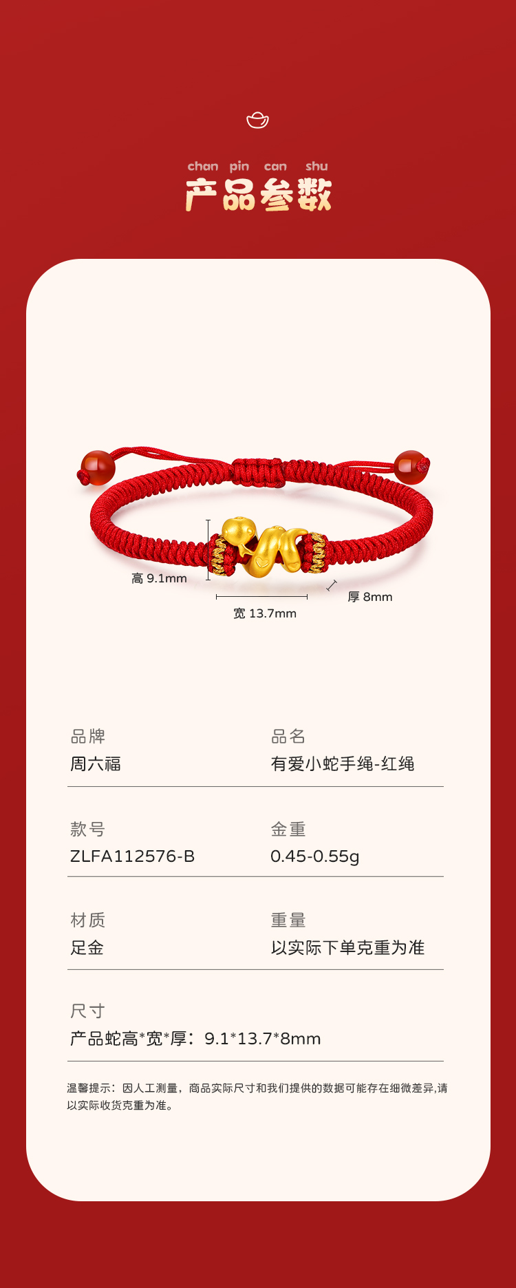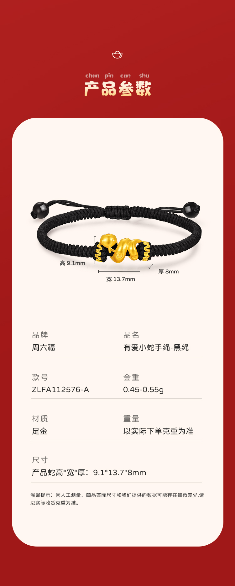 周六福足金有爱小蛇手绳-红绳(黑绳)ZLFA112576★