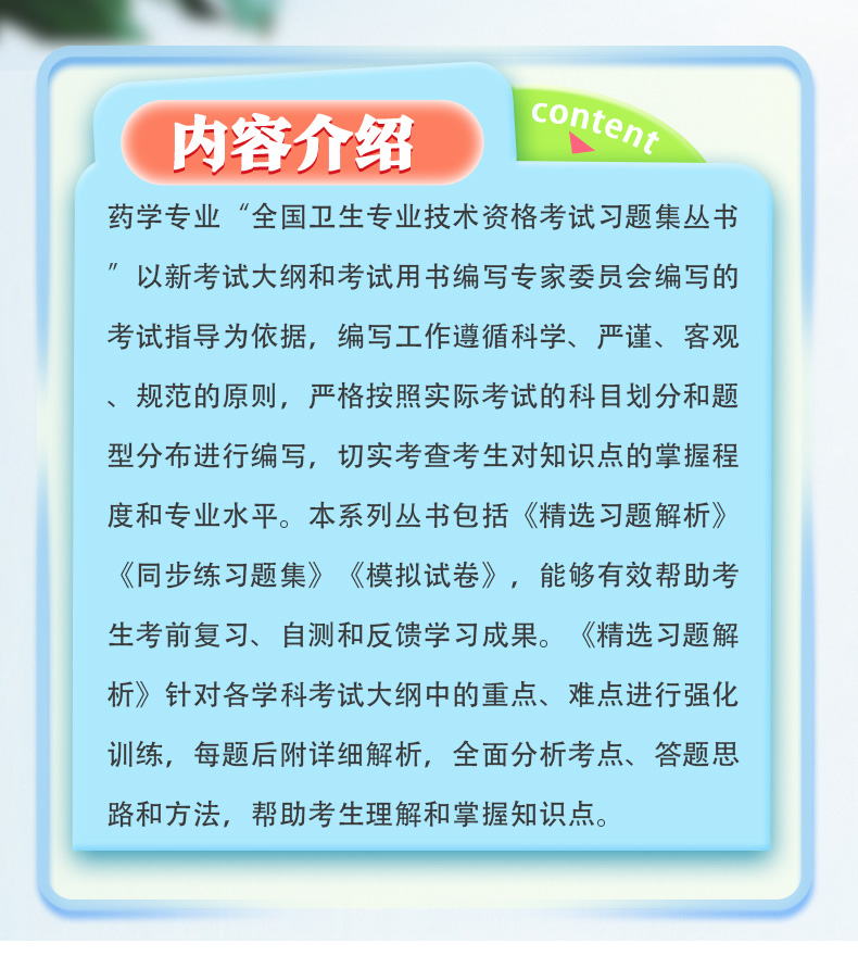 药学专业“全国卫生专业技术资格考试习题集丛书”以新考试大纲和考试用书编写专家委员会编写的考试指导为依据,编写工作遵循科学、严谨、客观、规范的原则,严格按照实际考试的科目划分和题型分布进行编写,切实考查考生对知识点的掌握程度和专业水平。本系列丛书包括《精选习题解析》《同步练习题集》《模拟试卷》,能够有效帮助考生考前复习、自测和反馈学习成果。《精选习题解析》针对各学科考试大纲中的重点、难点进行强化训练,每题后附详细解析,全面分析考点、答题思路和方法,帮助考生理解和掌握知识点。