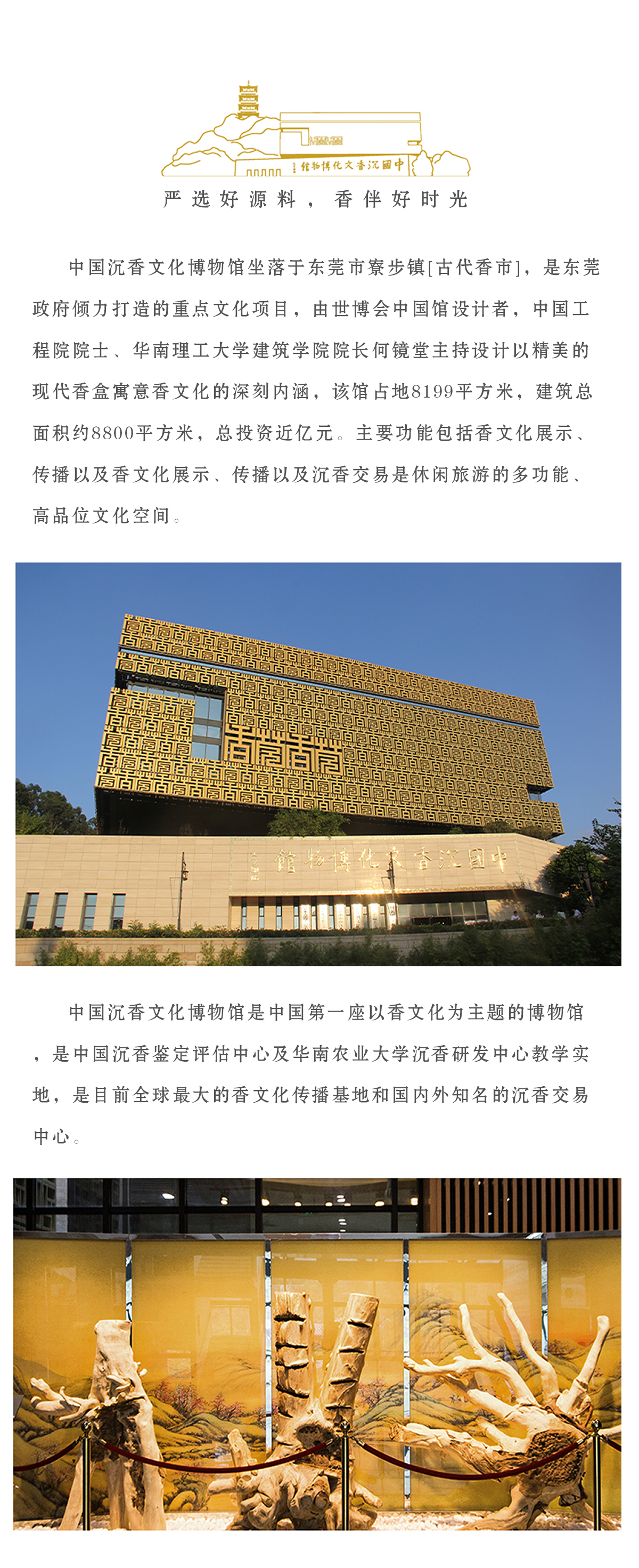 中国沉香文化博物馆坐落于古代[香市]东莞市寮步镇,是东莞政府倾力打造的重点文化项目,由世博会中国馆设计者,中国工程院院士、华南理工大学建筑学院院长何镜堂主持设计,以精美的现代[香盒]寓意香文化的深刻内