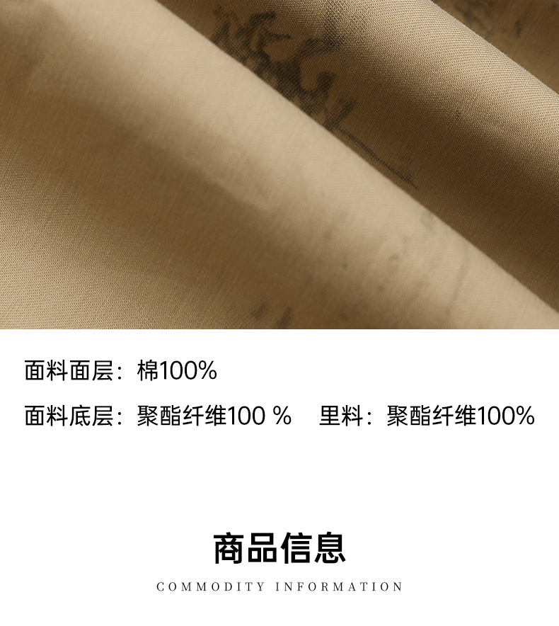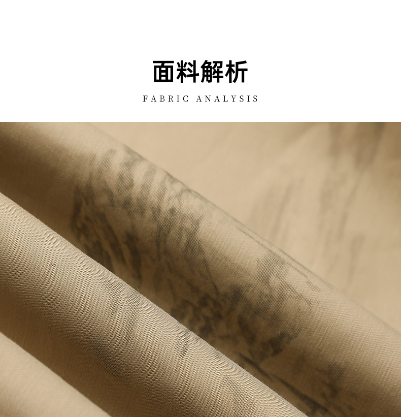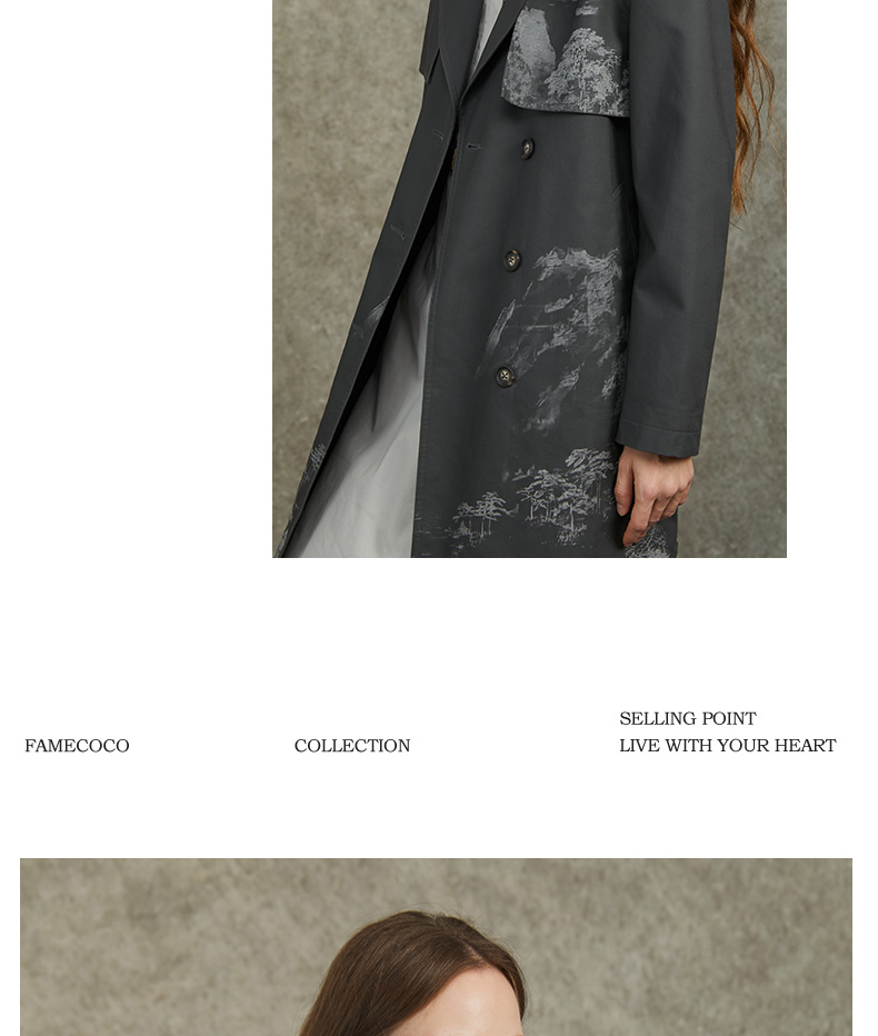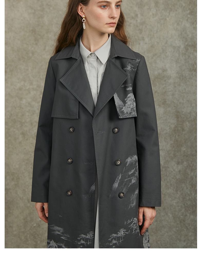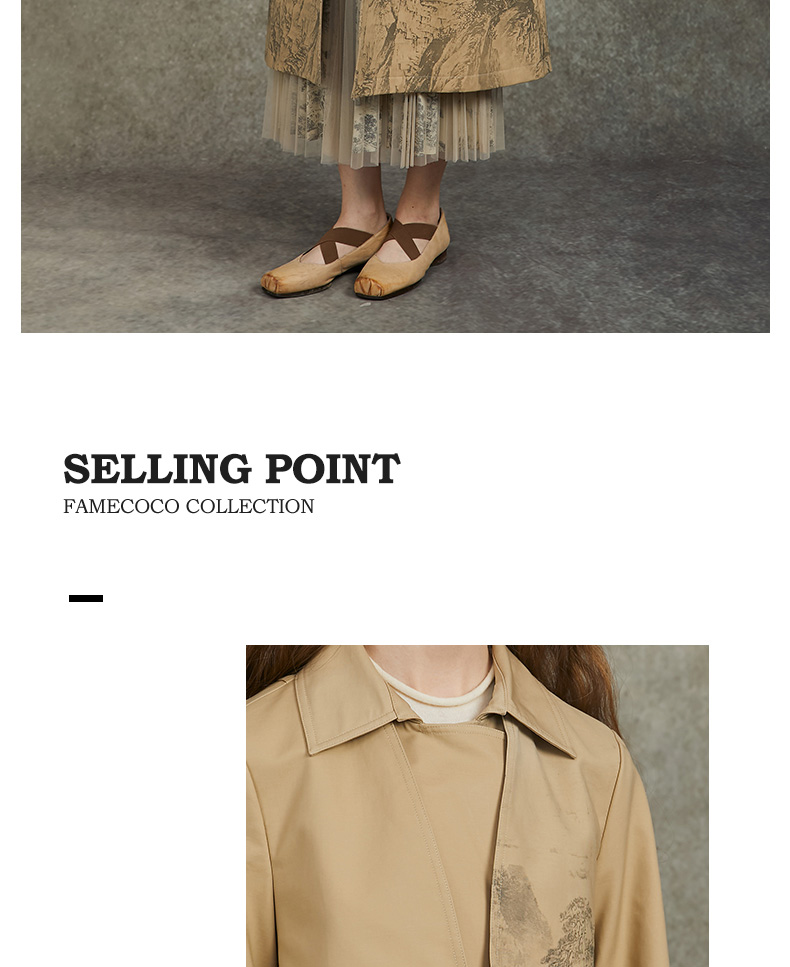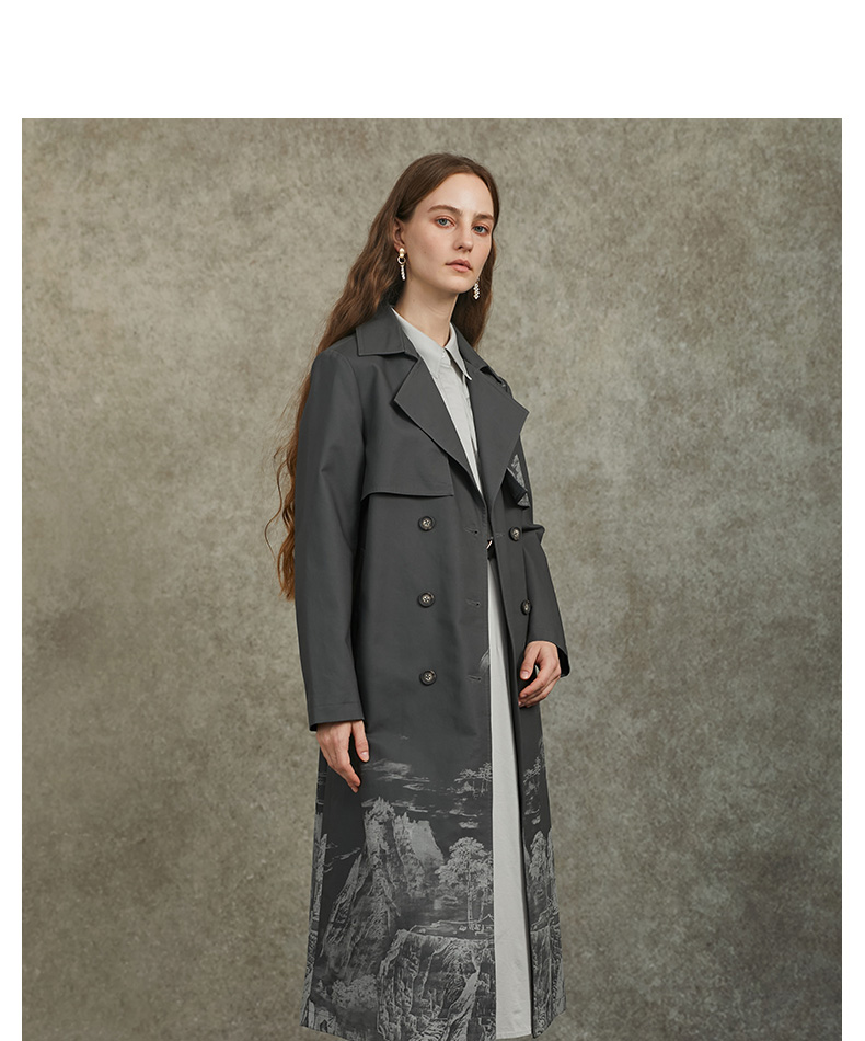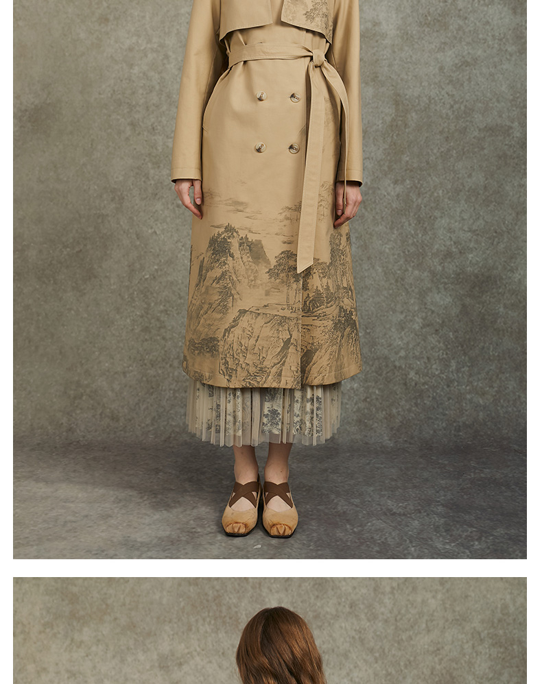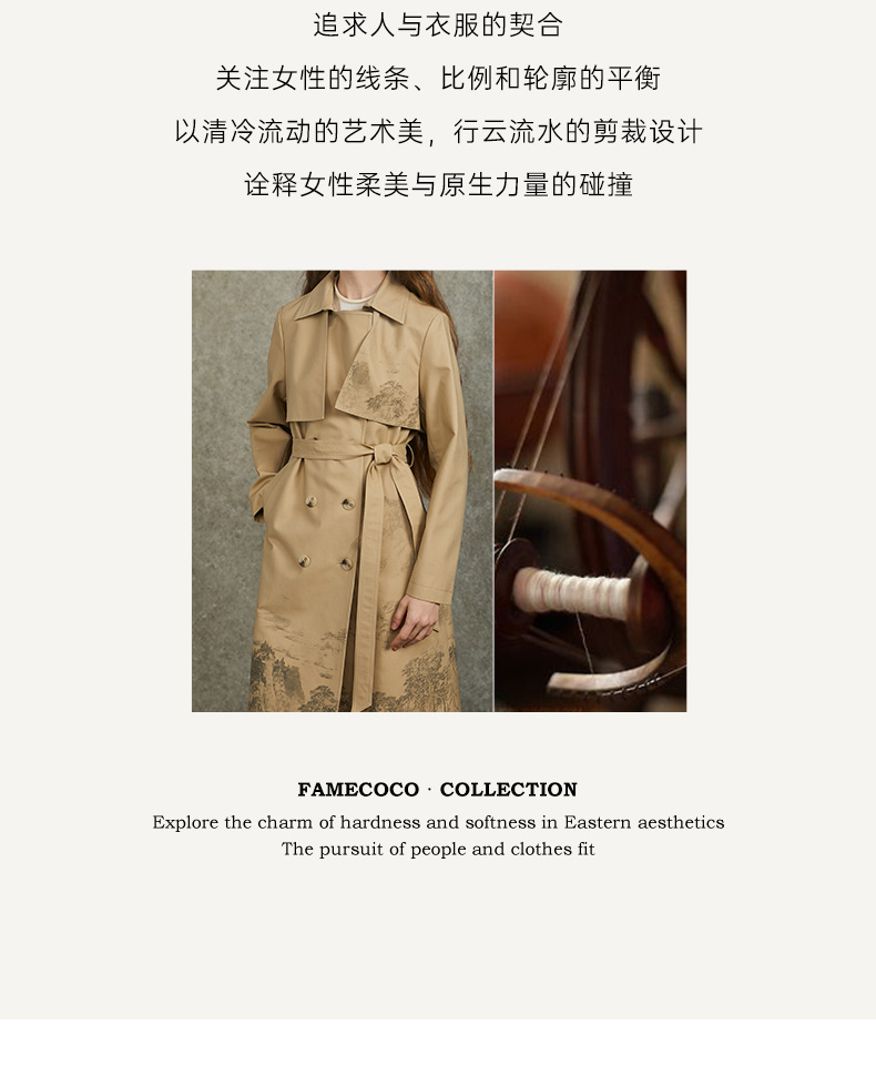 Famecoco范可儿戗驳领收腰系带长款风衣气质山水印花FAC6AT004