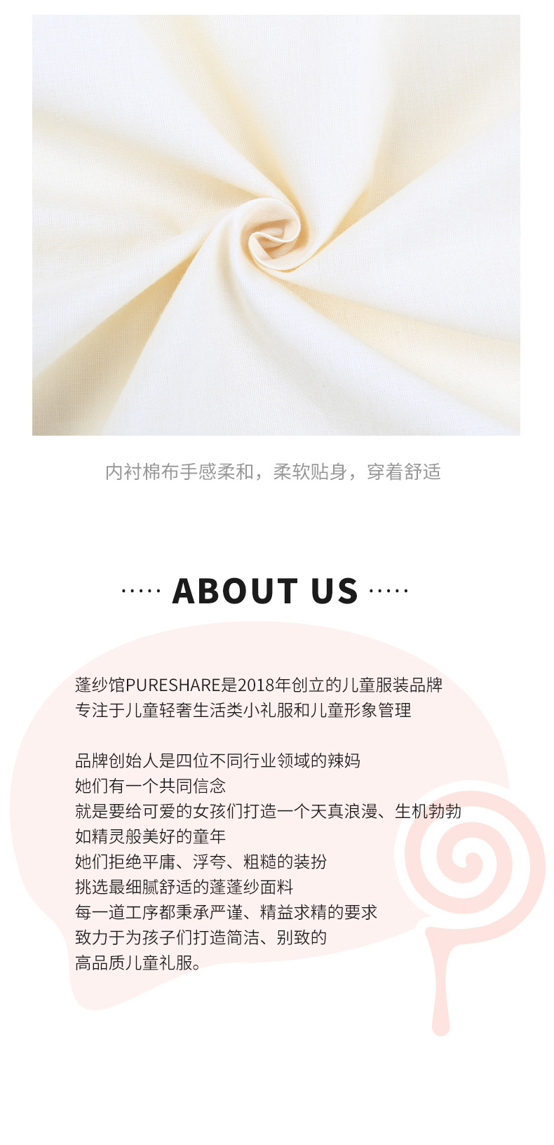 PureShare蓬纱馆,2018年创立的儿童服装品牌,专注于儿童轻奢生活类小礼服,主张“让孩子做最独特的自己”的品牌理念,为孩子们提供时尚简洁、优雅而又不失童真的生活类礼服。