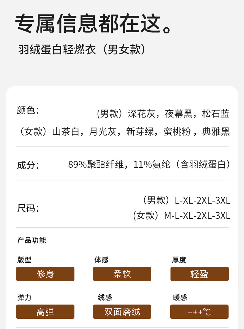 面料:89%聚酯纤维,11%氨纶(含羽绒蛋白)