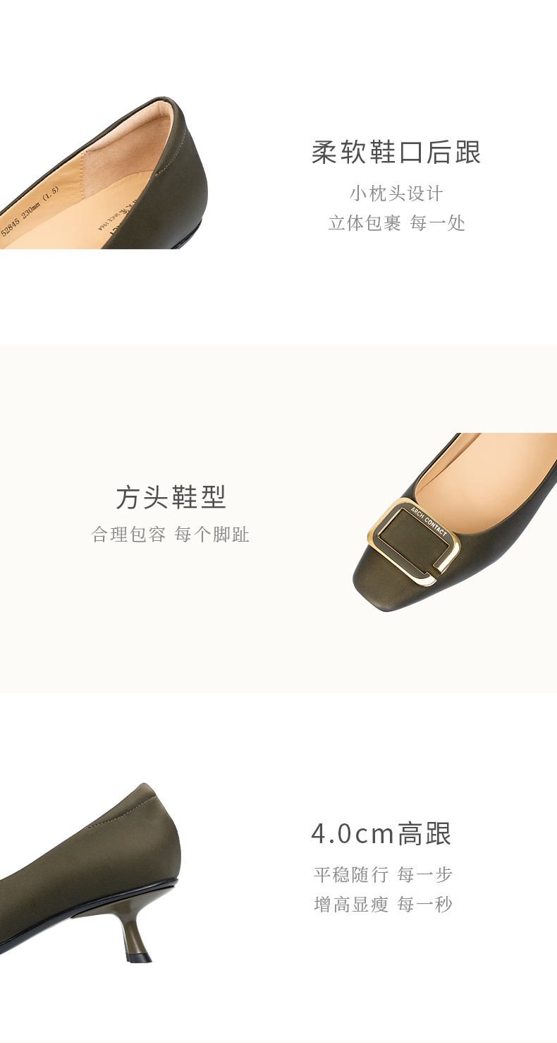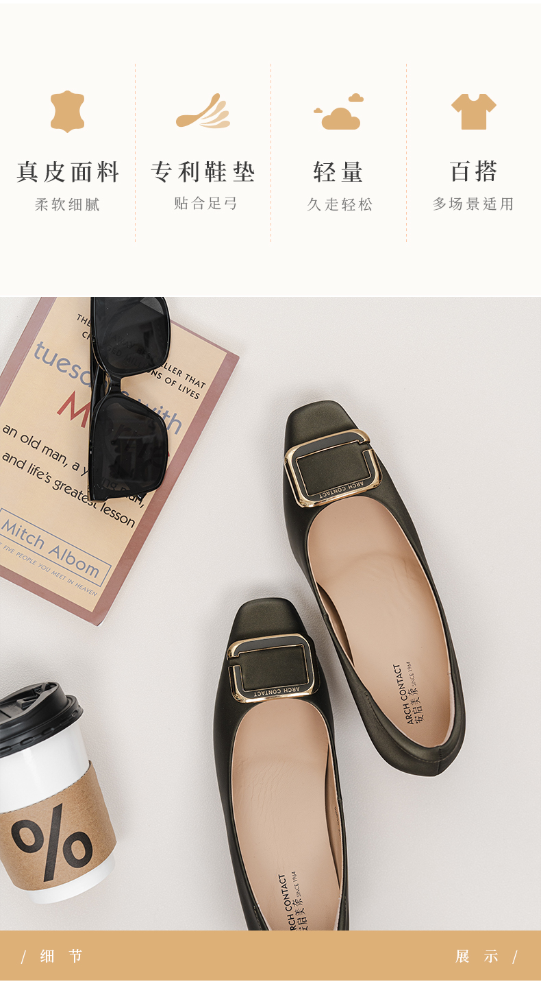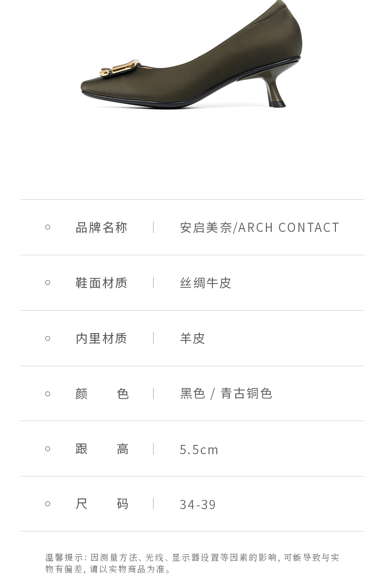 ARCH CONTACT安启美奈方头饰扣浅口优雅丝绸皮单鞋