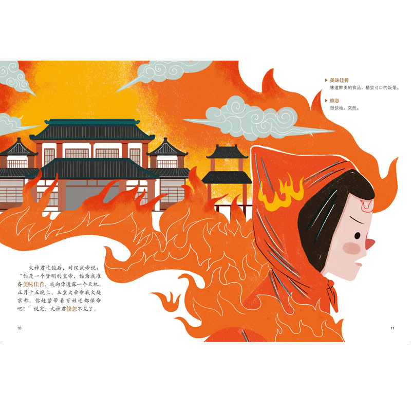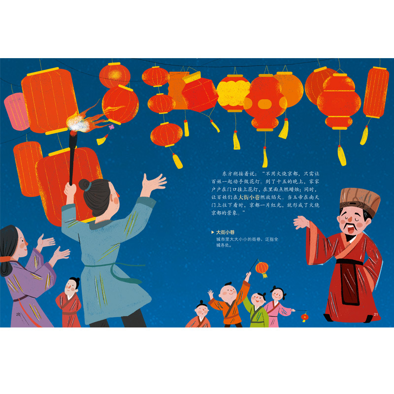 汉武帝夜梦火神君,得知在正月十五的晚上,火神君将奉玉皇大帝之命火烧京都。汉武帝如临大敌、忧虑成疾。大臣东方朔献上“以假乱真”的妙计,最终让京都百姓免遭此劫。从此民间便有了正月十五吃元宵、赏花灯的习俗,这一天后来被称为元宵节。