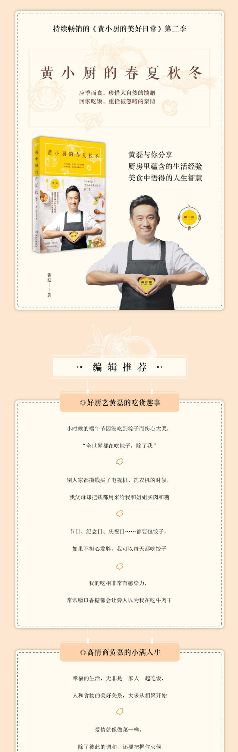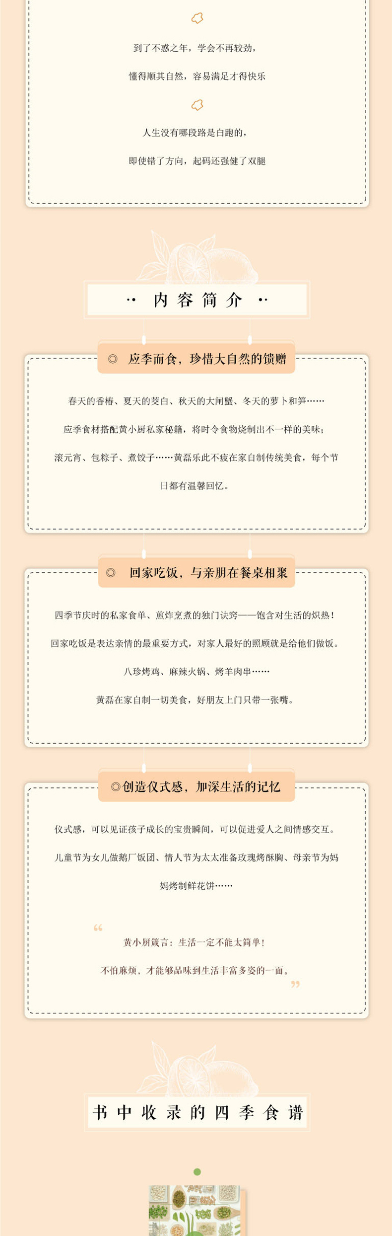人世间,千般情感皆有温度,万种食材亦有性格。一食一味,一餐一情,黄小厨带读者们一起,在春夏秋冬的四季流转中,寻找食材、制作美食、讲述和美食有关的暖心回忆和往日故事。全书分为四部分,在每个季节的篇章中,黄磊回顾了不同节气、节日中自己家庭以及童年、少年时的美食记忆,分享这些食物的独家烹制方法和一些料理小窍门,讲述这些食物留给自己的丰富的味觉记忆和情感往事。这是一本由美食串连起的散文集,在应季而食的理念中,感受气候的变化,感受时间的流逝,感受平凡生活中的微小惊喜与美好,传递爱就是和家人一起吃饭的朴素理念。