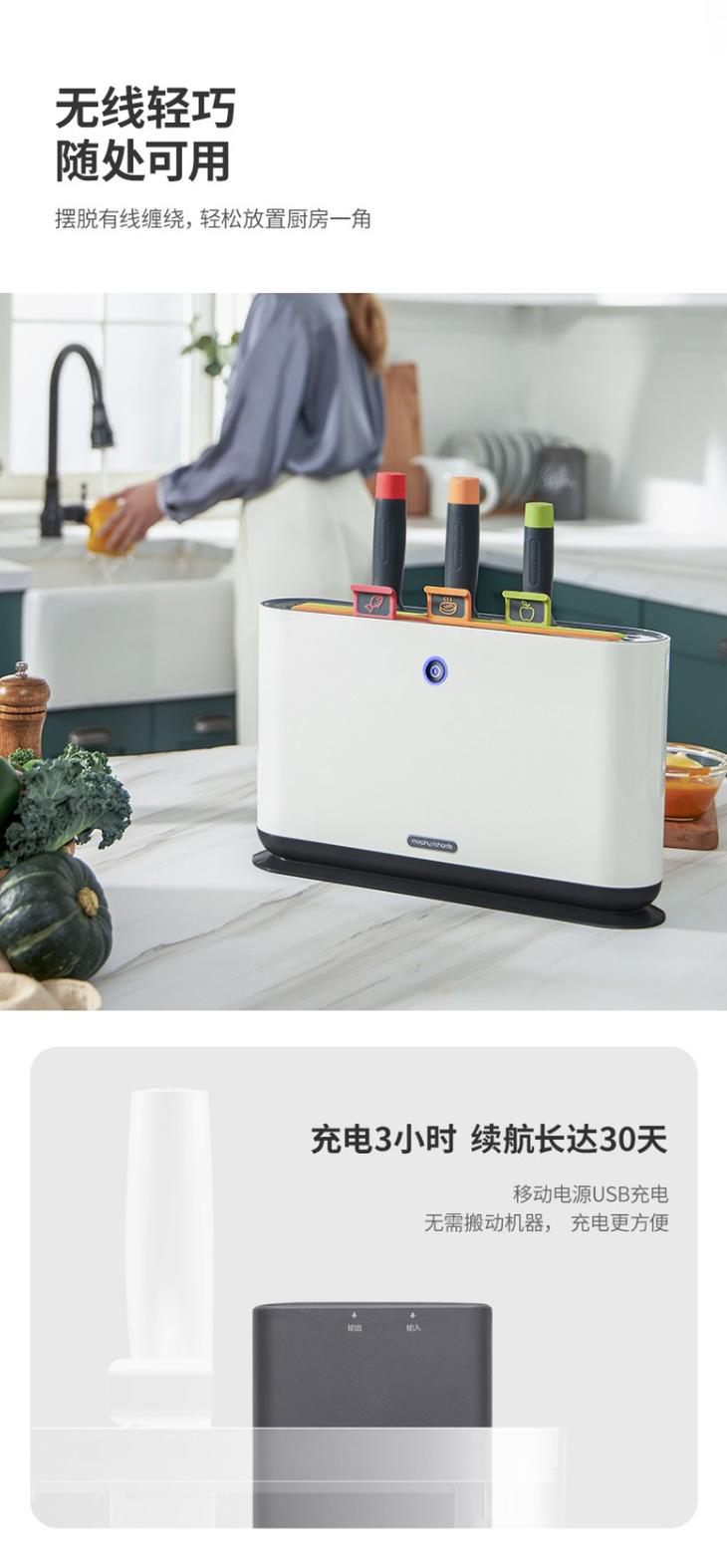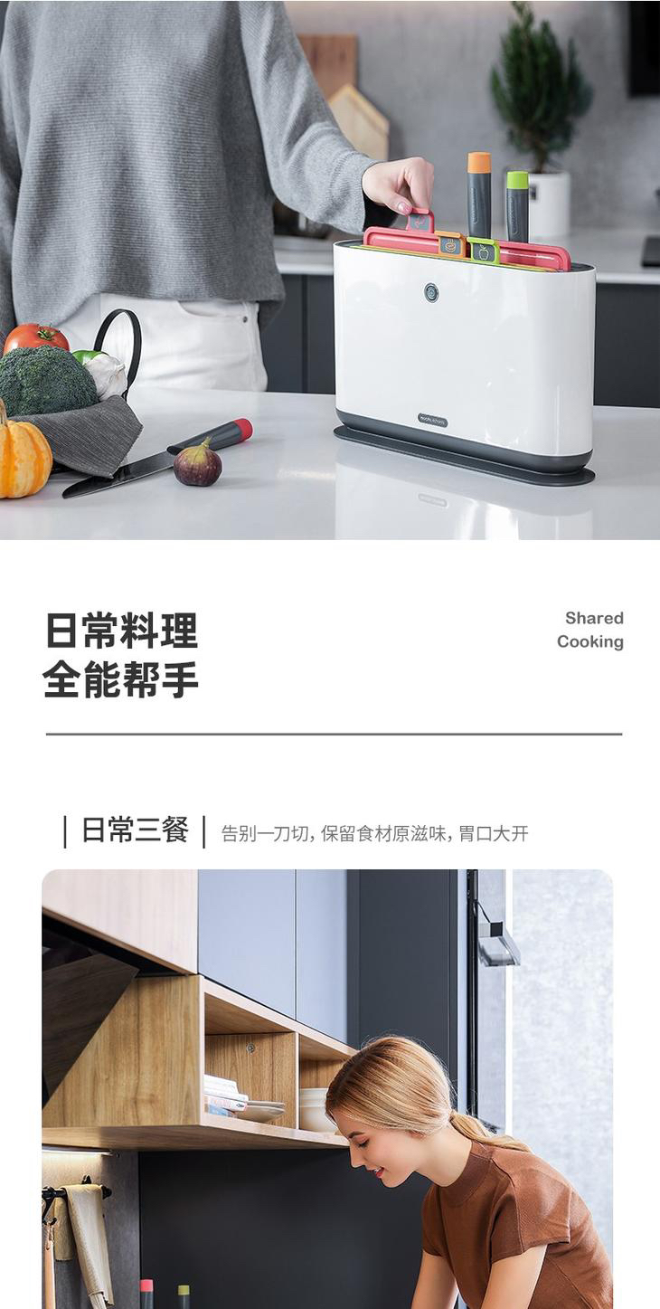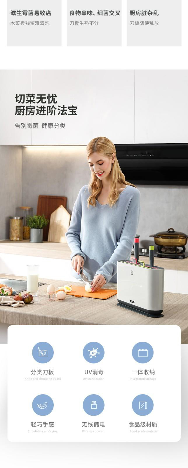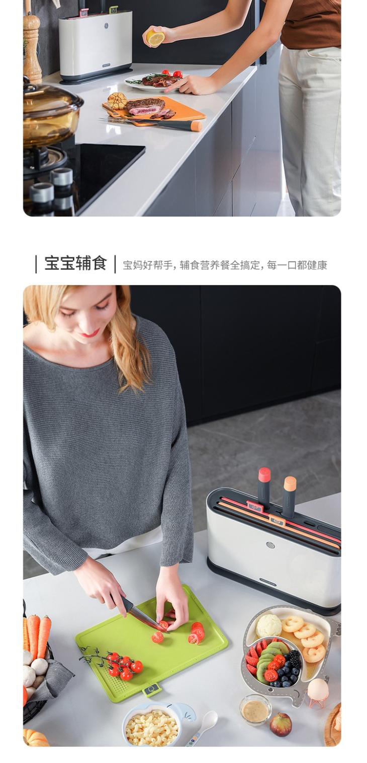 颜值太高了,对于有宝宝的家庭我觉得很是很需要的~^_^ 内含3块菜板+3把🔪 uv智能消毒紫外线深层抑菌、无线充电收纳,不用拉线这点我也是很满意,点赞