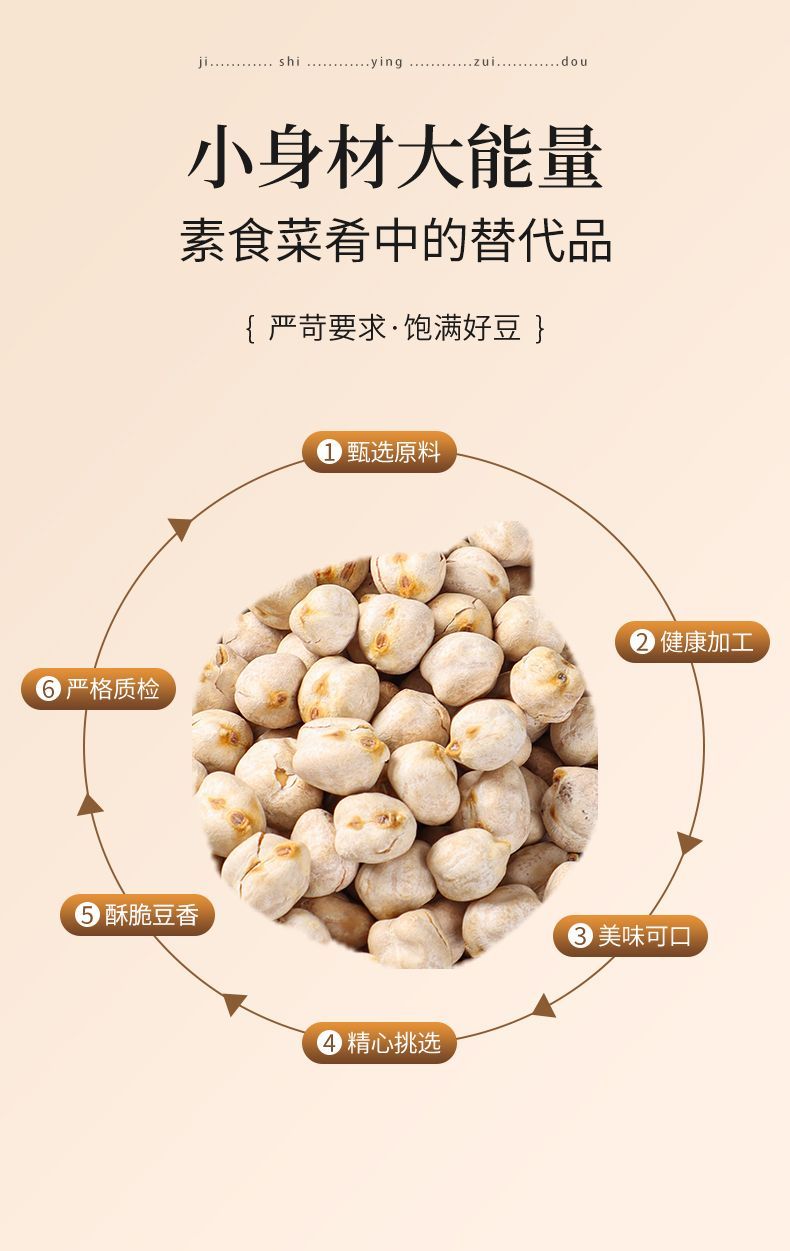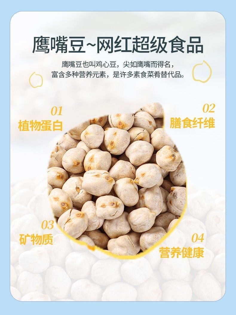 【温馨提示】:鹰嘴豆在炒制过程或运输中可能会有掉皮或碎仁现象,不影响食用。本品不宜儿童独自食用,请勿喂食婴幼儿颗粒性食物。