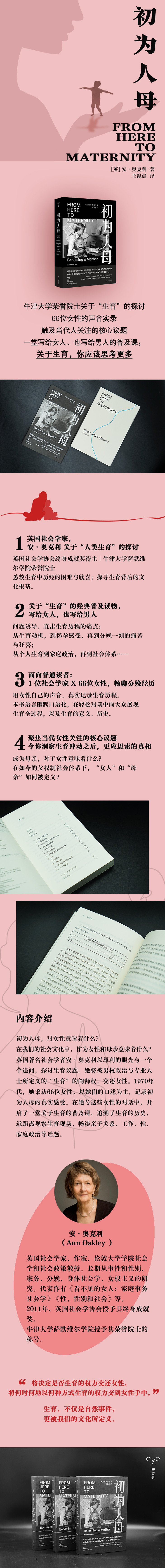 英国社会学家安·奥克利以犀利的眼光与一个个追问,探讨生育议题。她将被男权政治与专业人士所定义的“生育”的阐释权,交还女性。1970年代,她采访66位女性,以她们的口述为主,记录初为人母的真实感受。奥克利根据这些女性的真实故事,探讨:怀孕的心路历程、真实的分娩经历、产后抑郁、养育日常、家庭中的劳动分工、经验教训等。