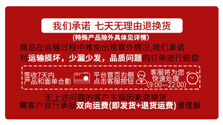【是否支持七天无理由退换货】质量问题请提供产品和快递面单合影图片,非质量问题的退换货买家需承担来回运费,且不影响二次销售。